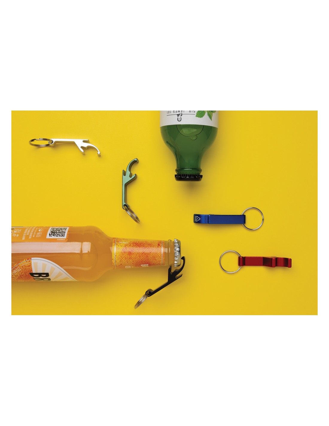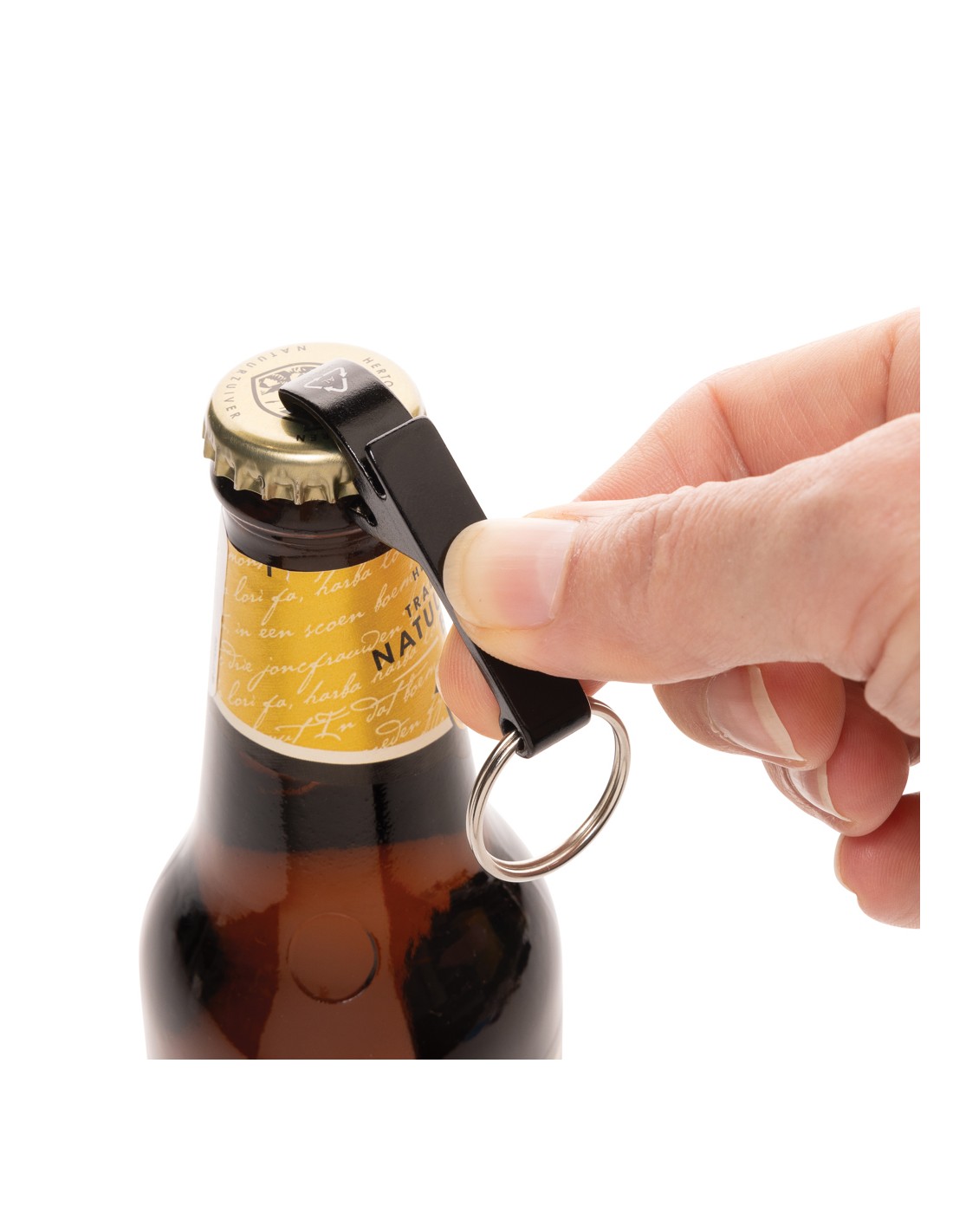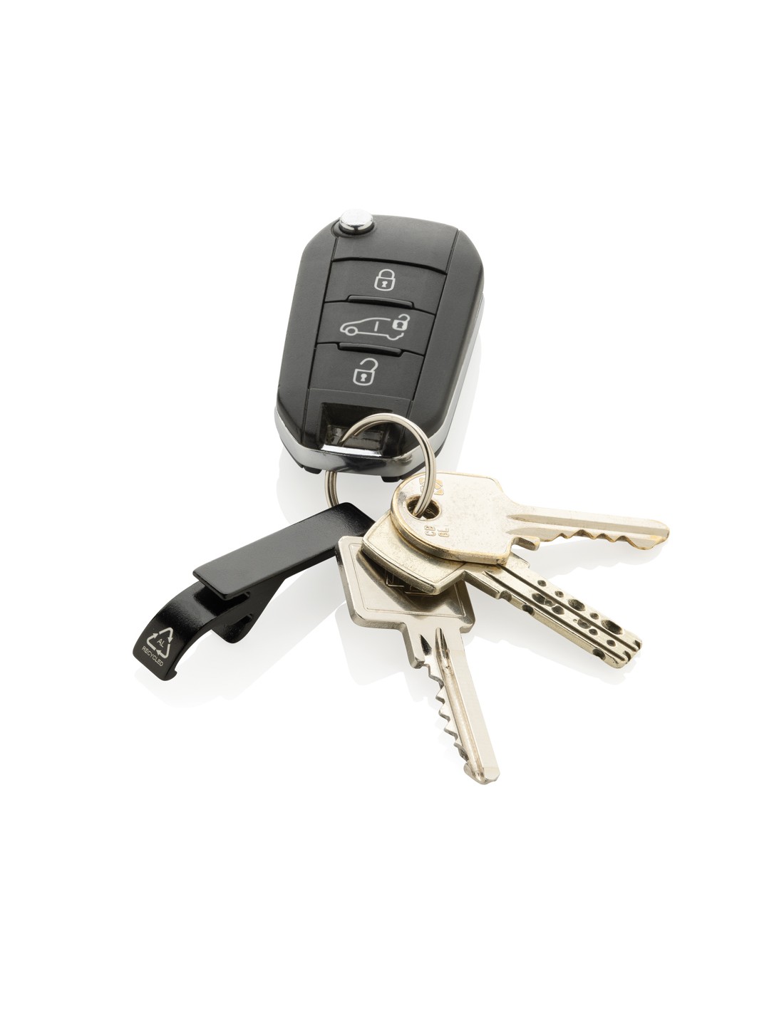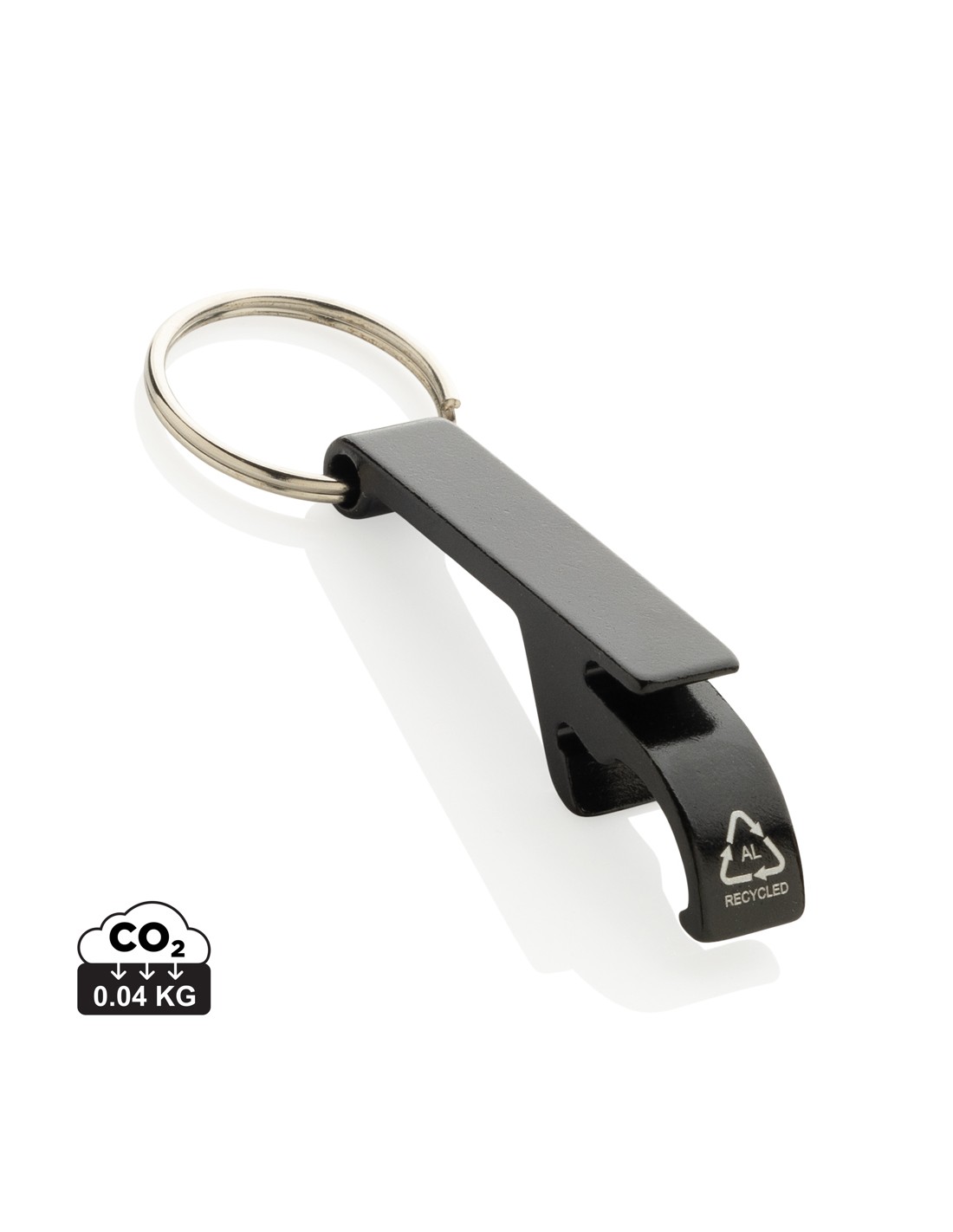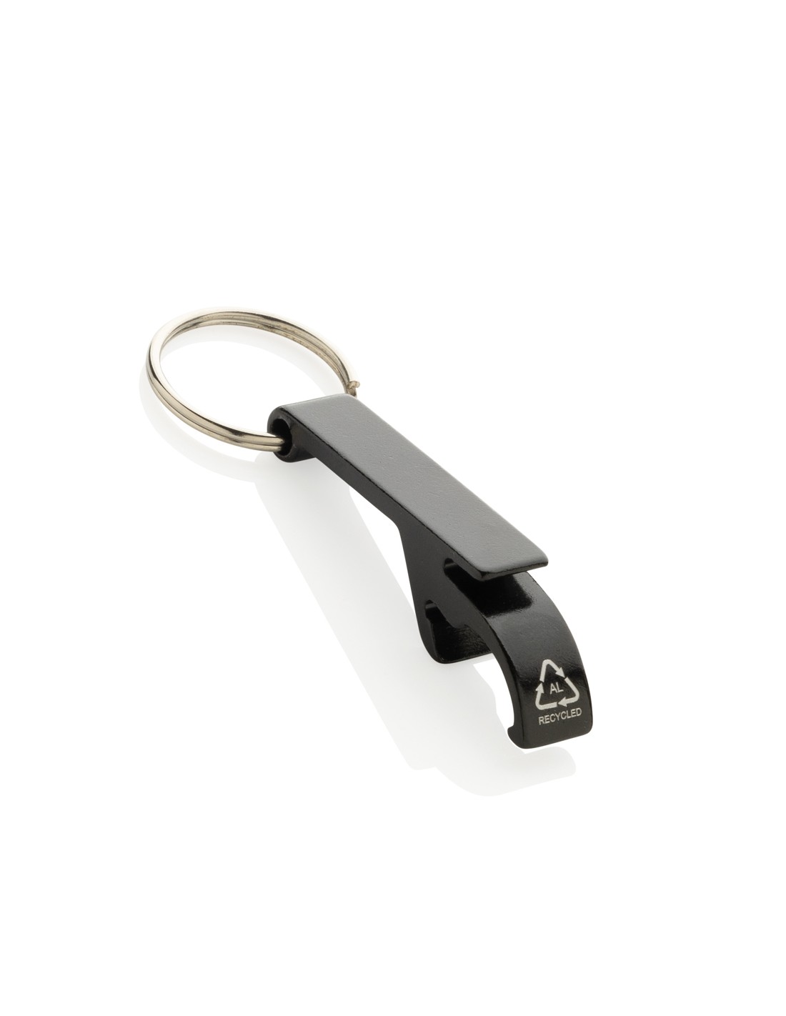 Resistente portachiavi apribottiglie e apriscatole realizzato con alluminio riciclato RCS. Contenuto totale riciclato: 79% in base al peso totale dell'articolo. La certificazione RCS garantisce una filiera completamente certificata dei materiali riciclati. Confezionato in un sacchetto di carta.