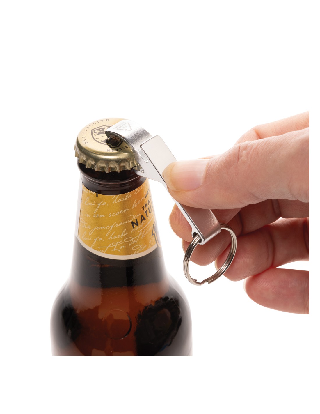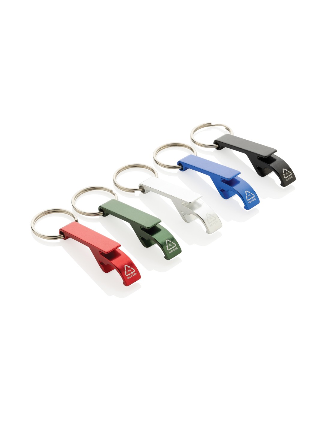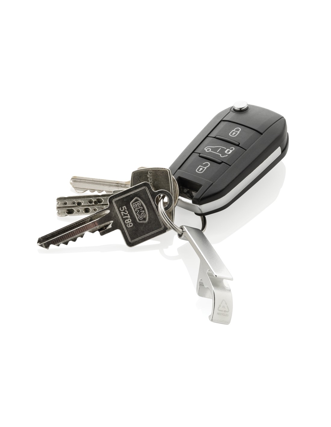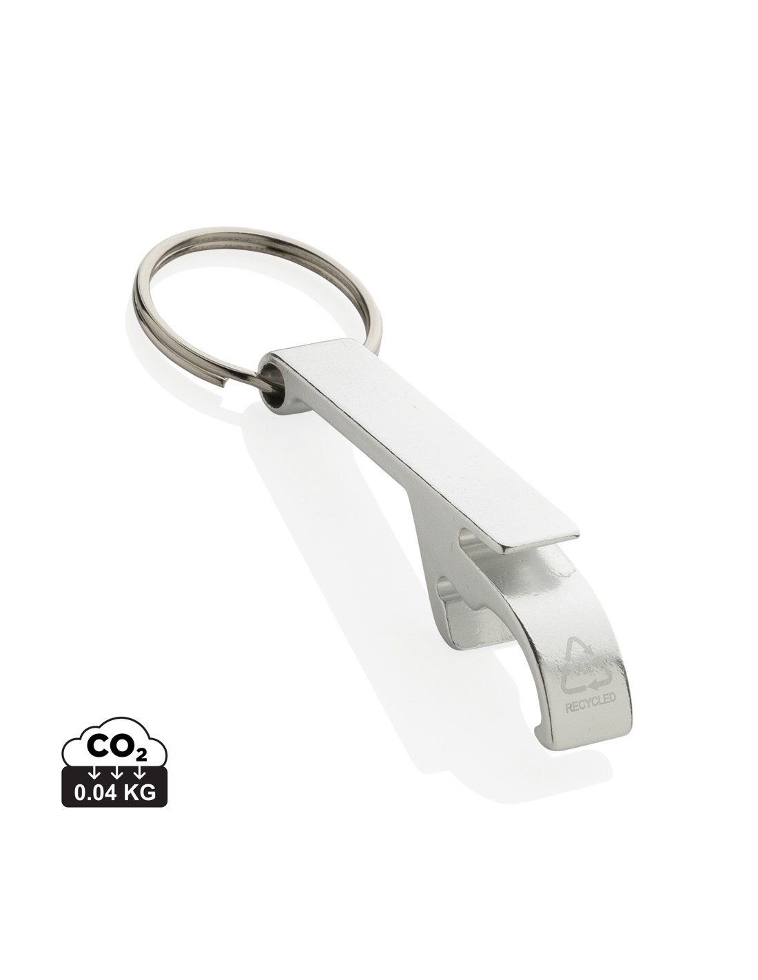 Resistente portachiavi apribottiglie e apriscatole realizzato con alluminio riciclato RCS. Contenuto totale riciclato: 79% in base al peso totale dell'articolo. La certificazione RCS garantisce una filiera completamente certificata dei materiali riciclati. Confezionato in un sacchetto di carta.