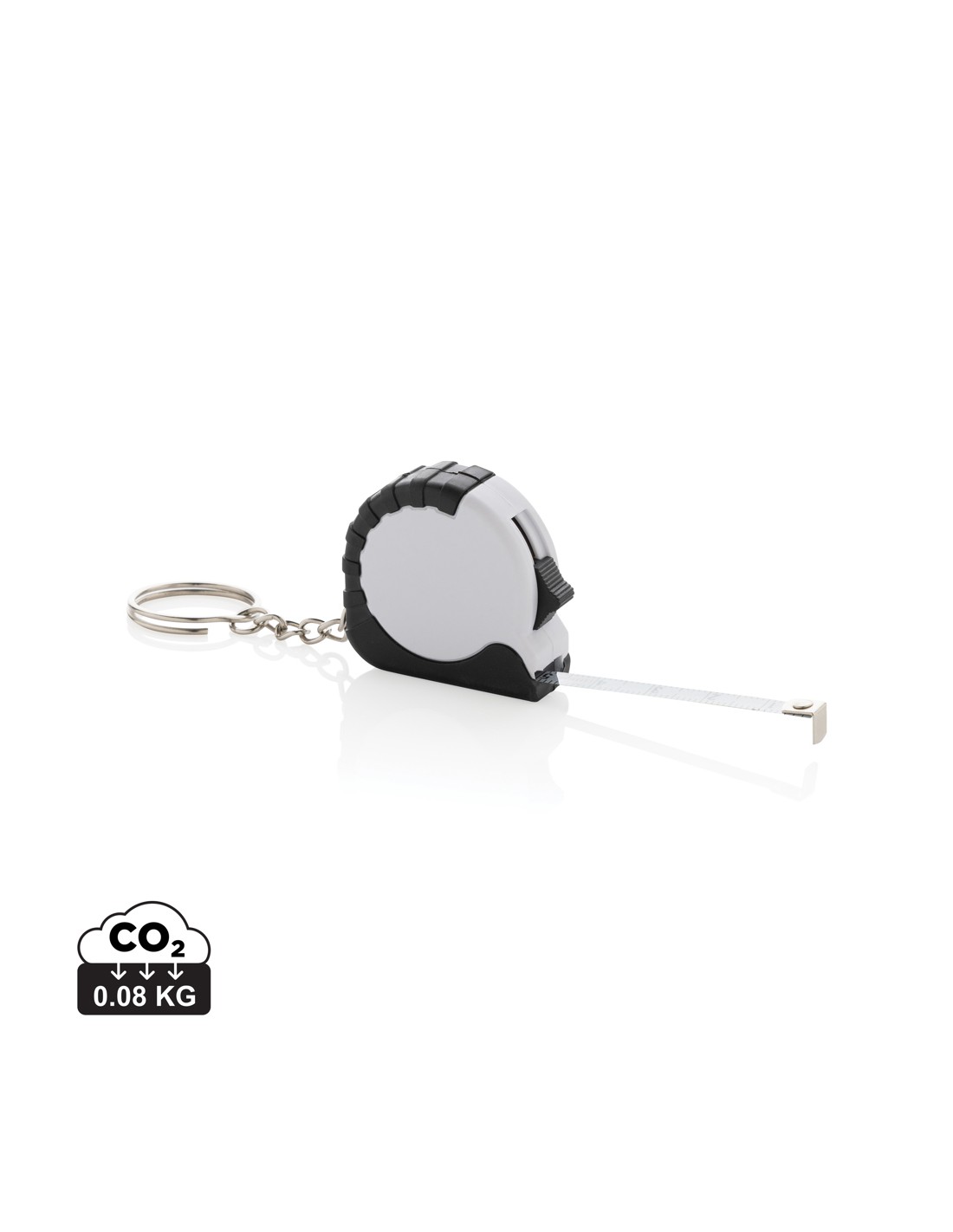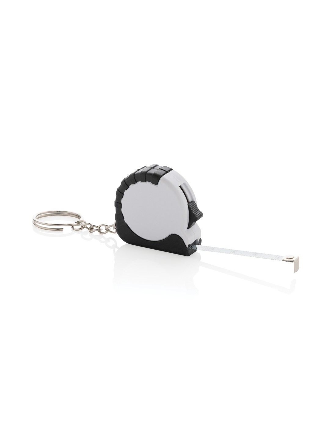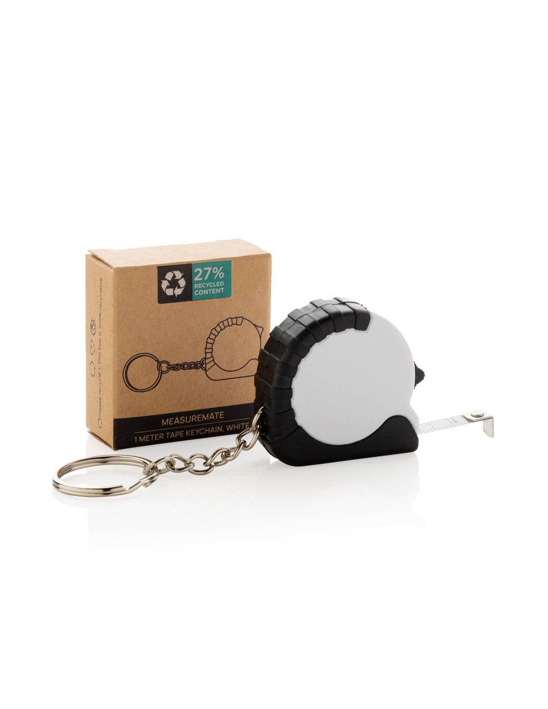Flessometro portachiavi da 1 metro. Realizzato in ABS riciclato RCS e nastro in acciaio inossidabile. Contenuto totale riciclato: 27% in base al peso totale dell'articolo. La certificazione RCS garantisce una filiera completamente certificata dei materiali riciclati. Confezionato in busta di carta.