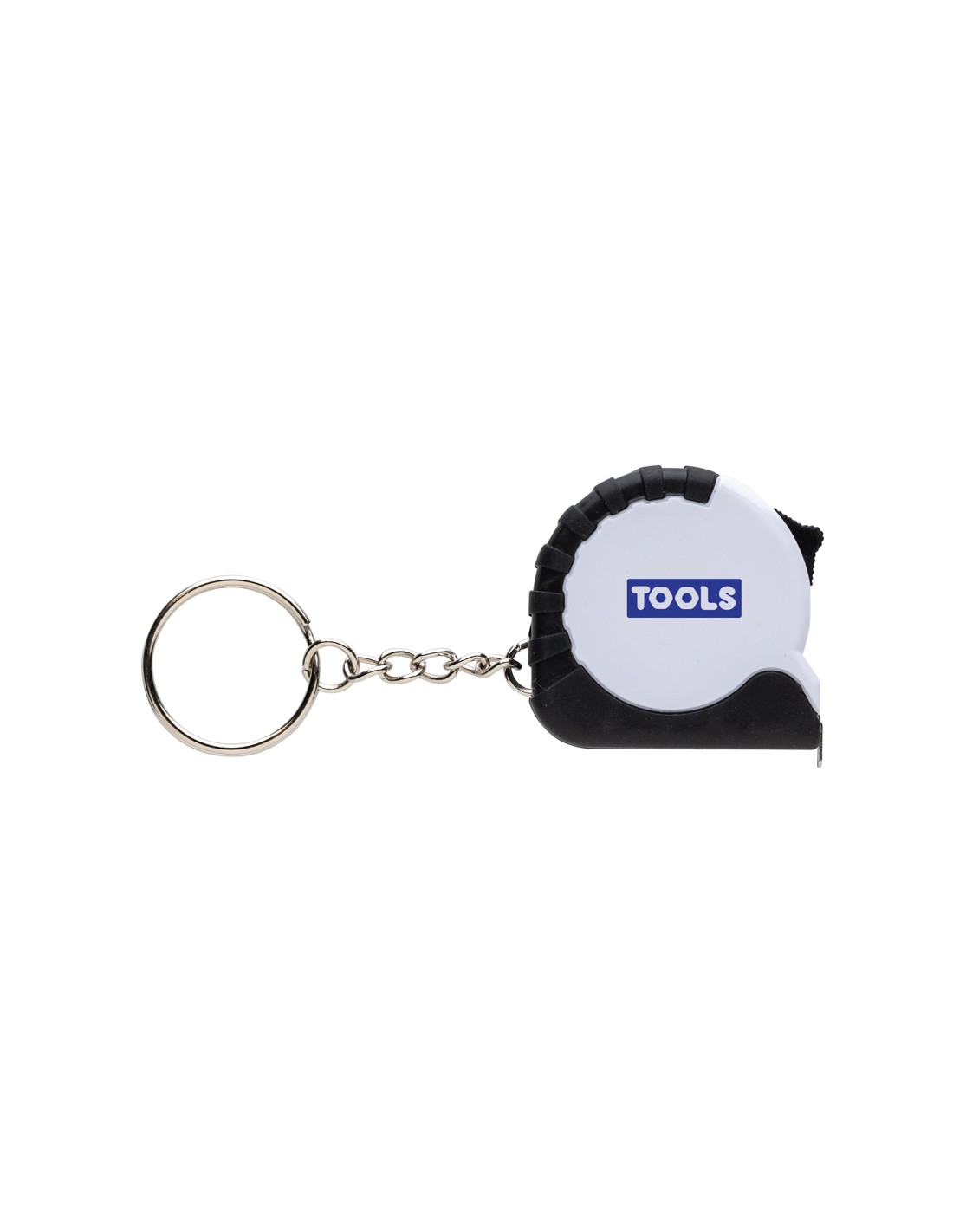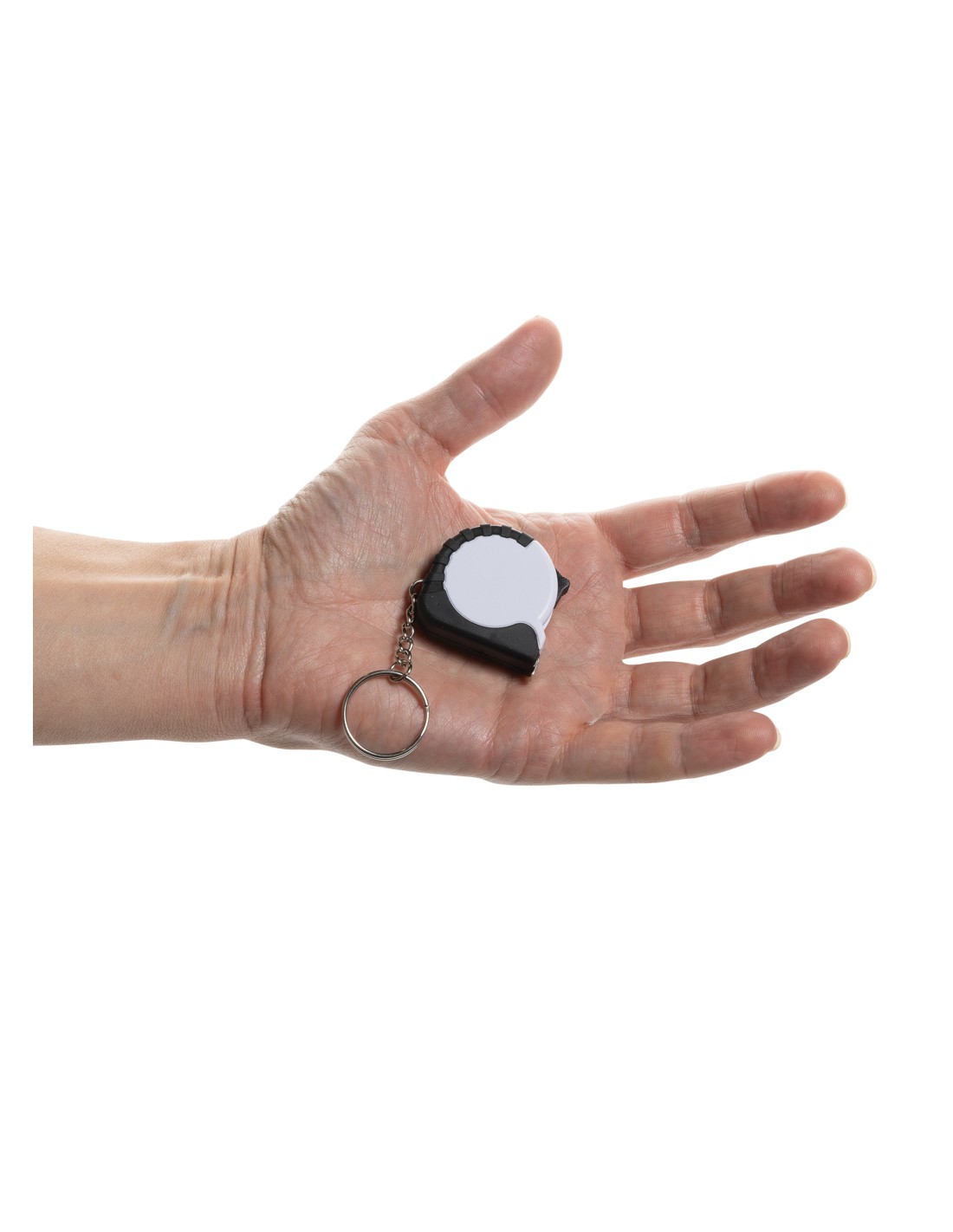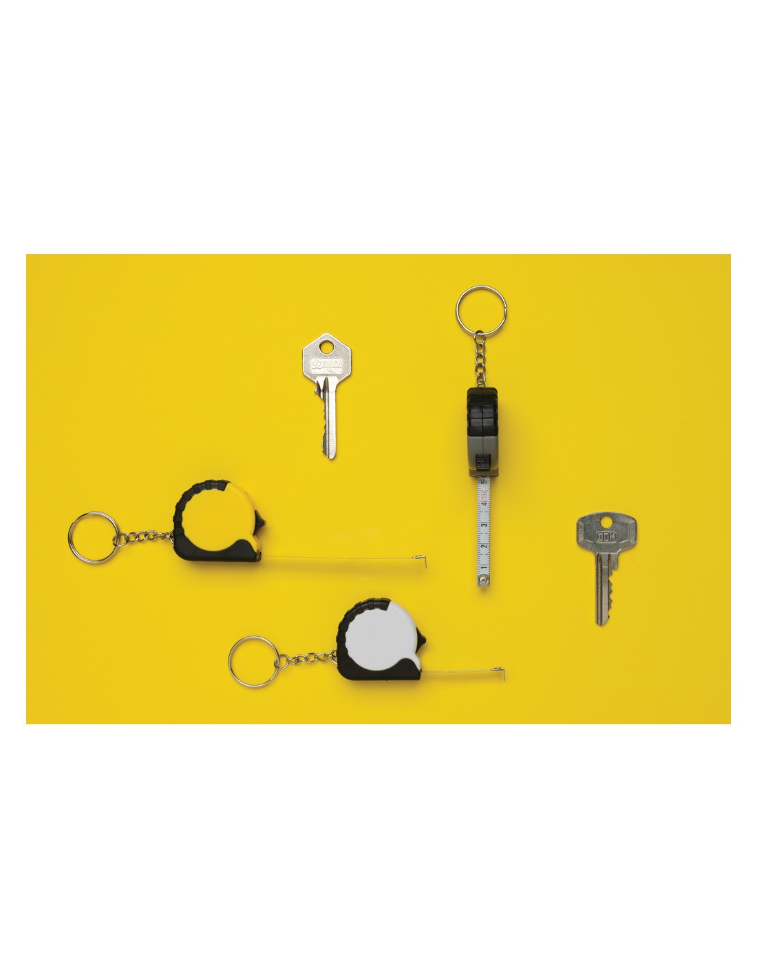 Flessometro portachiavi da 1 metro. Realizzato in ABS riciclato RCS e nastro in acciaio inossidabile. Contenuto totale riciclato: 27% in base al peso totale dell'articolo. La certificazione RCS garantisce una filiera completamente certificata dei materiali riciclati. Confezionato in busta di carta.