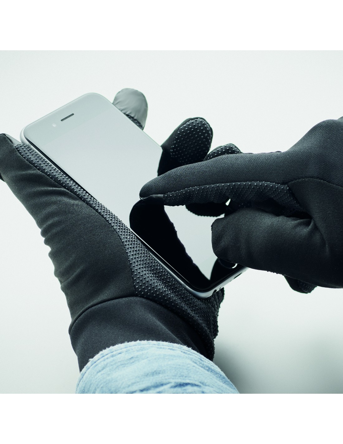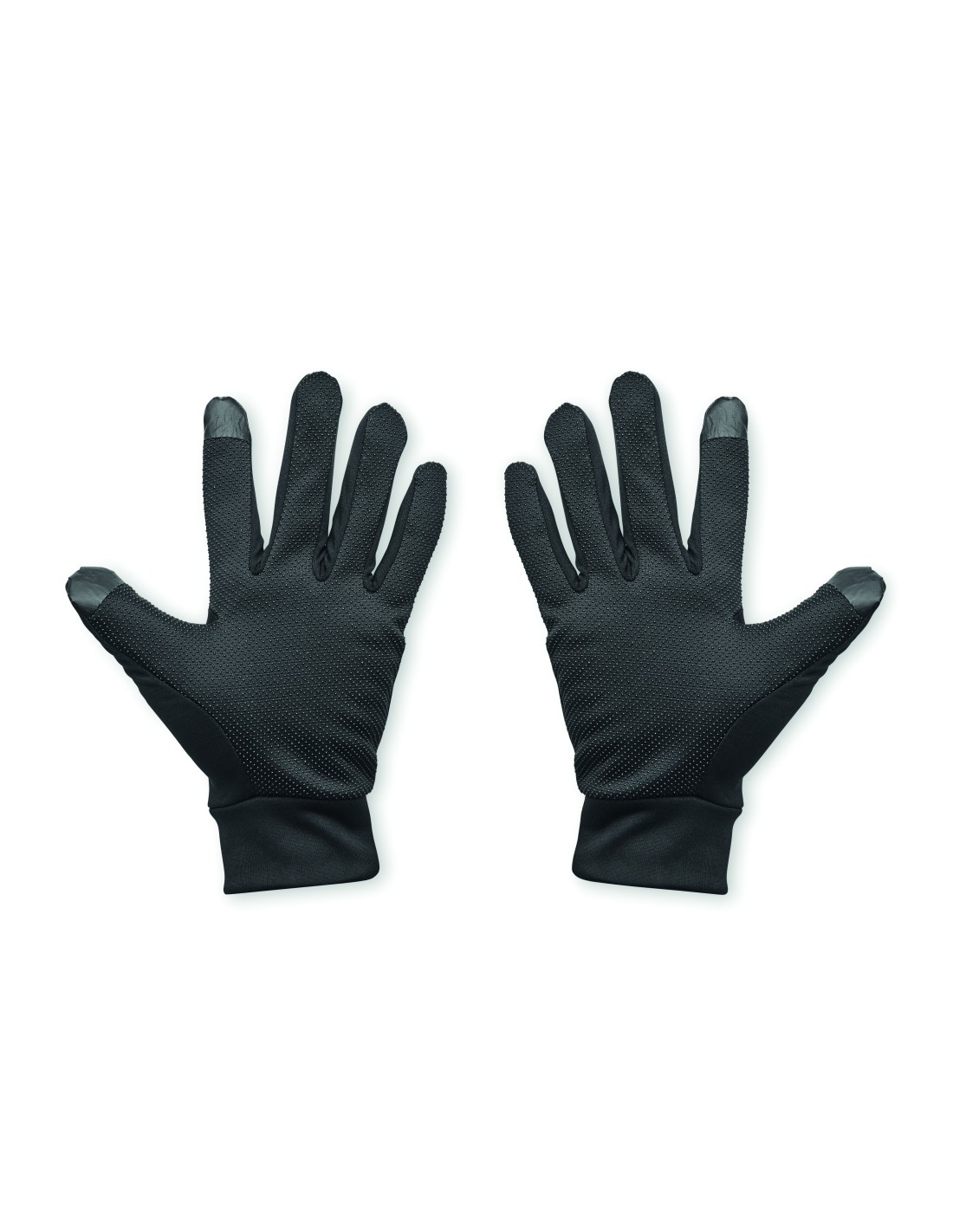 Guanti sportivi tattili per smartphone in poliestere. Due dita con funzione touch con punti antiscivolo su palmo e dita in PVC.