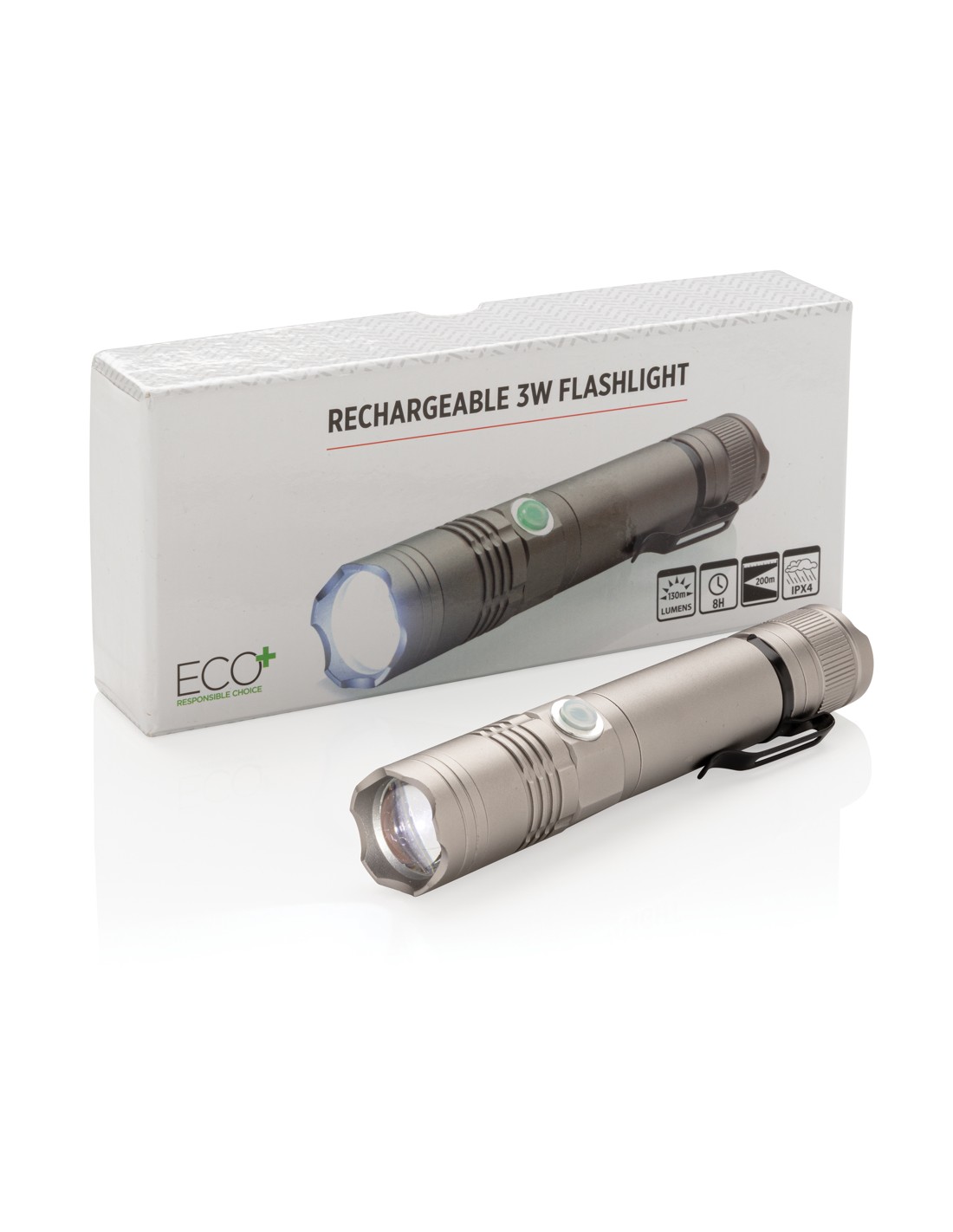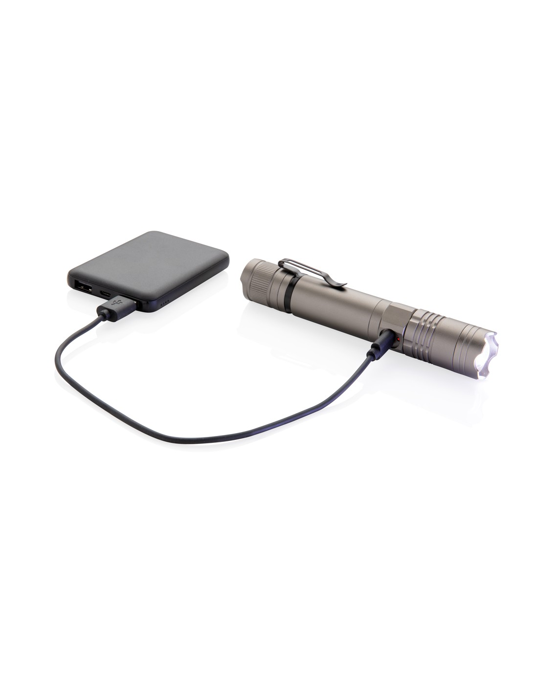 Torcia flashlight ricaricabile con grande autonomia. Può essere ricaricata quante volte vuoi senza la necessità di utilizzare batterie e questo la rende sostenibile. La potenza della torcia è 130 lumen e il raggio illumina fino a circa 200 metri. Include tre modalità: brillante, fioca e lampeggiante. La puoi anche utilizzare sotto la pioggia in quanto resistente all'acqua IPX4. Include una batteria al litio da 2.200 mAh che assicura un'autonomia di 8 ore. Il tempo di ricarica è di circa 2 ore. Include cavo di ricarica micro USB.