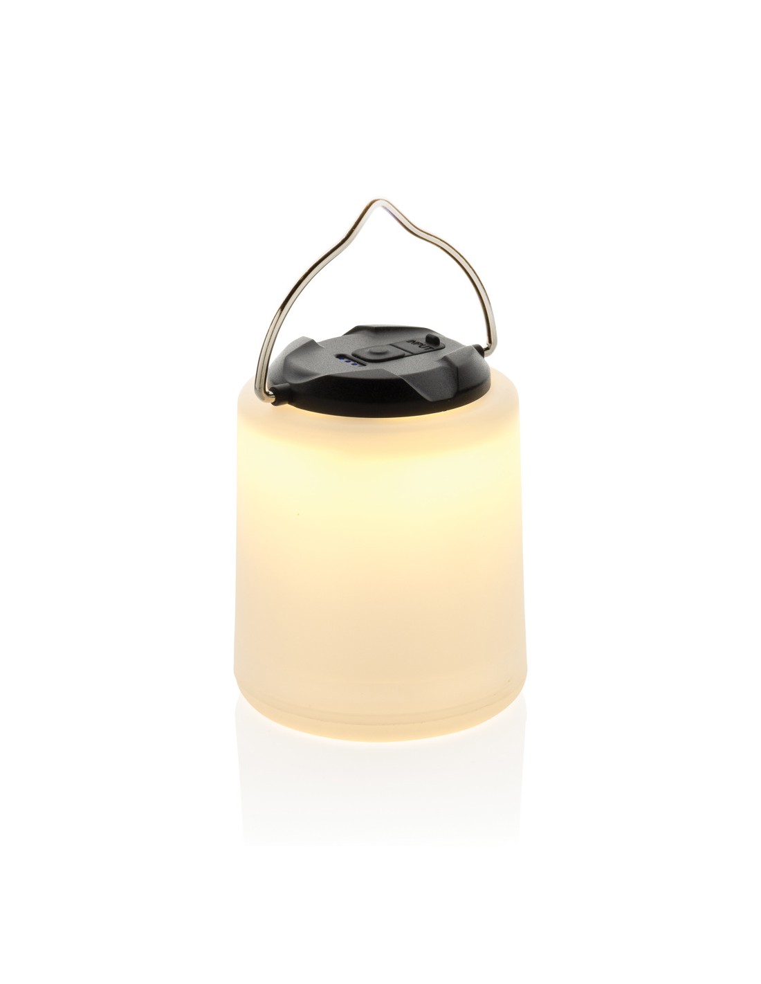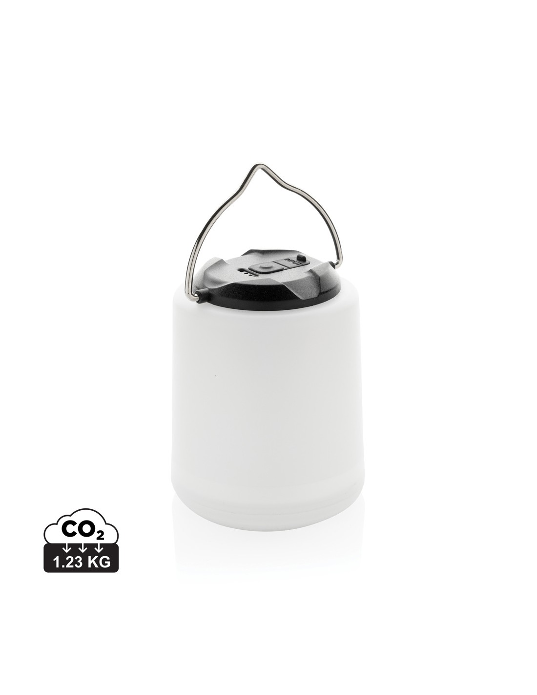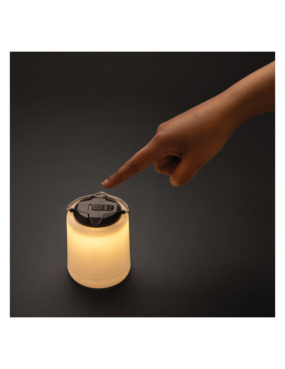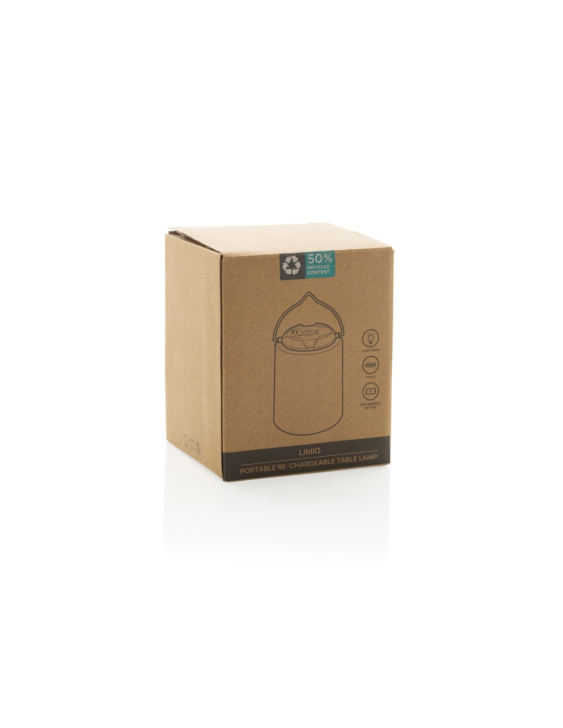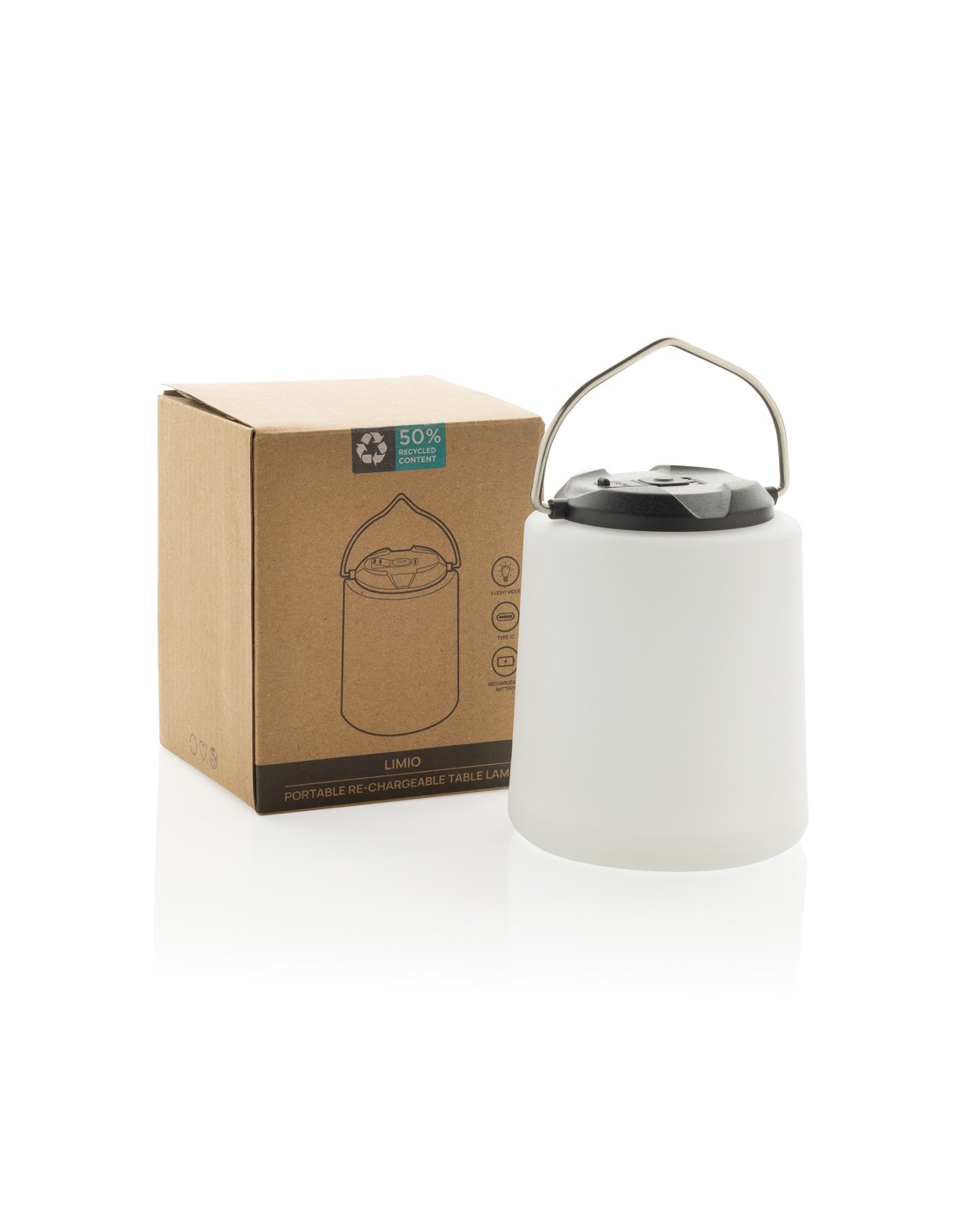 Realizzata in plastica riciclata RCS, la lampada da tavolo ricaricabile Limio è una soluzione di illuminazione versatile per uso interno ed esterno. Progettata per essere appoggiata su un tavolo o appesa a seconda delle necessità, è dotata di una batteria ricaricabile tramite type C che garantisce fino a 4 ore di illuminazione e si ricarica completamente in sole 2 ore. La luce LED eroga fino a 300 lumen e offre tre modalità - alta, bassa e lampeggiante. Con un grado di impermeabilità IPX4, è adatta all'uso in condizioni di umidità. Struttura in plastica ABS riciclata certificata RCS. RCS (Recycled Claim Standard) è uno standard per la verifica del contenuto riciclato di un prodotto lungo tutta la catena di approvvigionamento. Contenuto totale riciclato: 50% rispetto al peso totale del prodotto. Questa lampada è priva di PVC e confezionata in una scatola kraft certificata FSC.