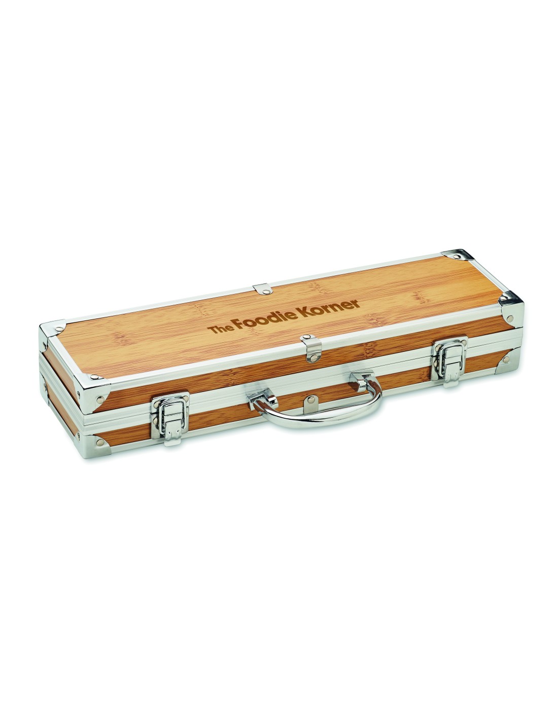 Set da barbecue in bambù composto da 3 pezzi: spatola (42 x 9,5 cm), pinza (46 x 2,2 cm) e forchettone (43 x 3,2 cm). Il set viene consegnato in una confezione regalo in bambù (51,5 x 18,2 x 7,2 cm). I manici e la confezione regalo sono realizzati in bambù ottenuto e prodotto in base a standard...