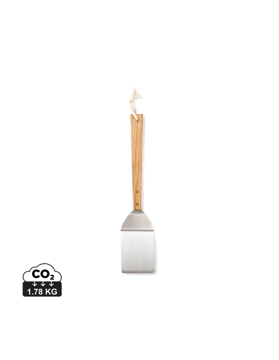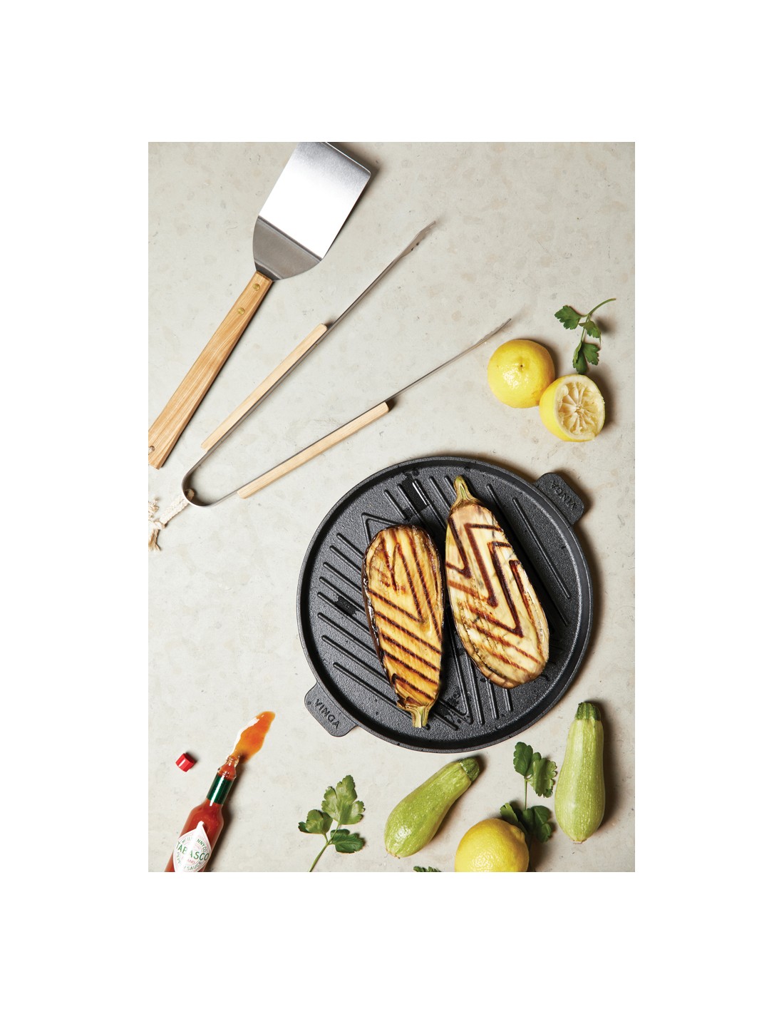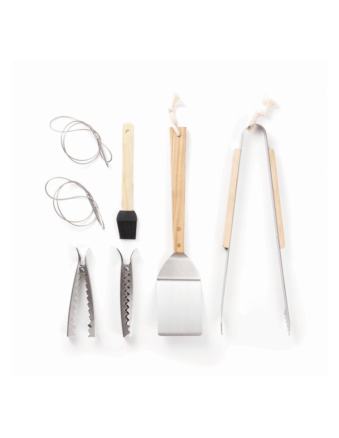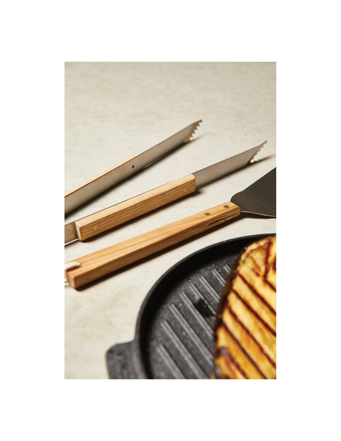 Set di tre accessori in acciaio: spatola, pinza e forchettone. Confezione in TNT nera con chiusura zip.