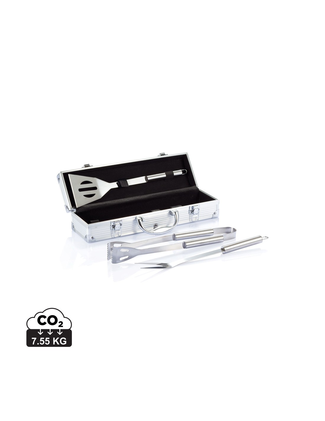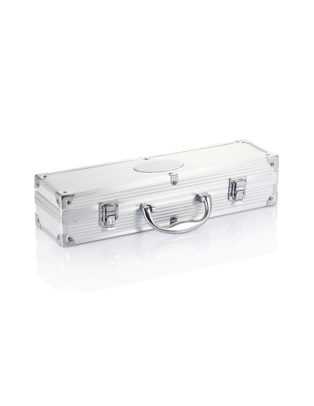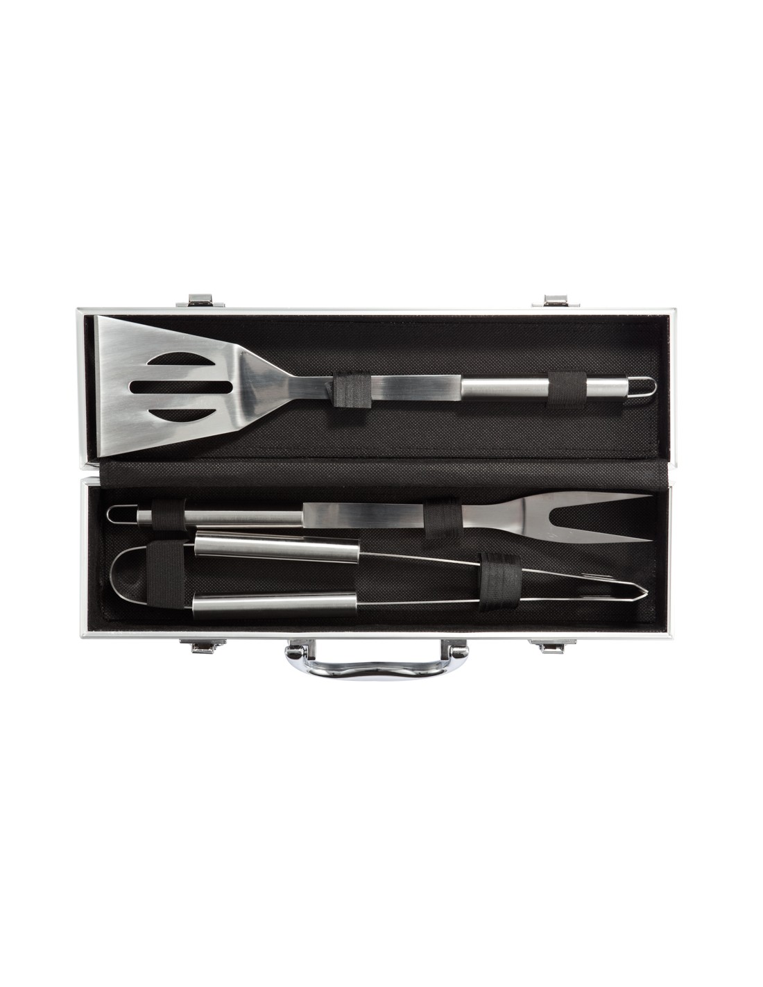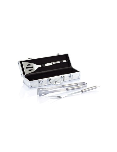 Set di 12 accessori in acciaio inossidabile per il barbecue: 4 spiedini, coltello, 4 ganci per mais, spatola, forchettone e pinze. Confezionato in scatola di alluminio con manico.