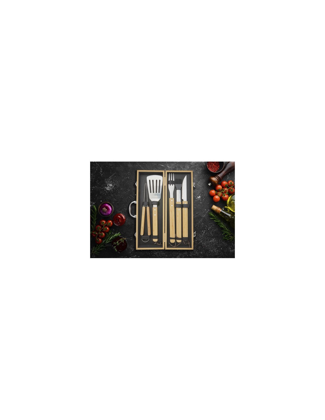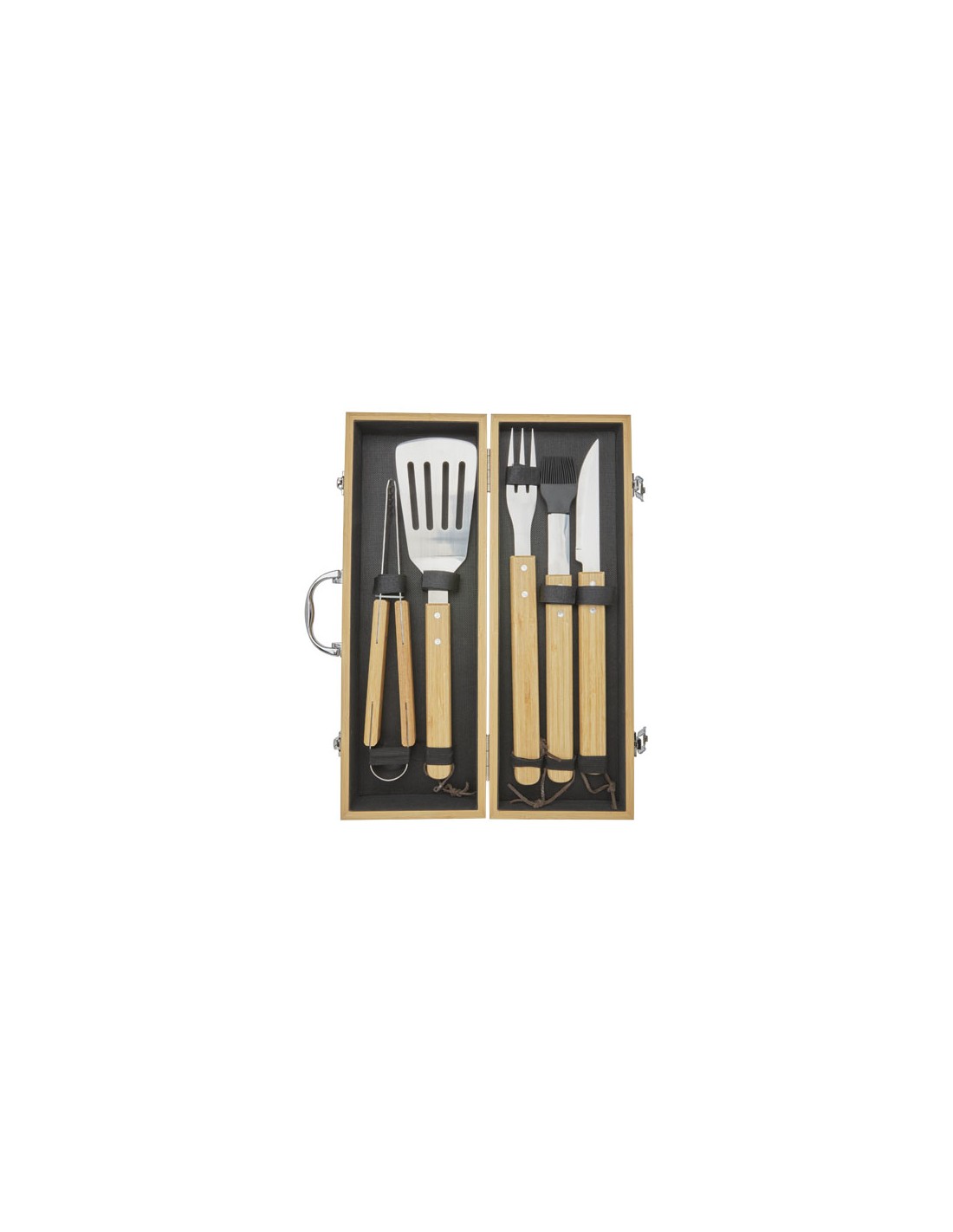 Set 3 utensili in acciaio inossidabile per BBQ in valigetta di alluminio. Placca per logo aziendale.