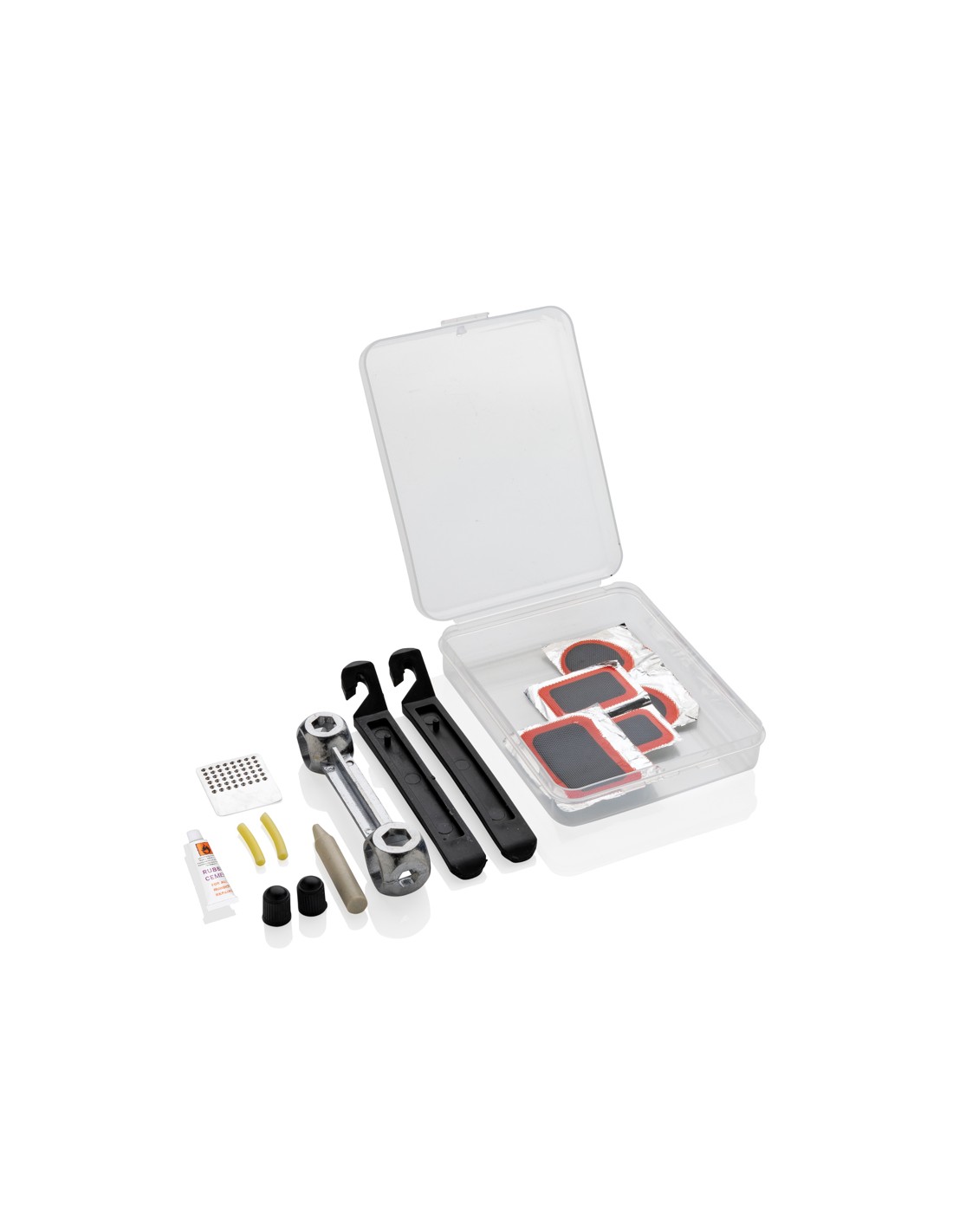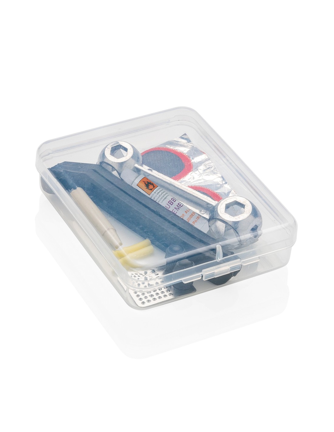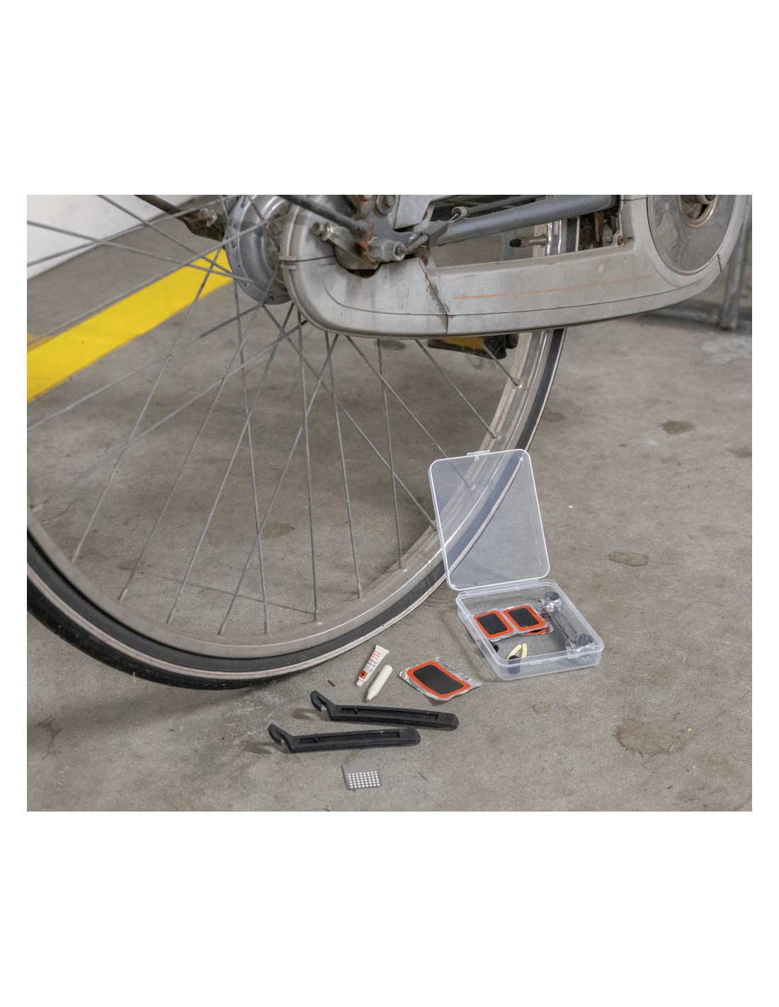 Kit di riparazione bici compatto e facile da portare con te in scatola in PP. Il set include 1 chiave in lega di alluminio, 2 leve per pneumatici, 1 colla, 2 tappi per valvole, 2 tubi per valvole, 1 grattugia, 5 toppe di riparazione.