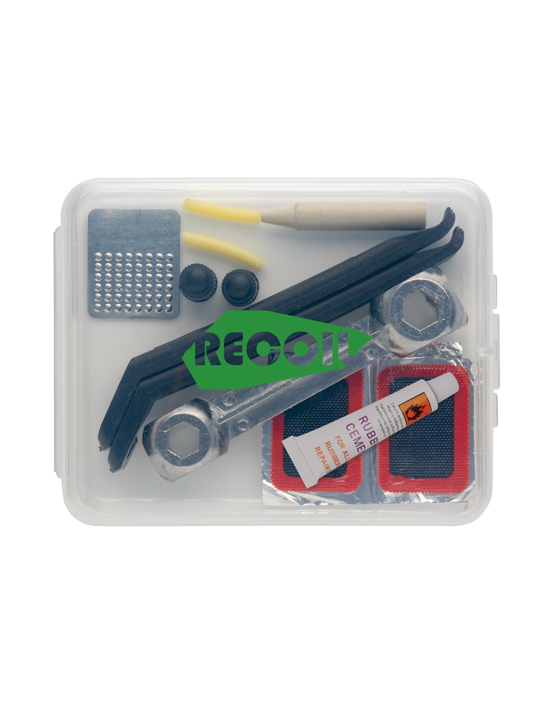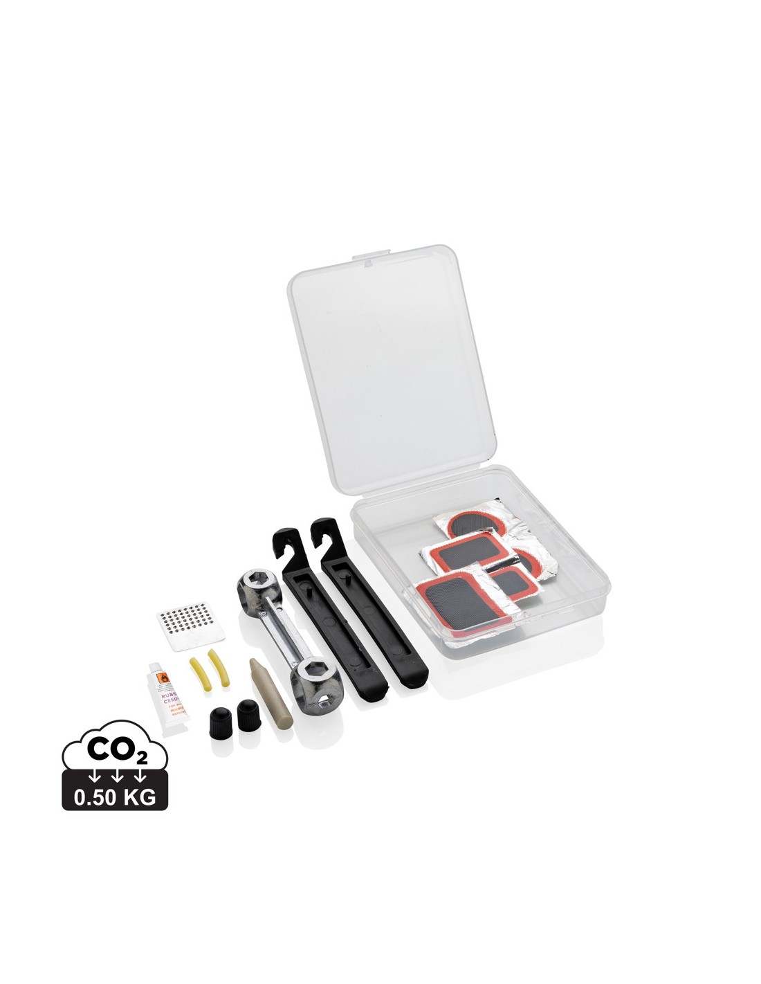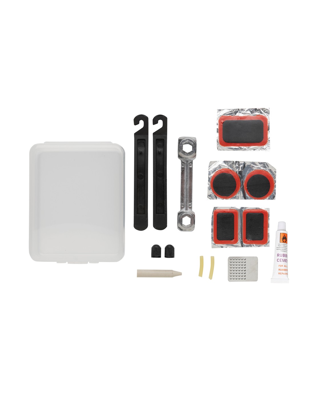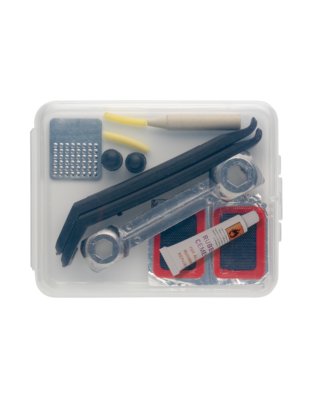 Kit di riparazione bici compatto e facile da portare con te in scatola in PP. Il set include 1 chiave in lega di alluminio, 2 leve per pneumatici, 1 colla, 2 tappi per valvole, 2 tubi per valvole, 1 grattugia, 5 toppe di riparazione.