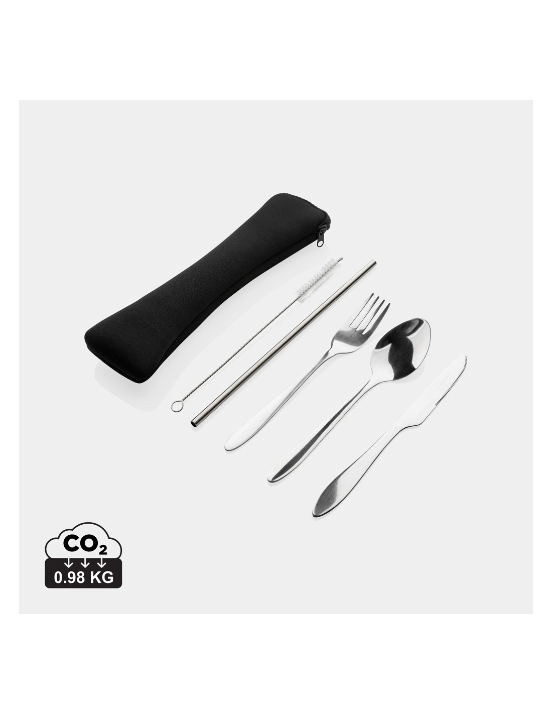Set di posate riutilizzabili in acciaio inossidabile comode da portare con te ovunque tu vada e ideali per quando porti il ​​pranzo al lavoro. Questo set include una forchetta, un coltello, un cucchiaio, una cannuccia e uno scovolino per pulire la cannuccia. In custodia di neoprene con cerniera e cordino di chiusura. Adatto alla lavastoviglie.