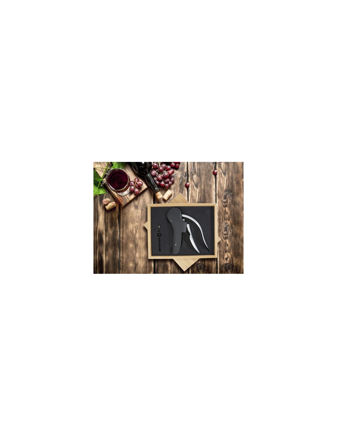 Set per vino composto da 9 pezzi con 1 cavatappi, 2 tappi, 1 versatore, 1 anello, 1 tagliacapsule, 1 termometro e 2 ricambi per cavatappi. Fornito in una confezione regalo in bambù di provenienza e produzione secondo standard sostenibili.