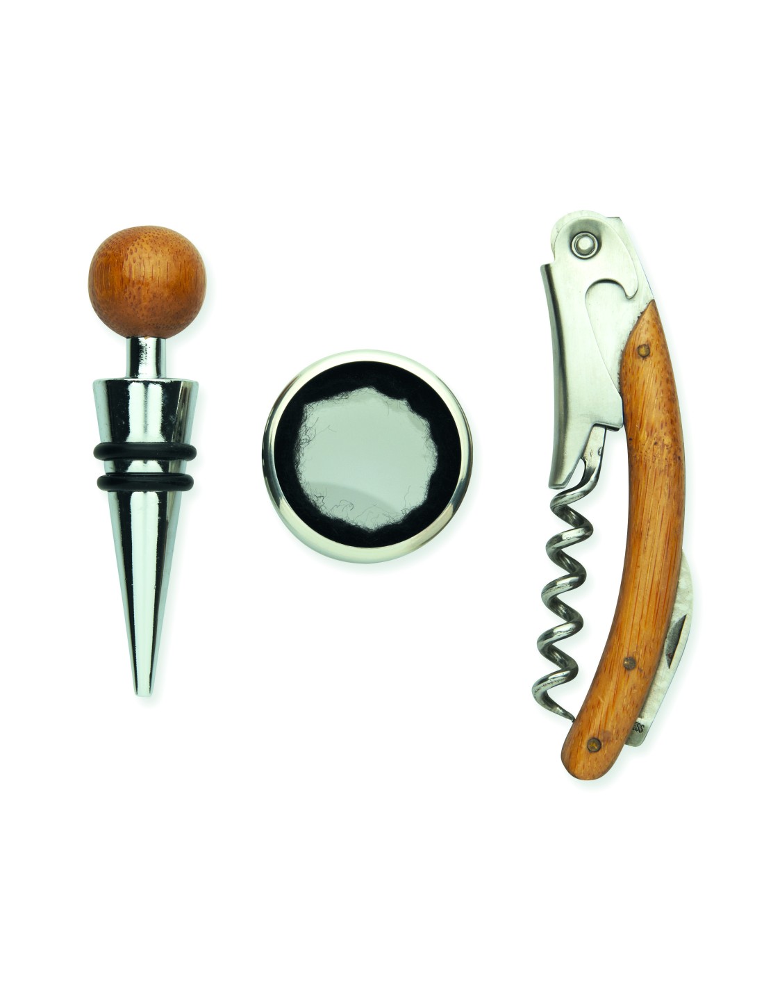 Set vino in scatola di bamboo che comprende un salvagoccia, un cavatappi, un tappo in acciaio inossidabile e bamboo.