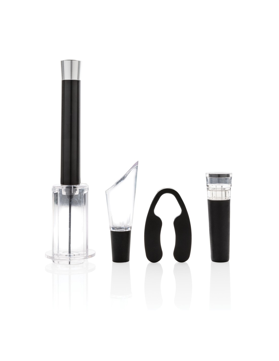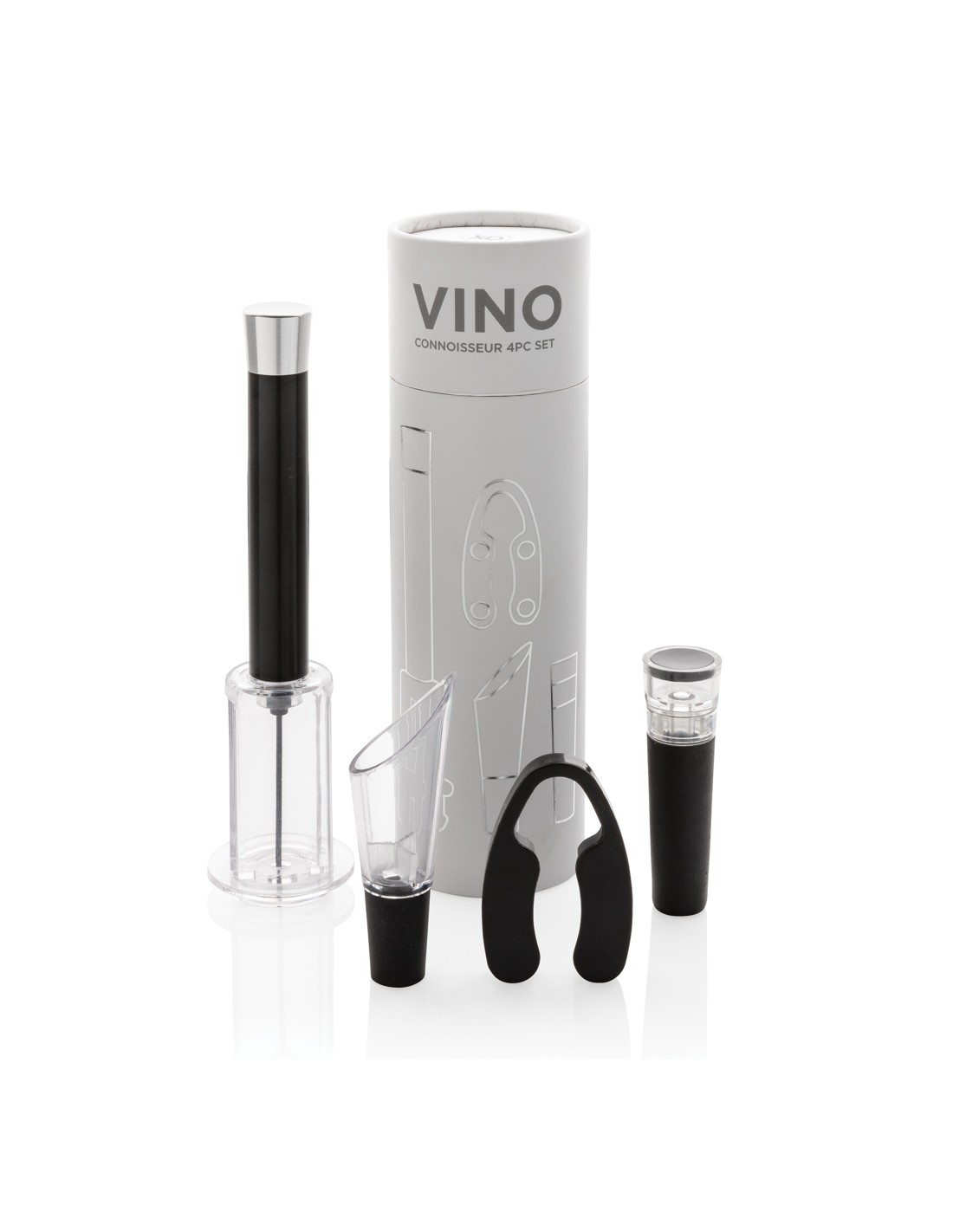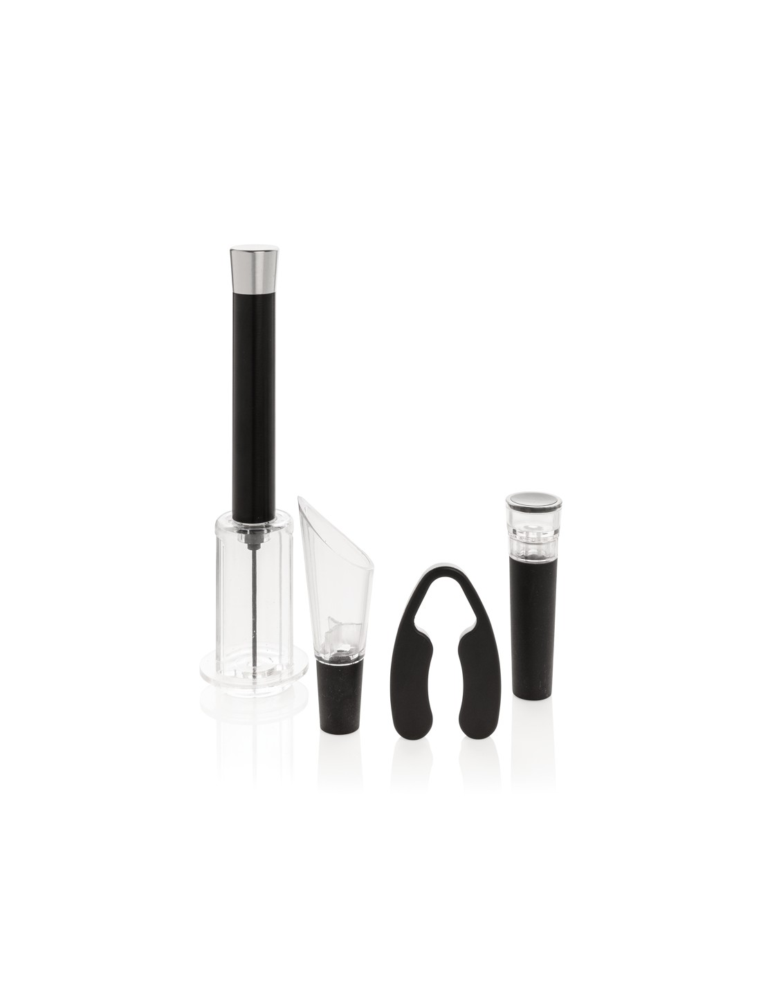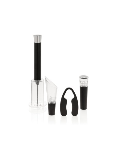 Avere tutto il necessario per aprire, servire e conservare i tuoi vini preferiti con questo set da 4 pezzi. Il set è composto da un apribottiglie con pompa ad aria, leva capsula, tappo per vino con pompa per vuoto e versatore per vino con aeratore. Confezionato in un lussuoso tubo regalo.