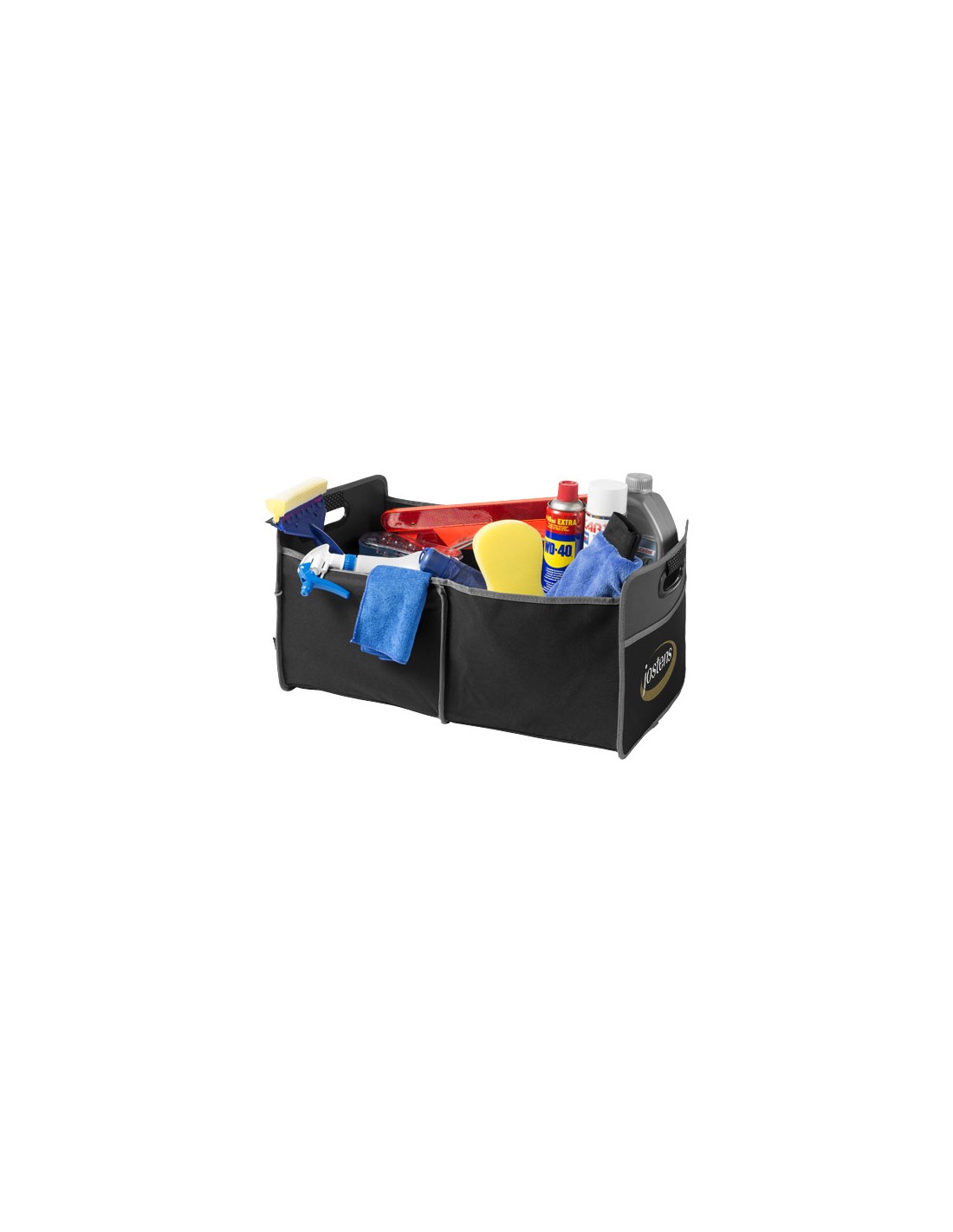 Questo organizer da portabagagli ti consente di tenere pulita e in ordine la tua auto e può essere piegato quando non è in uso. Struttura in poliestere 600D con due tasche esterne e due scomparti interni. Manici imbottiti per trasportarlo comodamente. Articolo fornito con etichetta STAC. Design esclusivo.