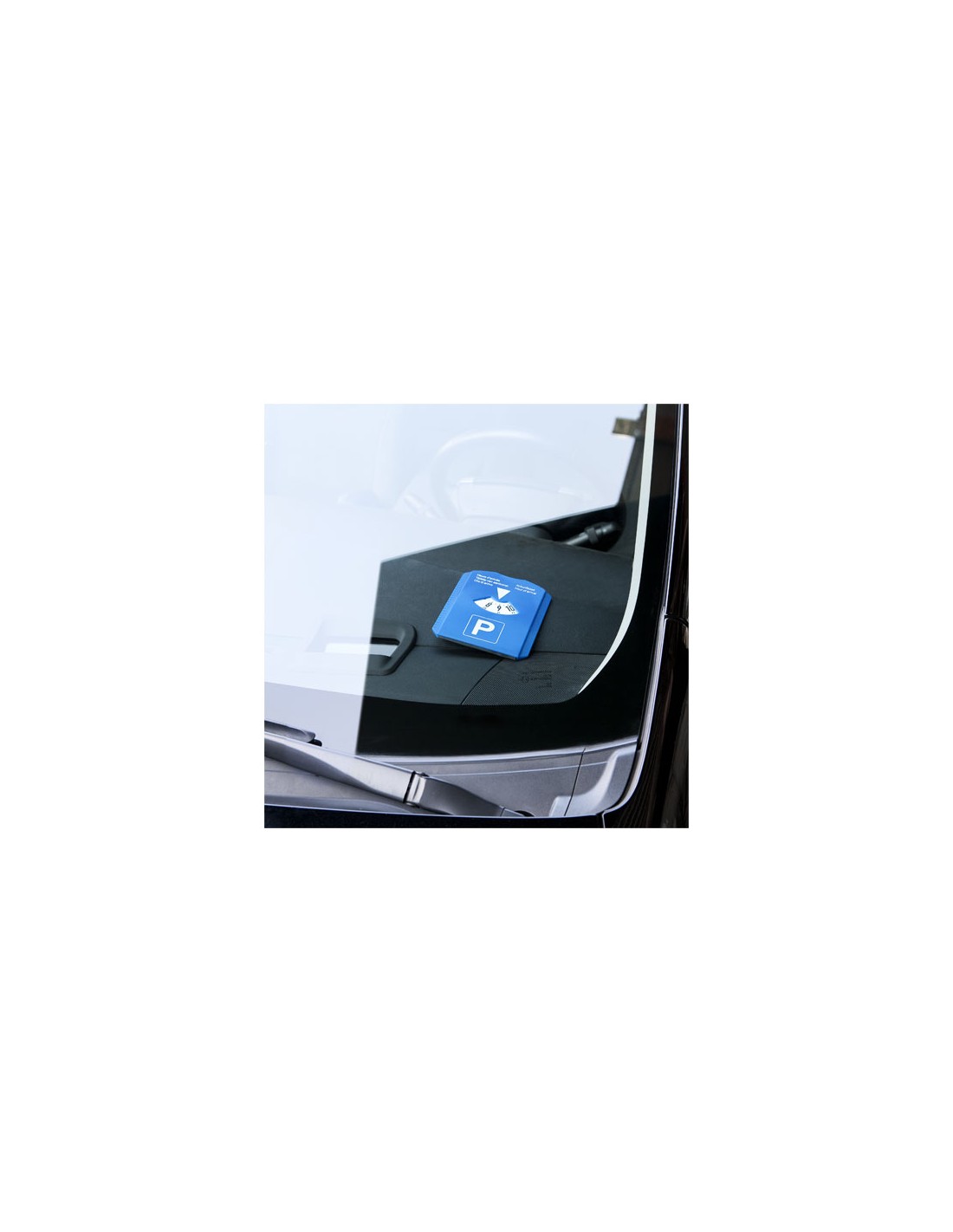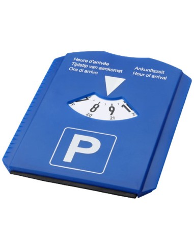 Disco orario con raschia ghiaccio, spazzola di gomma, moneta per carrello e misuratore di profondità del battistrada degli pneumatici. Il disco orario ha un'ampia area bianca sul retro per il logo. Il testo "Ora di arrivo" sulla copertura del disco è tradotto in olandese, inglese, francese, tedesco e italiano. Le normative possono variare a livello locale.
