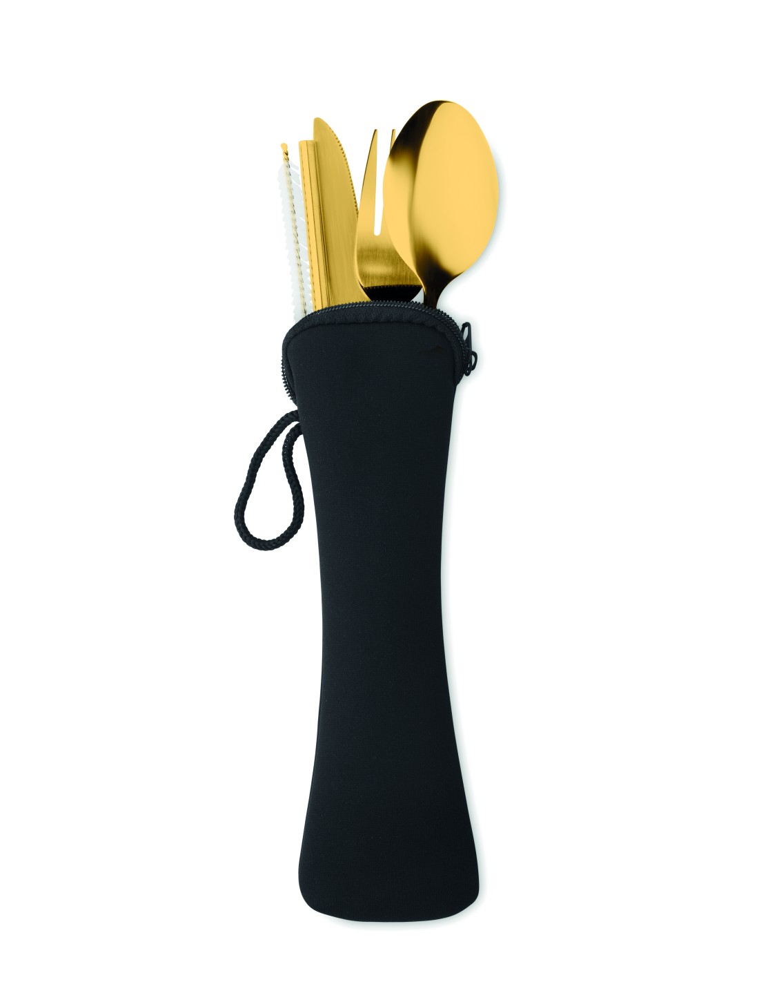 Set di posate in acciaio inossidabile riutilizzabili composto da forchetta, coltello, cucchiaio, cannuccia e spazzola, in sacchetto di neoprene.