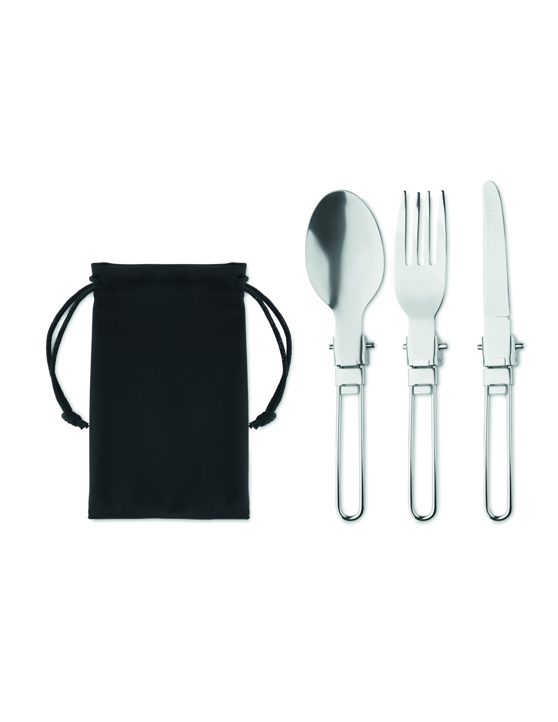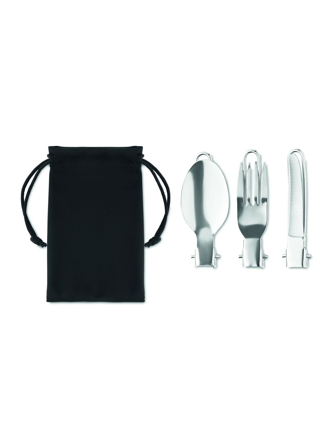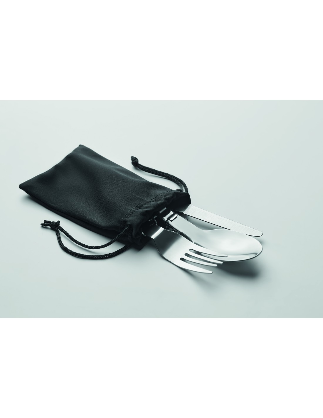 Set di 3 pezzi di posate da campeggio in acciaio inossidabile in sacchetto RPET.