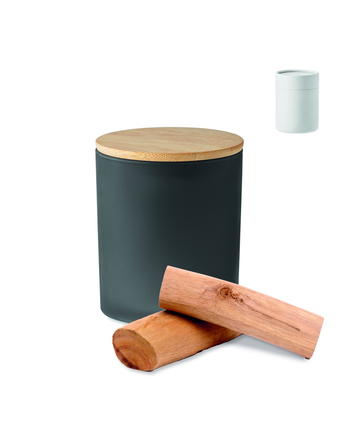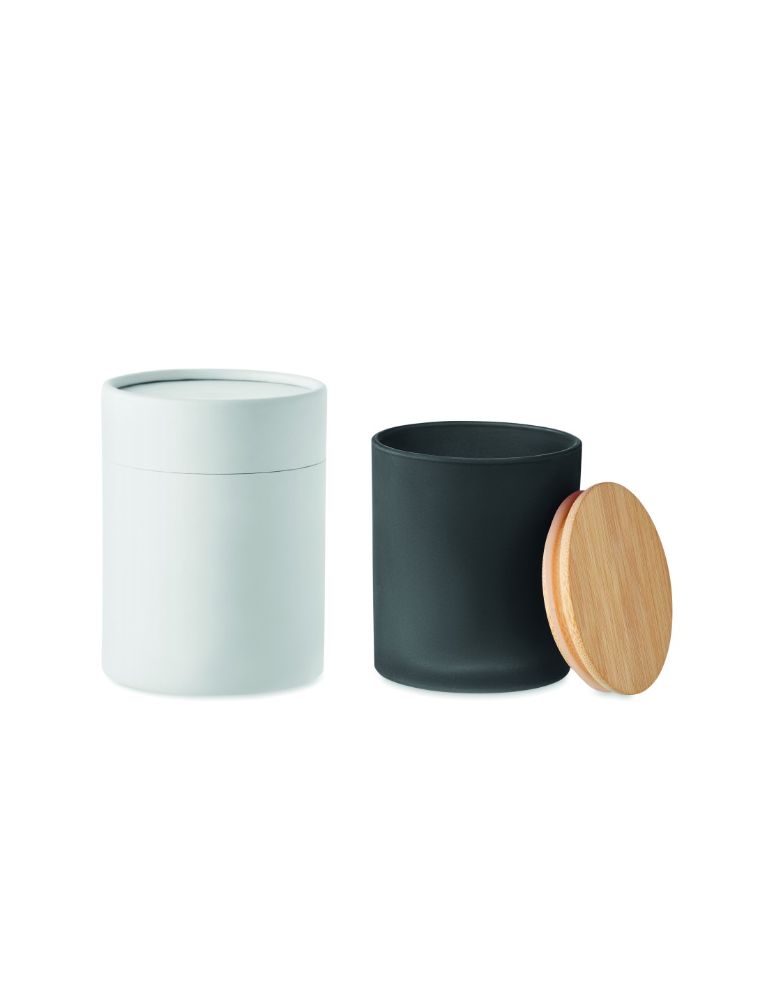 Candela di cera vegetale alla cannella, vaniglia, legno di sandalo o gelsomino in barattolo di vetro opaco con coperchio di bamboo. 120 gr. Durata candela: 20 ore. In scatola regalo in tubo di carta.
