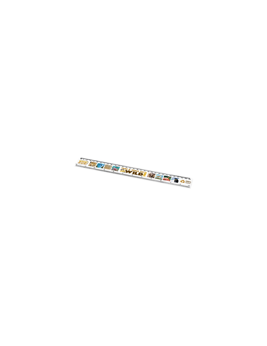 Resistente righello in plastica riciclata disponibile con marcature in pollici e in centimetri.