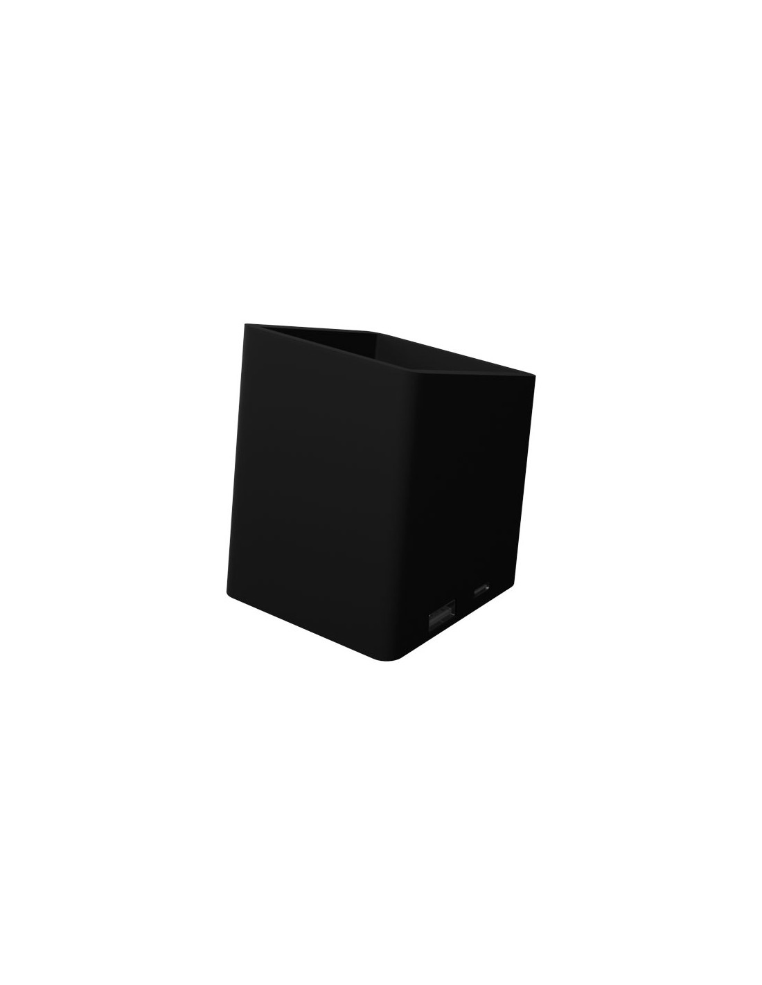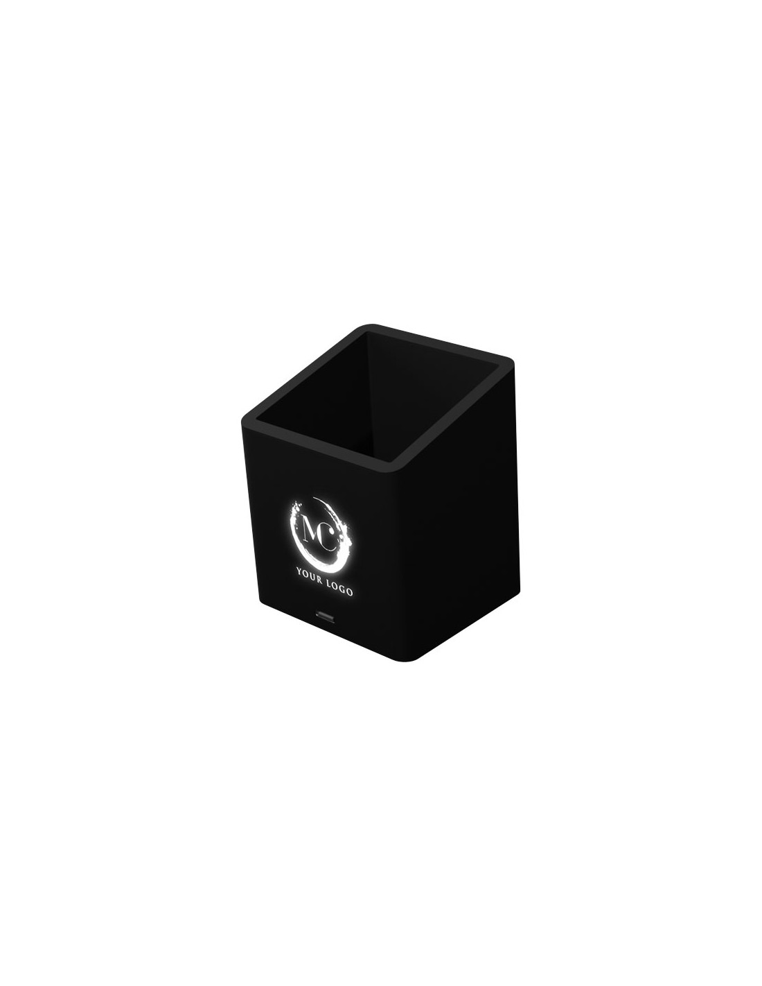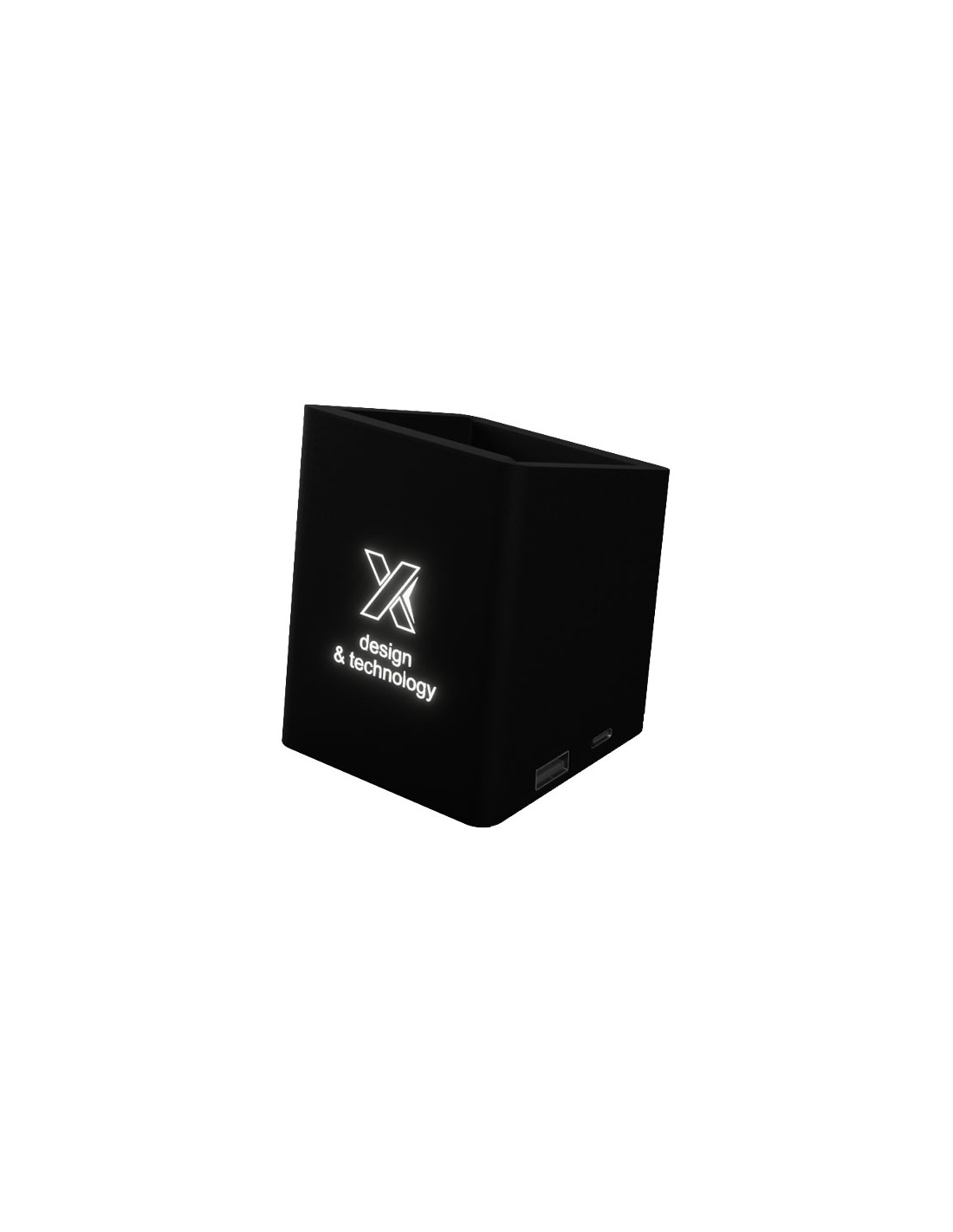 Portamatite (7,2 x 7,2 x 9 cm) in materiale sottoposto a trattamento antibatterico con 2 uscite USB: USB 1.0 e USB tipo C da 1 A. Il logo luminoso è applicato sulla parte anteriore e si illumina quando la USB viene inserita. Fornito con un cavo di ricarica realizzato in PET riciclato. Il portamatite è fornito in una confezione regalo di colore nero (11 x 7,7 x 8,6 cm) con chiusura magnetica. Garanzia di 3 anni inclusa.