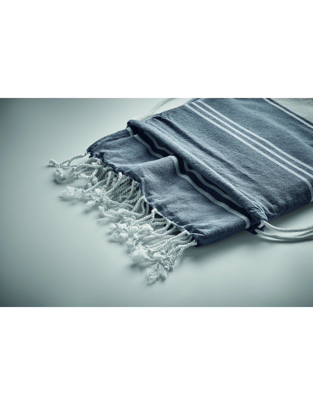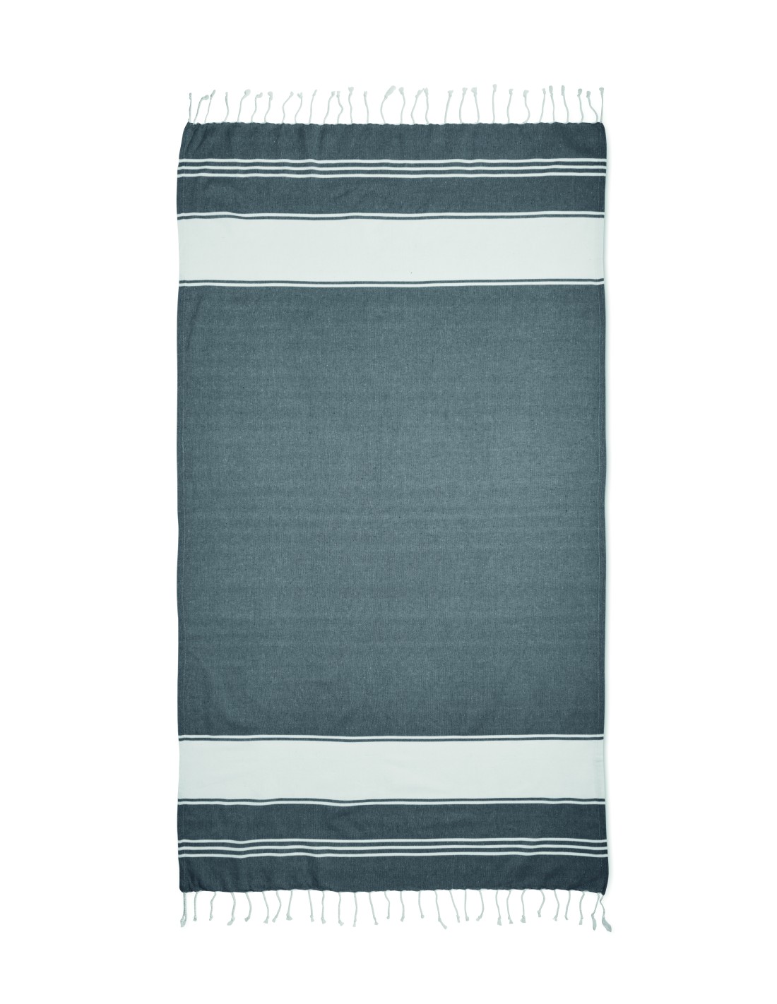 Asciugamano da hammam o da spiaggia in tessuto riciclato. 70% cotone riciclato e 30% poliestere riciclato SEAQUAL® YARN. 300 gr/m². 70x140 cm. L'INIZIATIVA SEAQUAL lavora con i centri di pulizia degli oceani di tutto il mondo per dare valore ai rifiuti che recuperano. Prodotto in UE.
