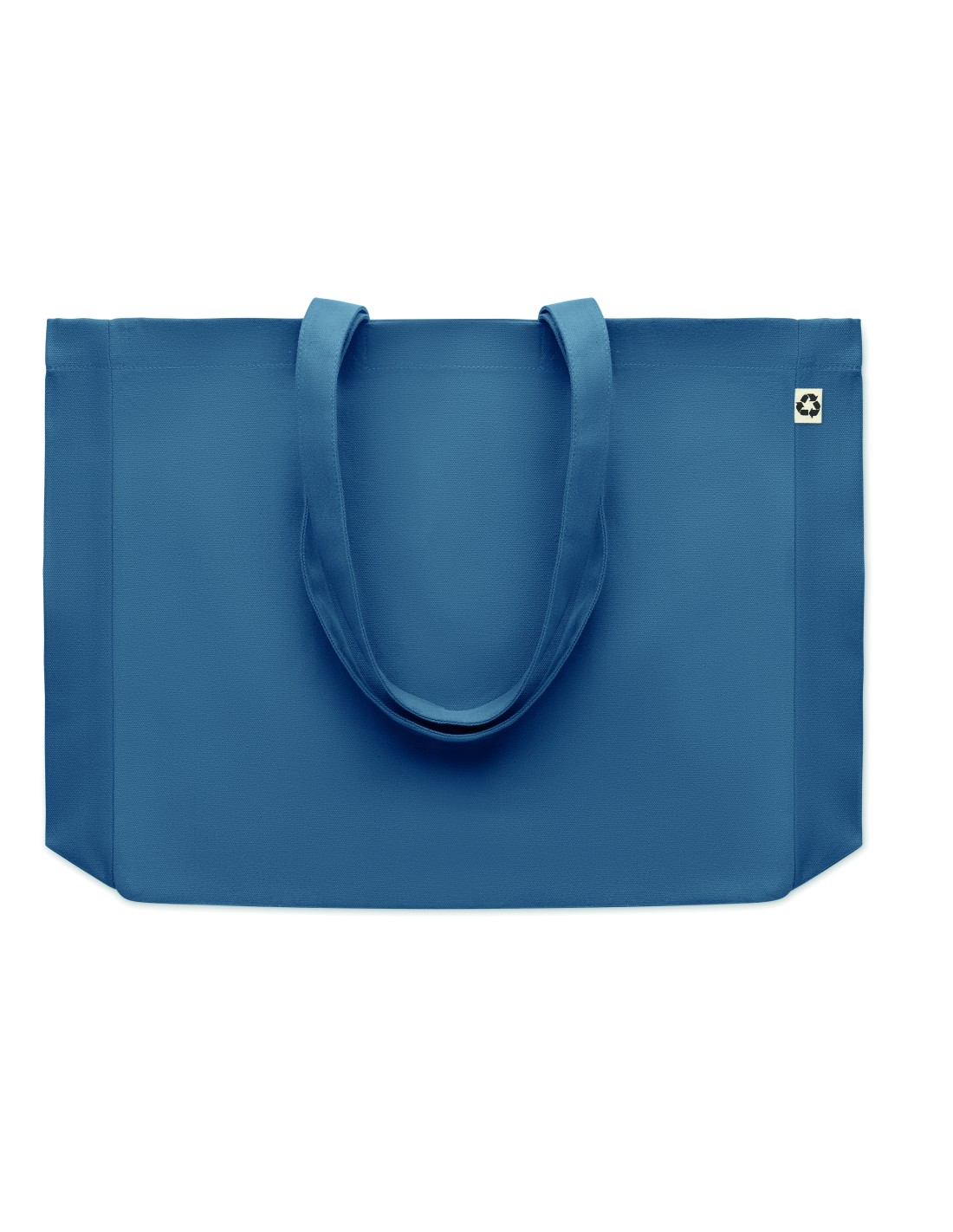 Shopper o borsa mare in policotone riciclato (70% cotone riciclato, 30% poliestere riciclato) con manici corti e lunghi. Tasca laterale con cerniera. 380 gr/m².