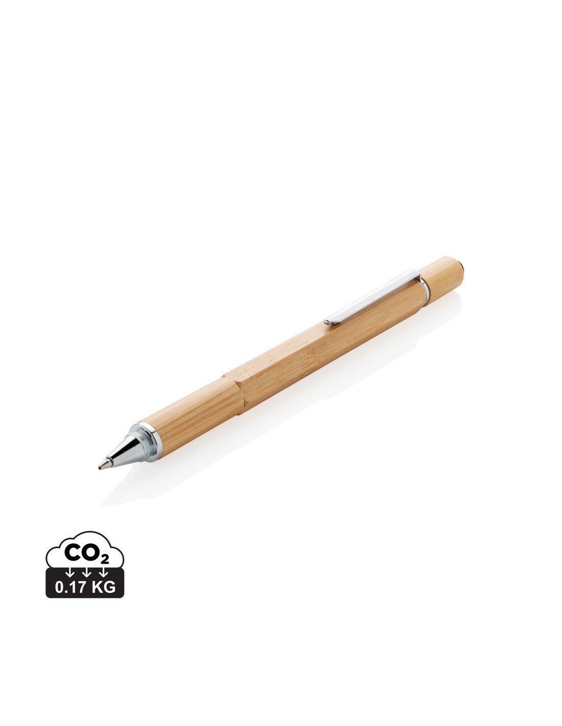 Penna multifunzione in bambù con righello (7cm), bolla, cacciavite, touchscreen e penna asfera con inchiostro blu (400m). Struttura in bambù con clip in alluminio.