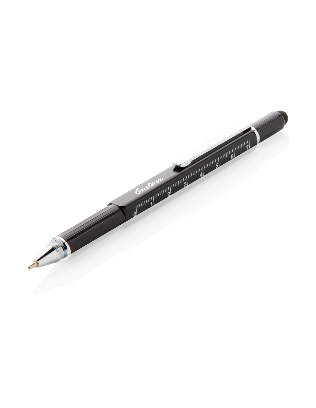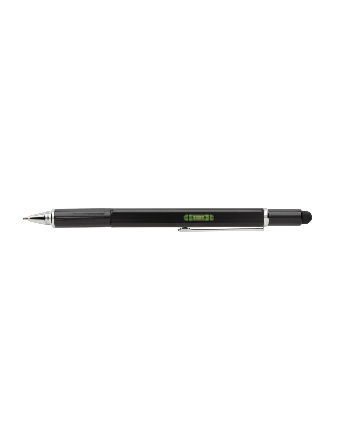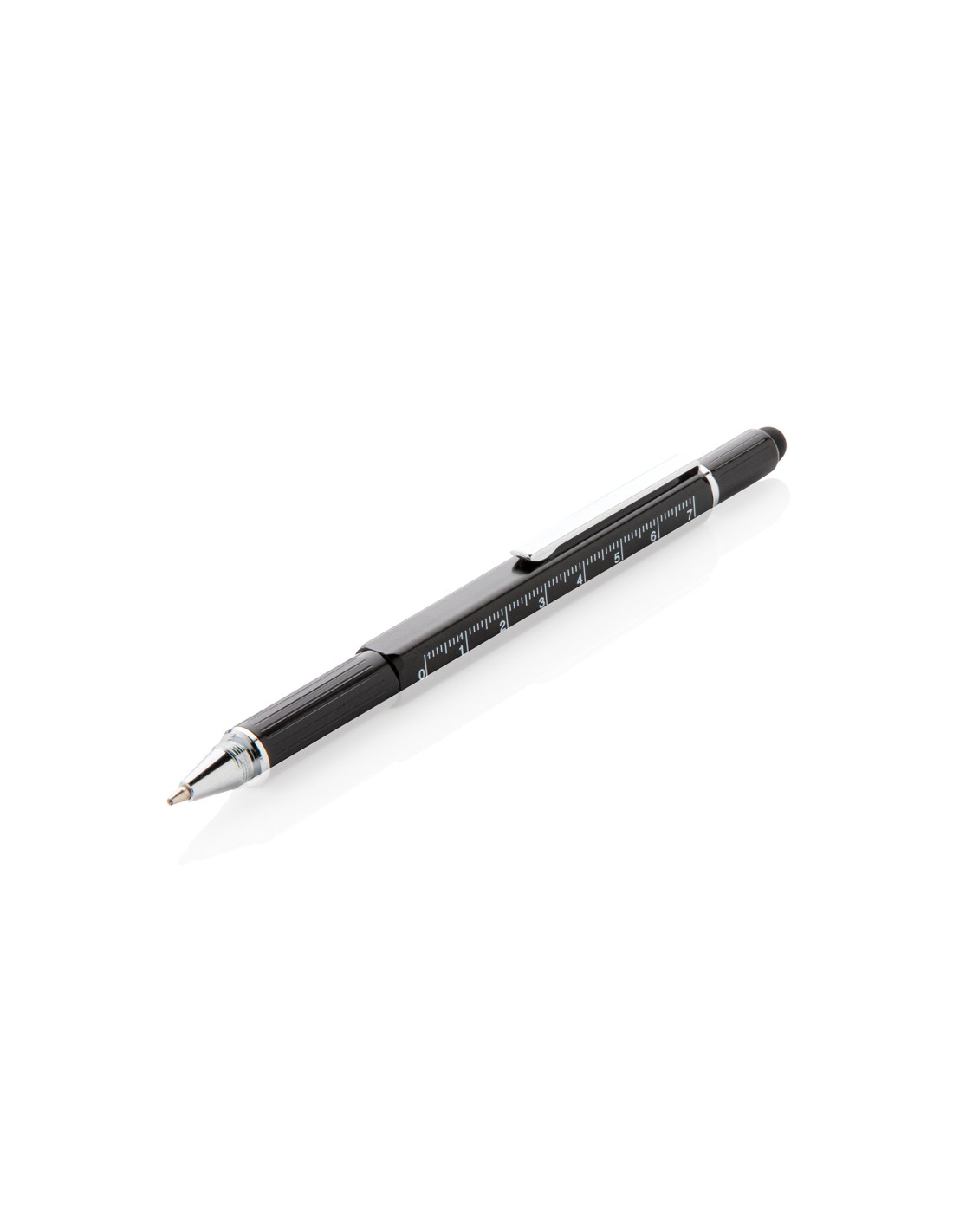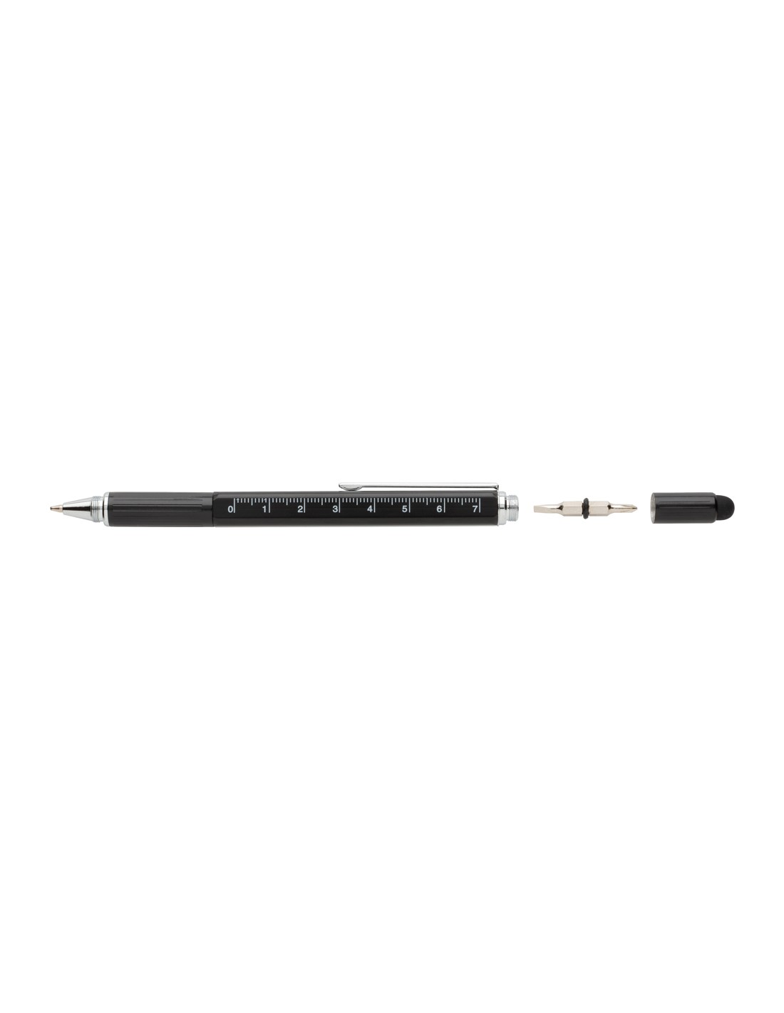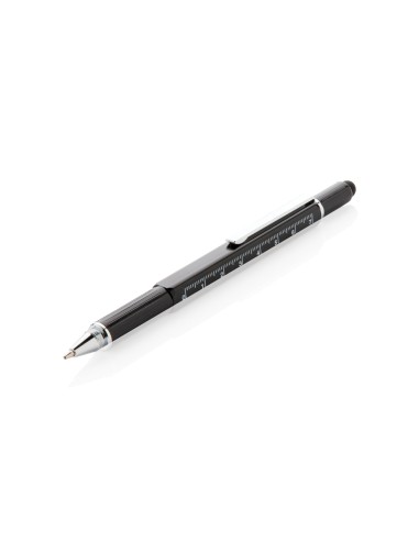 Penna multifunzione con righello (7cm), bolla, cacciavite, touchscreen e penna a sfera con inchiostro blu (400m). In ottone di alta qualità e clip in alluminio.