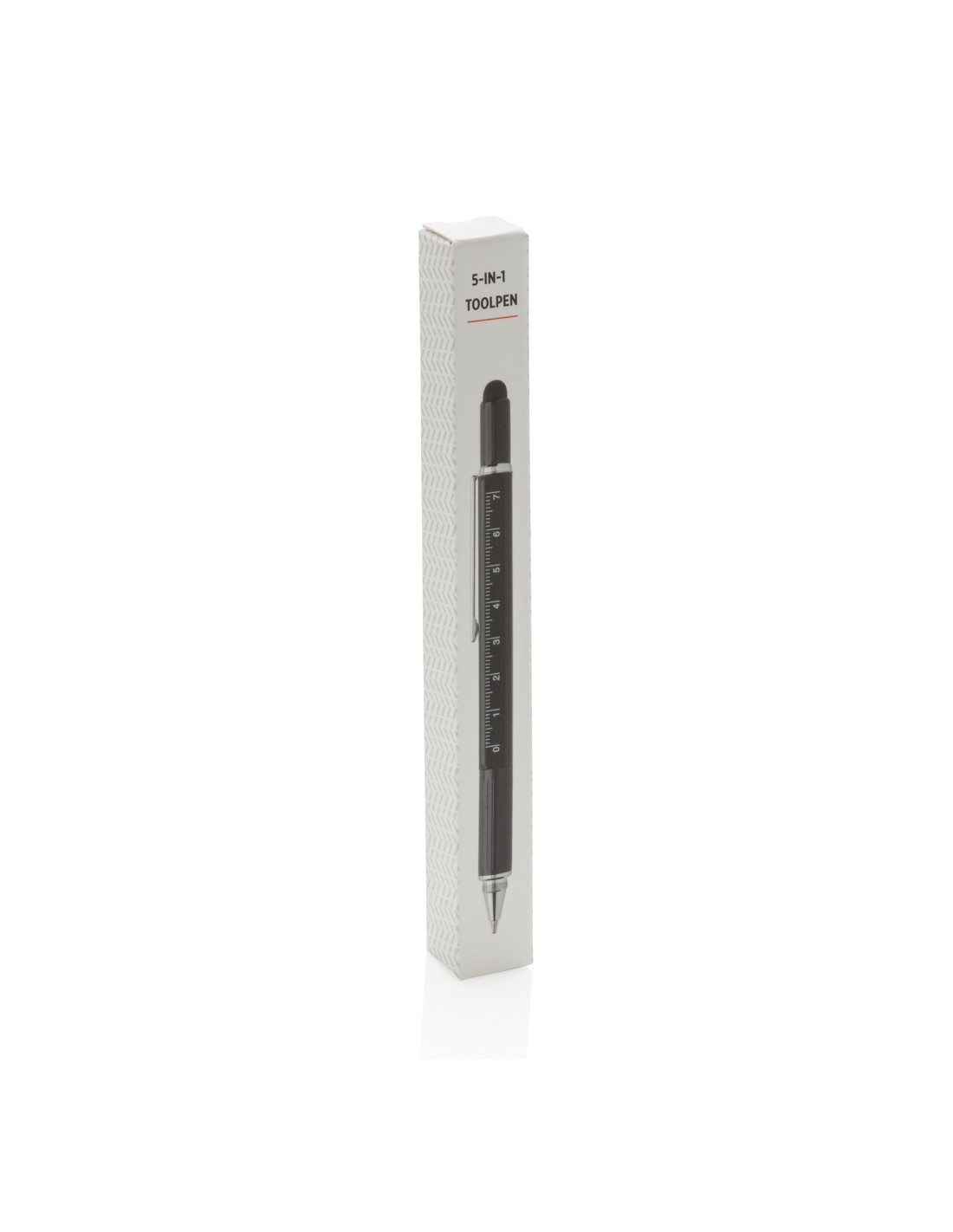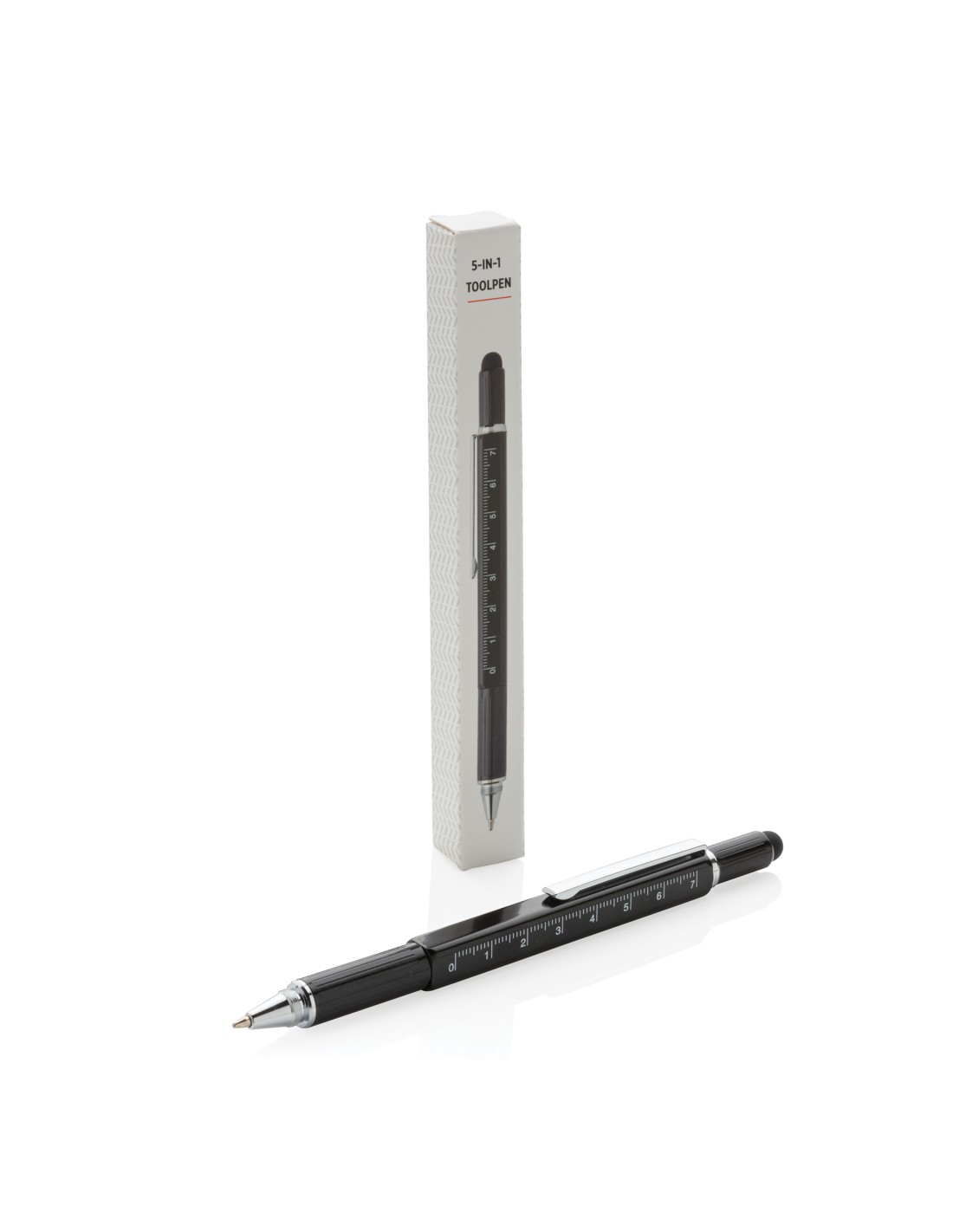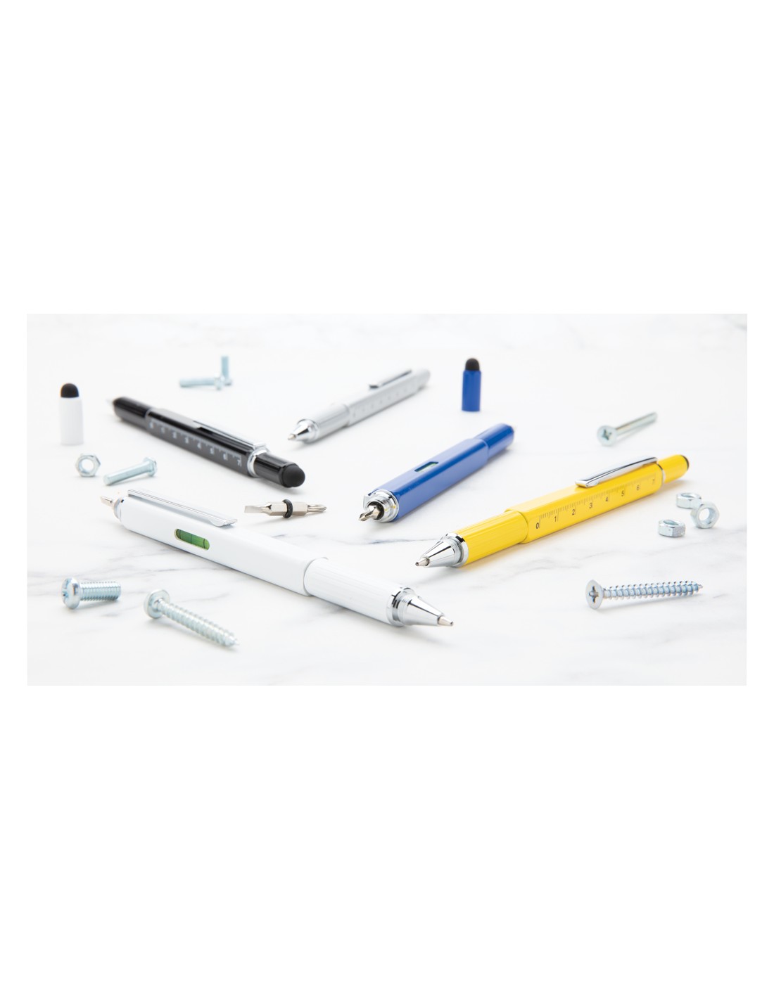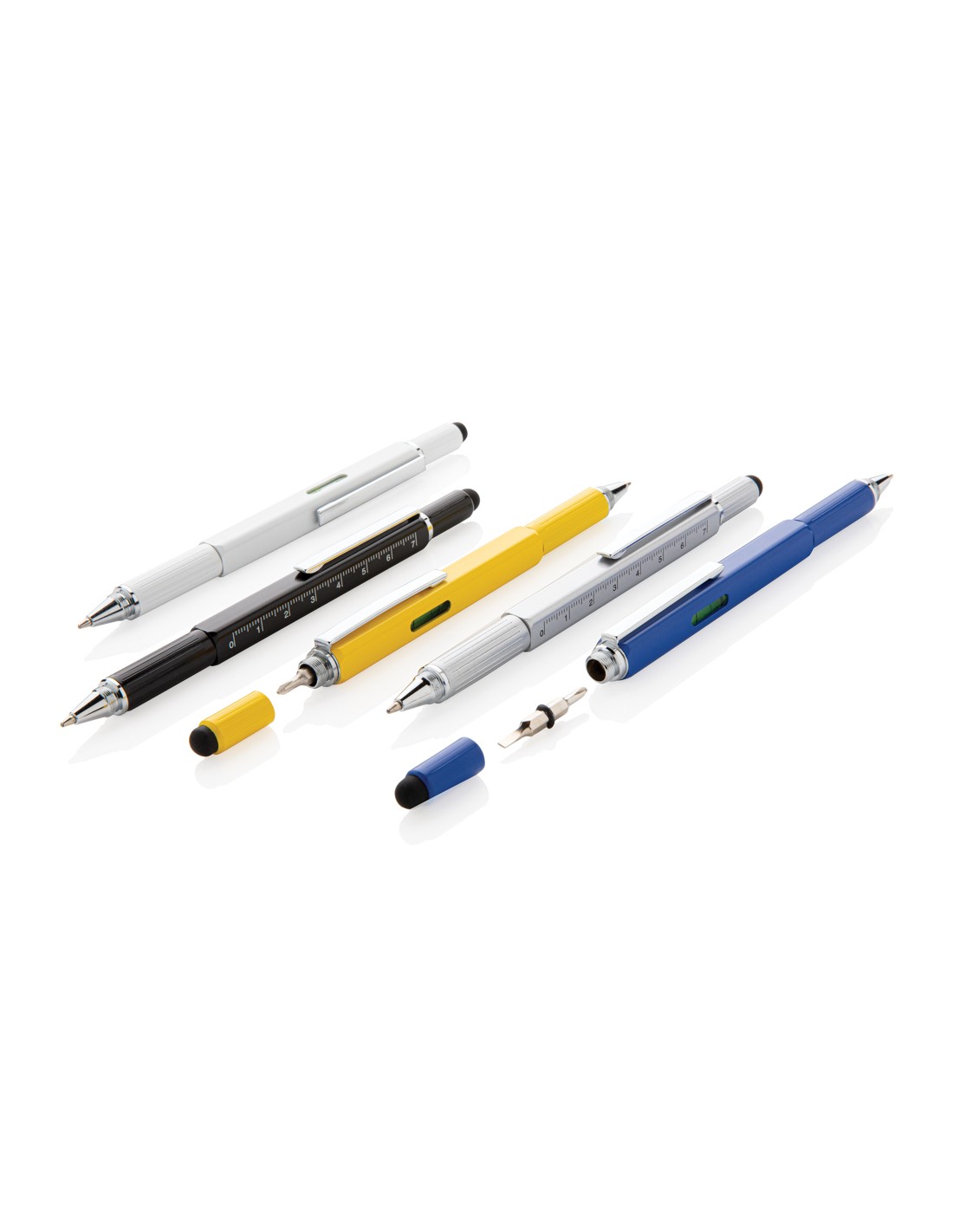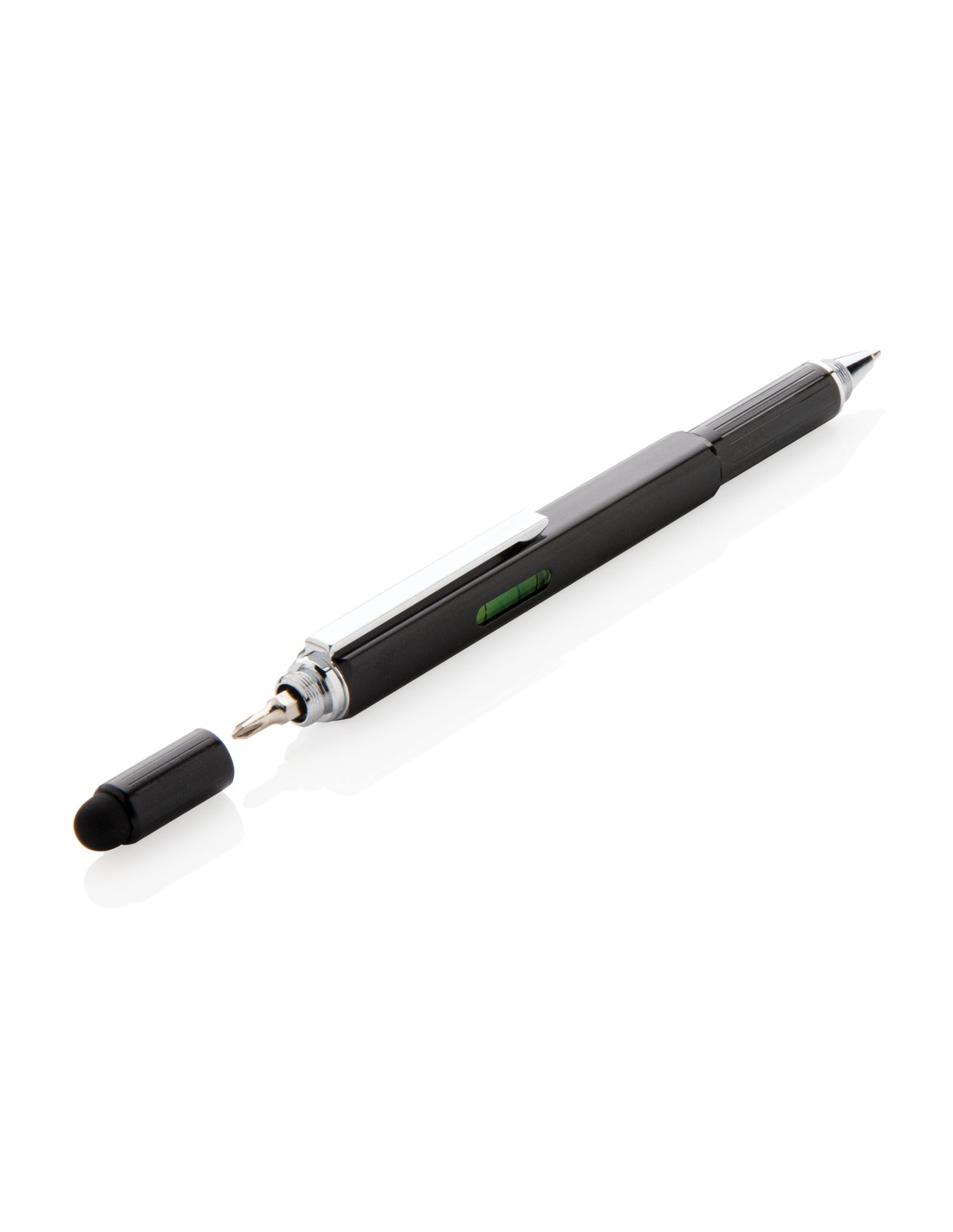 Penna multifunzione con righello (7cm), bolla, cacciavite, touchscreen e penna a sfera con inchiostro blu (400m). In ottone di alta qualità e clip in alluminio.