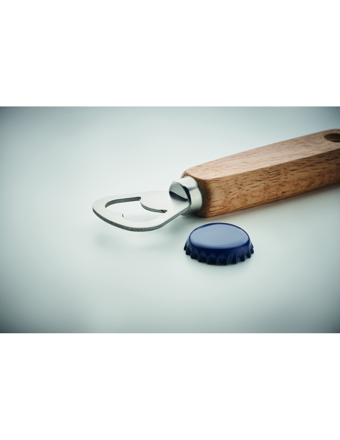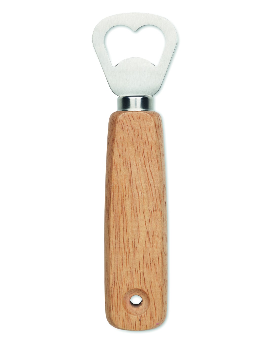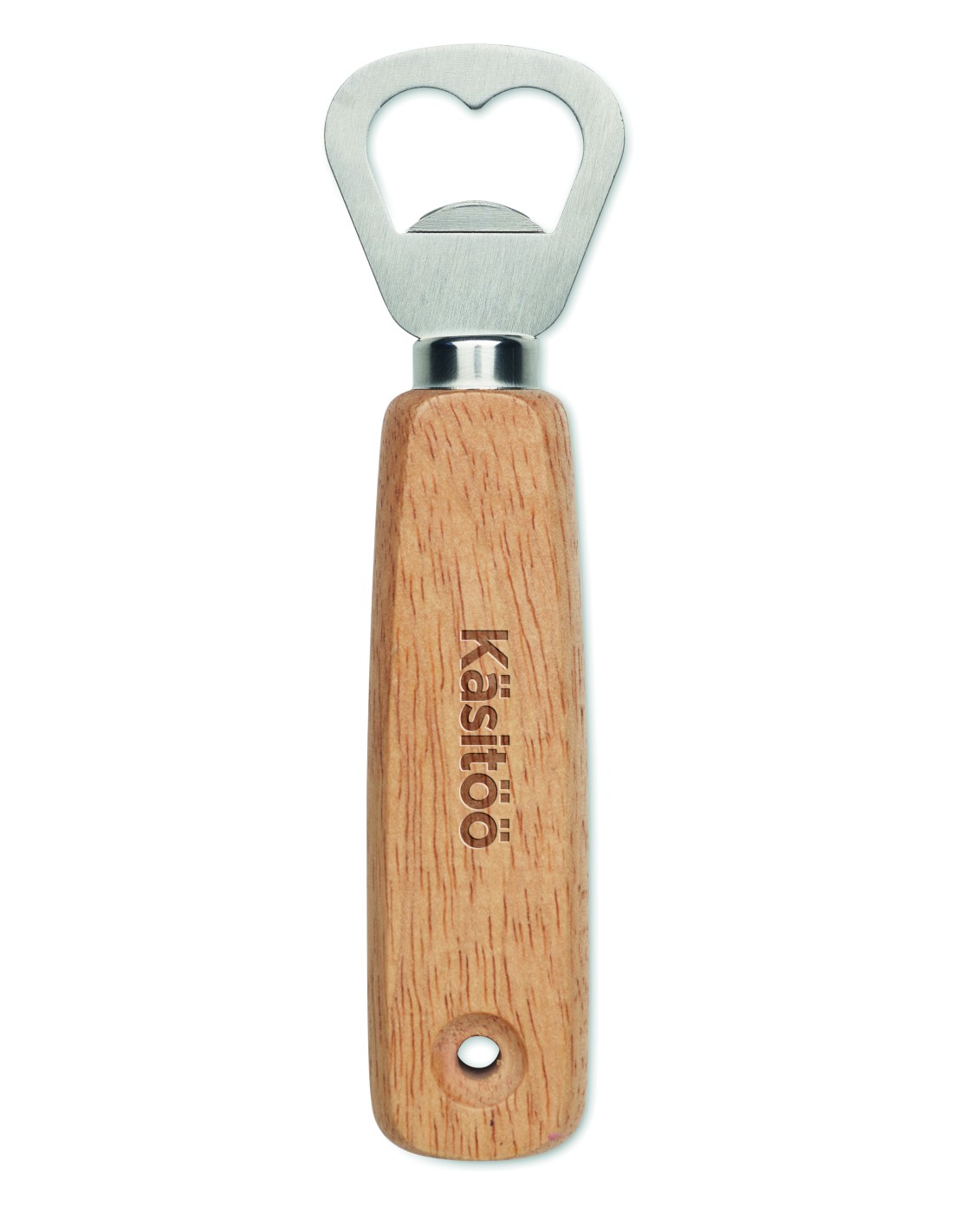 Apribottiglia a forma di paletta in legno e acciaio inossidabile. Con laccetto.