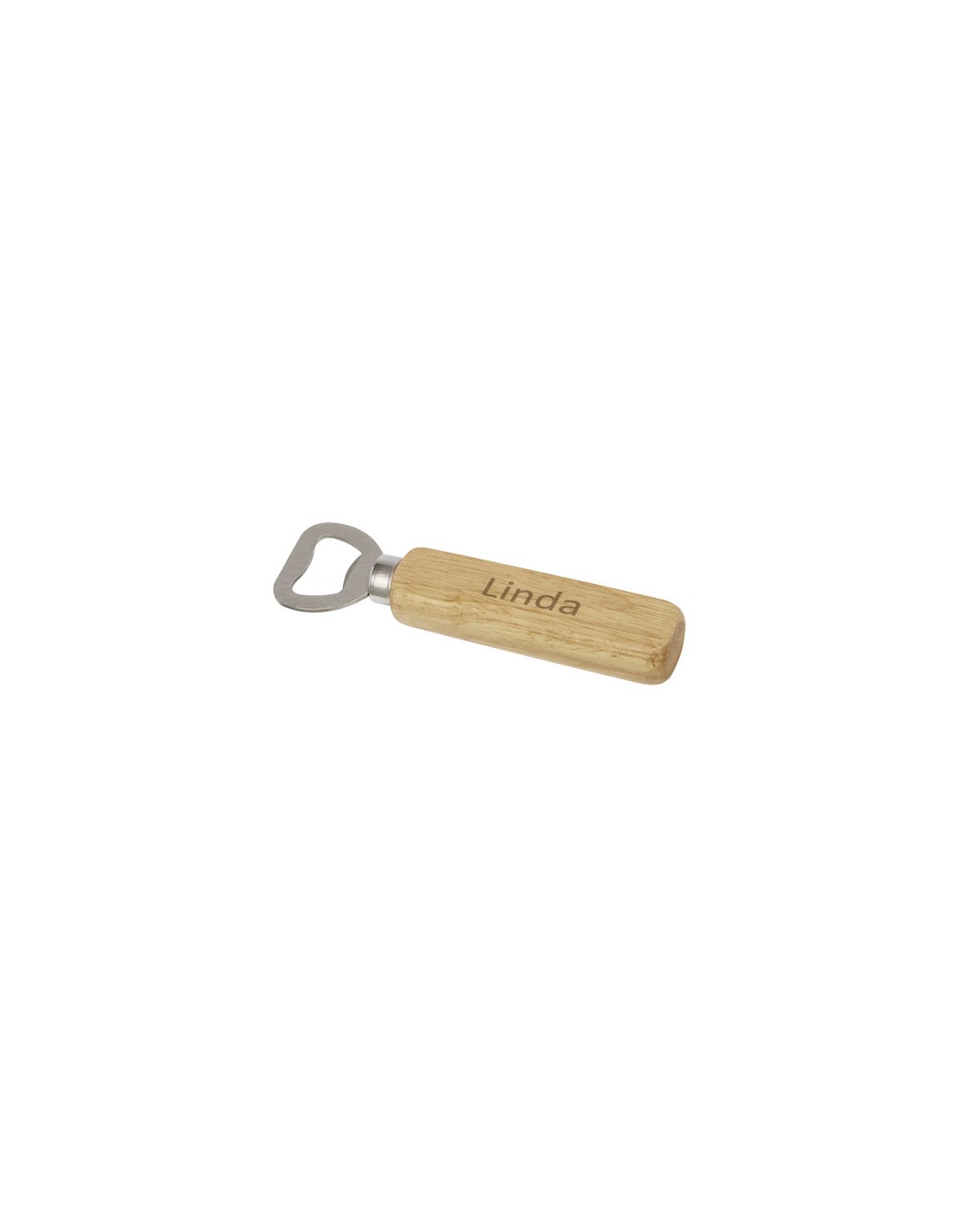 Apribottiglie realizzato in acciaio inossidabile con superficie in legno.