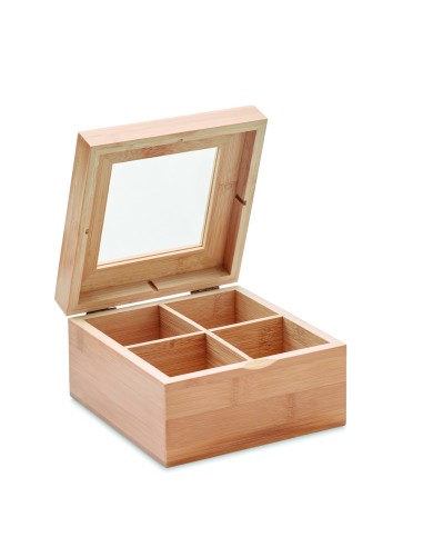 Scatola da thè in bamboo con coperchio in vetro trasparente. I 4 scomparti equamente divisi possono contenere 24 bustine di tè. Il bamboo è un prodotto naturale, potrebbero esserci lievi variazioni di colore e dimensioni da un articolo all'altro, che possono influire sul risultato finale della personalizzazione.