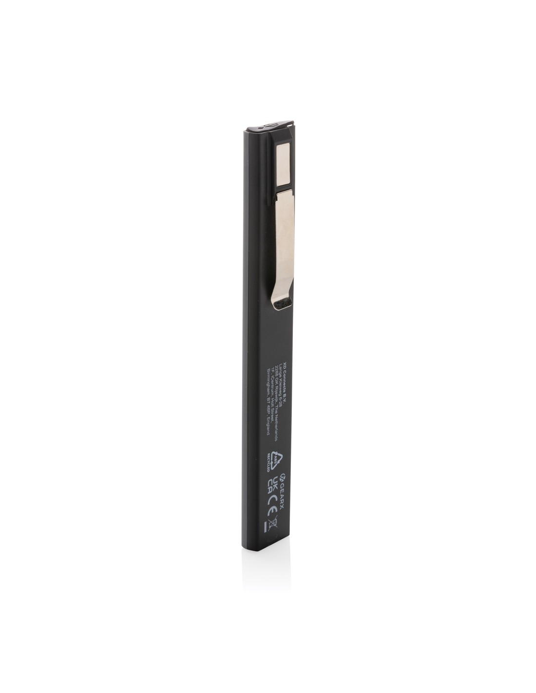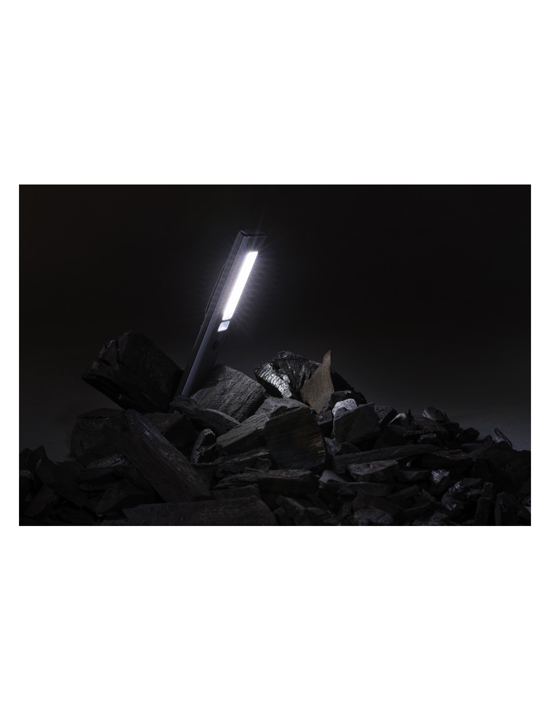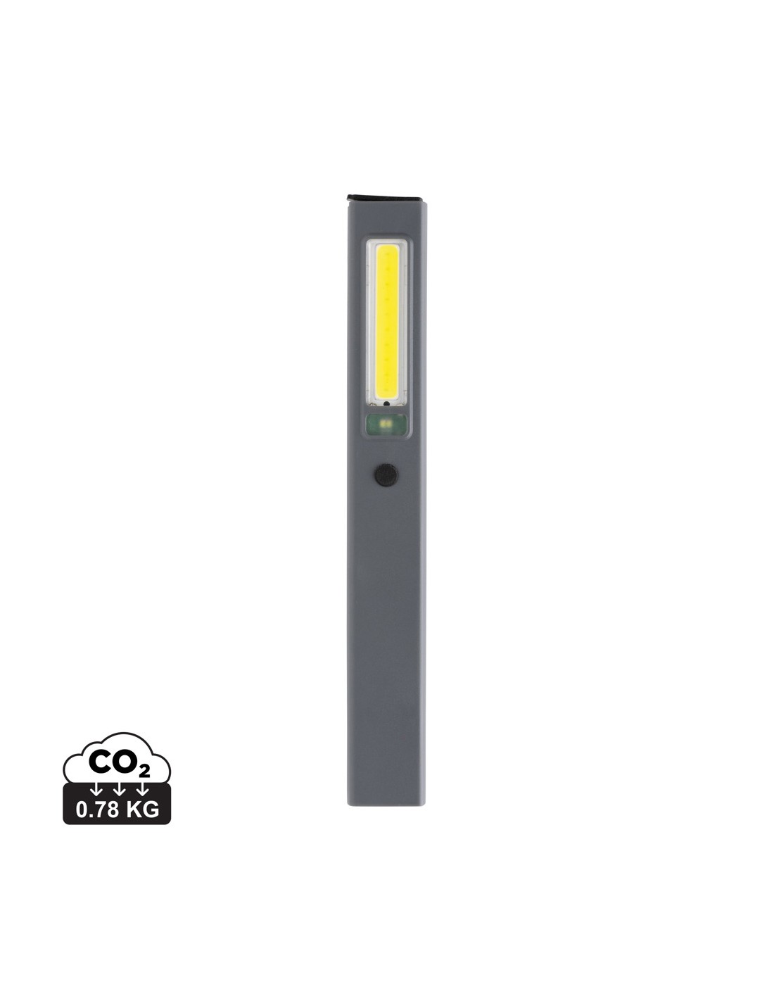 Luce da ispezione tascabile realizzata con plastica ABS riciclata certificata RCS. Contenuto riciclato totale: 33% in base al peso totale dell'articolo. La certificazione RCS garantisce una filiera completamente certificata dei materiali riciclati. La lampada da lavoro utilizza una batteria al litio ricaricabile di grado A da 520 mAh per cui non è necessario sostituire le batterie. È sufficiente ricaricarla tramite la presa USB e la base di ricarica inclusa. La lampada da lavoro è dotata di luce COB da 220 lumen e di una luce LED da 80 lumen. Con 3 modalità: LED, COB e COB rosso. Include clip per cintura e magnete. Con porta Type-C per la ricarica. Autonomia con una carica: 3 ore.