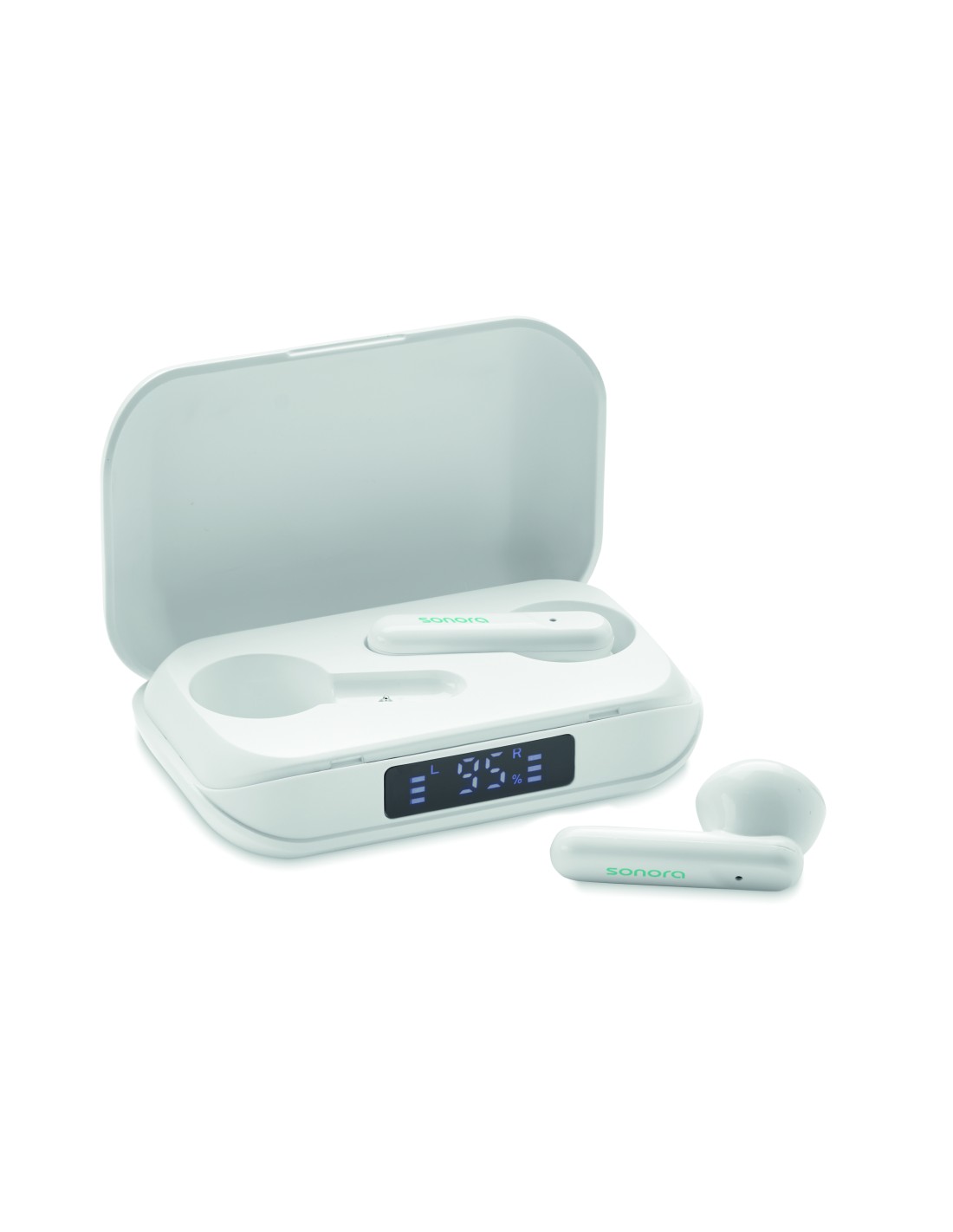 Auricolari stereo True Wireless Stereo, 5.3 in ABS, microfono e batteria da 30 mAh. Display LCD. Associazione automatica. Cavo di ricarica di tipo C e base di ricarica da 250 mAh.