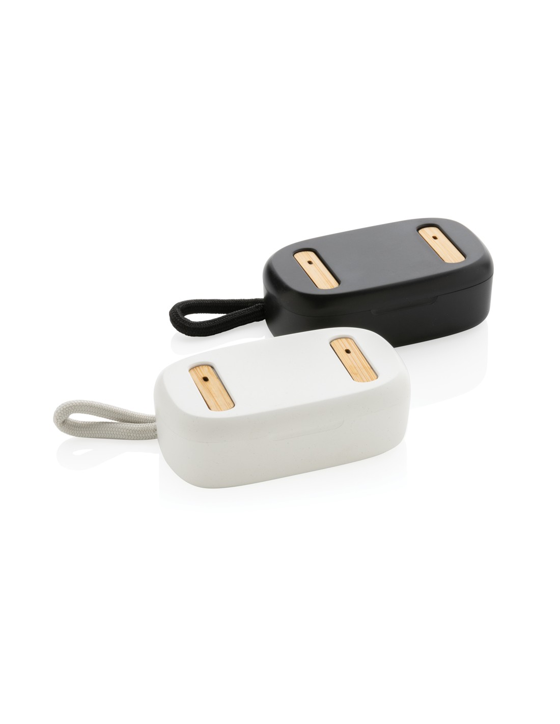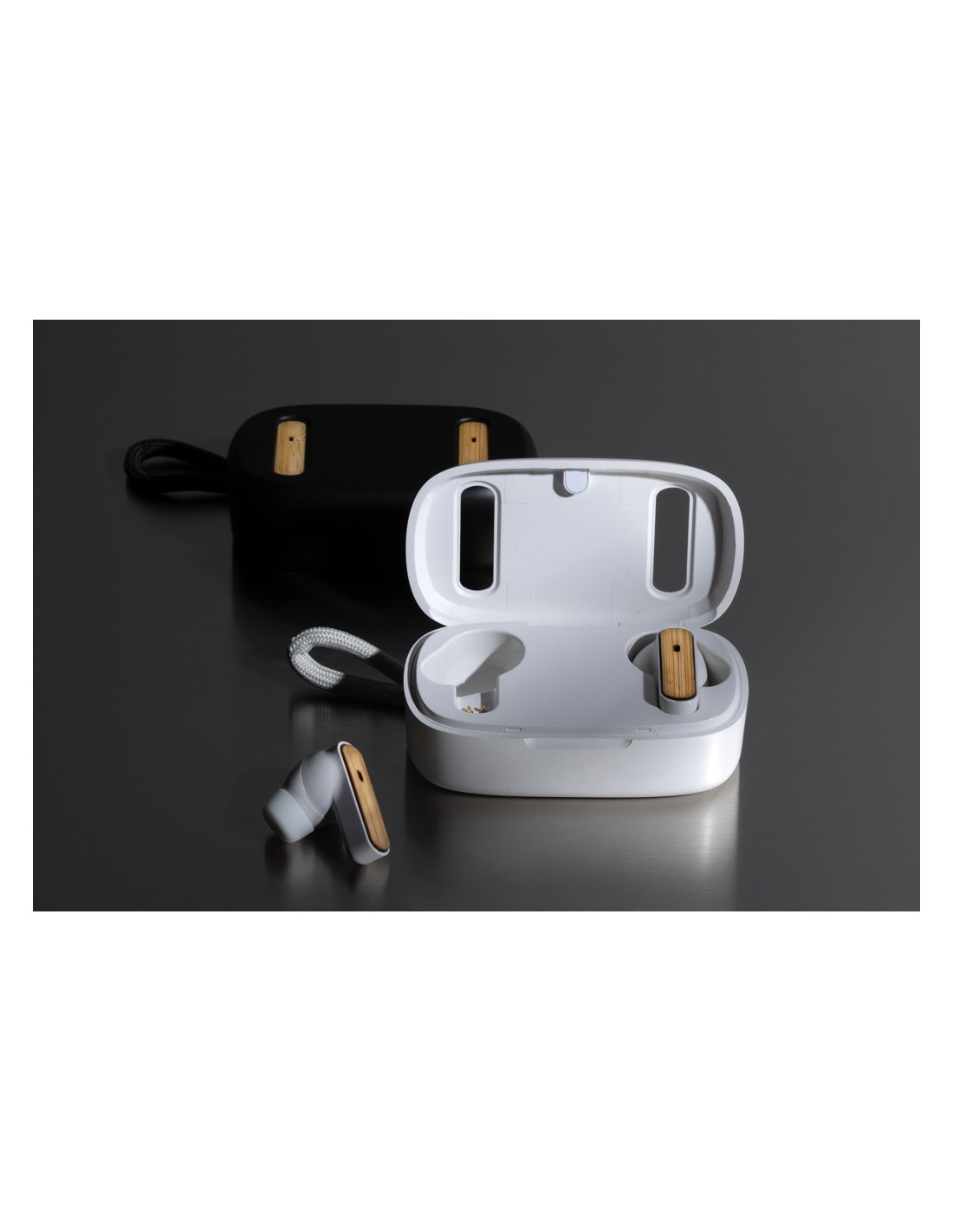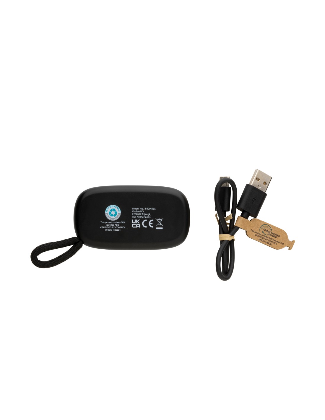 Set di 2 auricolari True Wireless Stereo (TWS) 5.3 con microfono e batteria da 30 mAh integrata. Durata di riproduzione di circa 3 ore. Associazione automatica. Include un cavo di ricarica micro USB e una stazione di ricarica da 185 mAh. Realizzato in ABS riciclato.