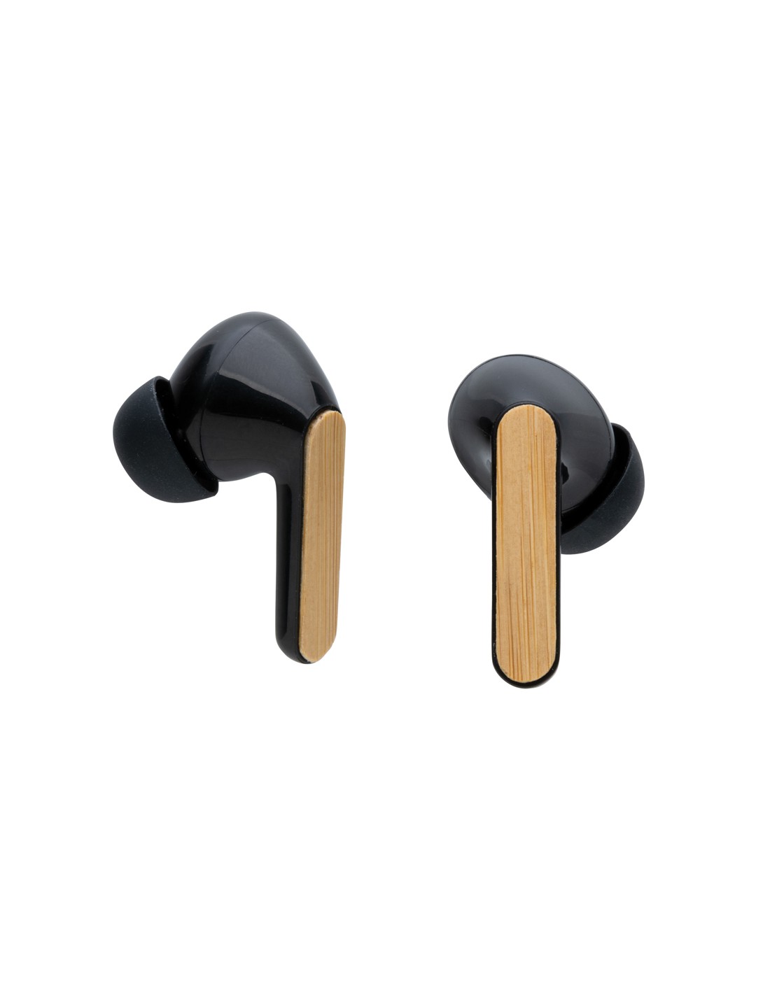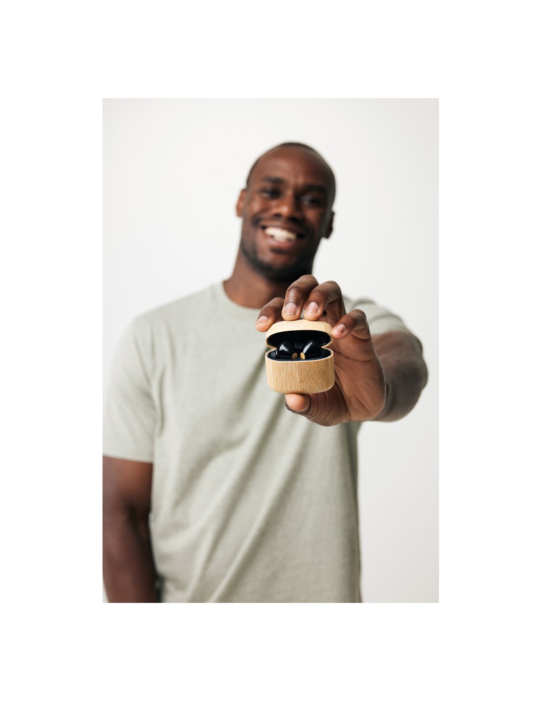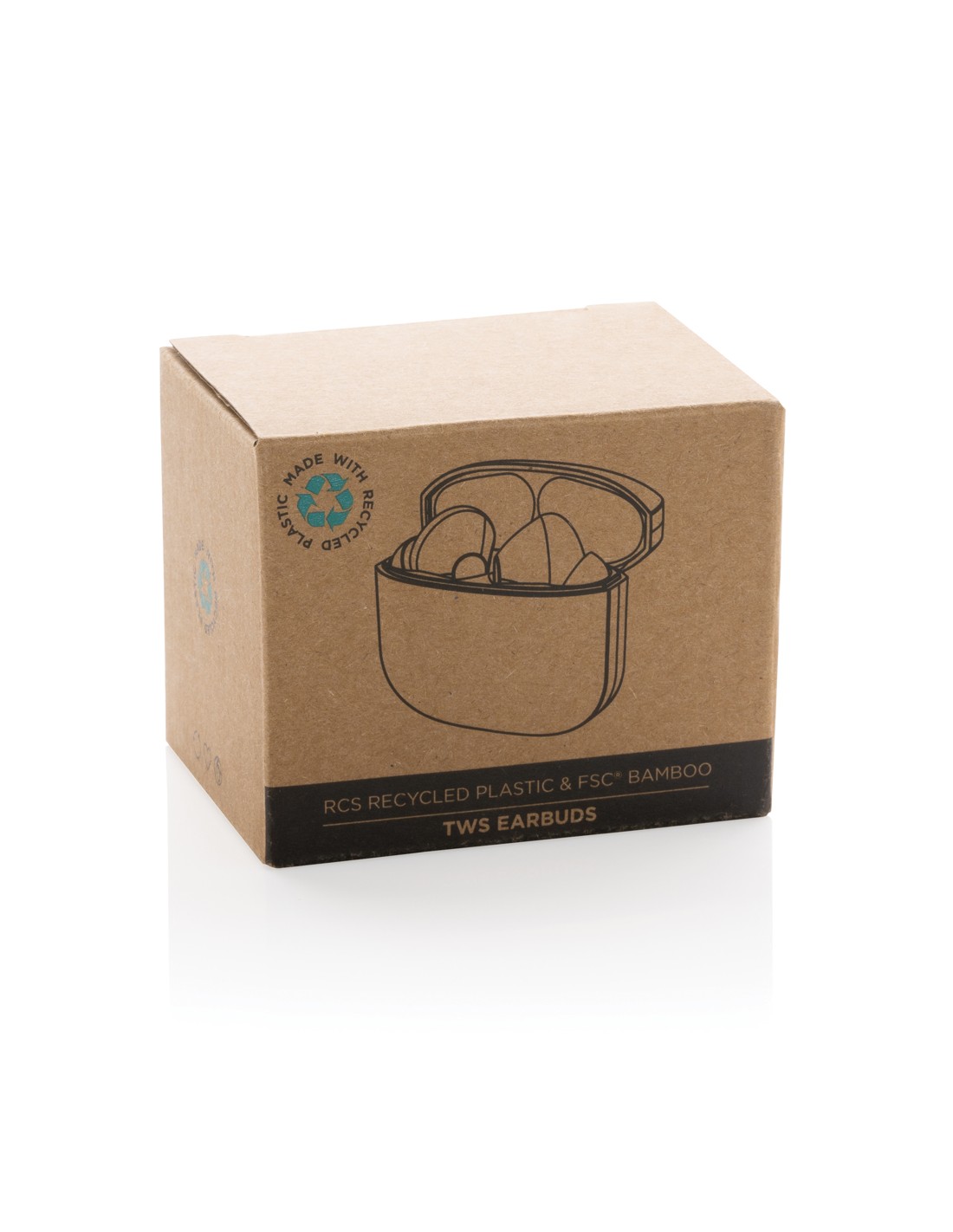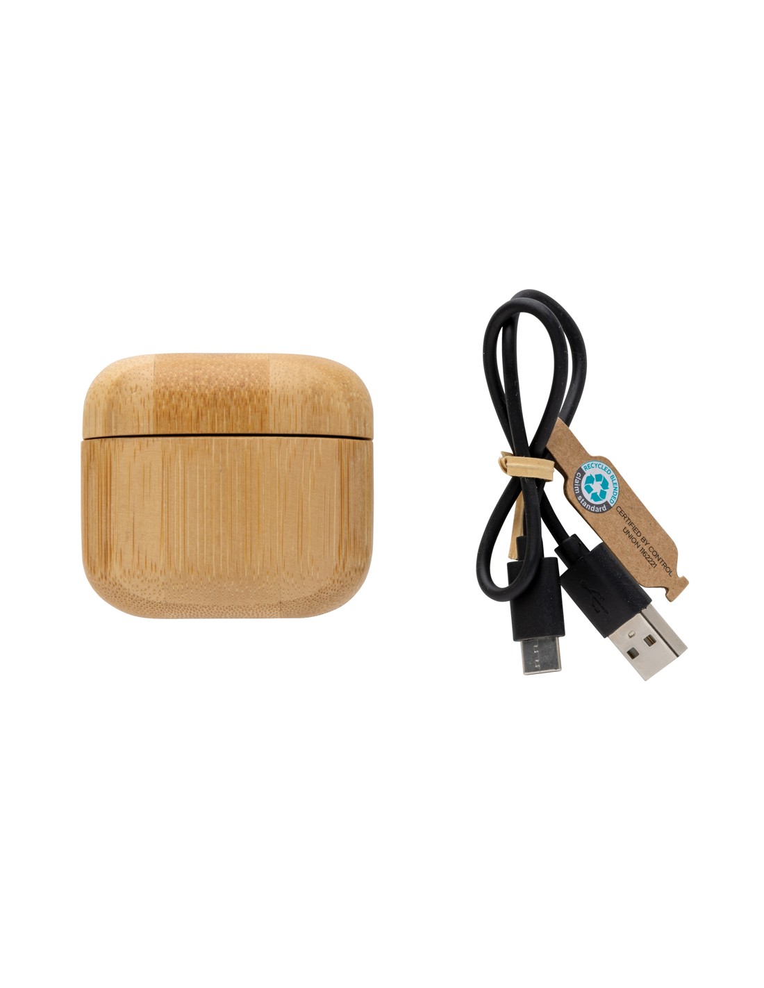 Auricolari true wireless con custodia in bambù. Gli auricolari e la custodia di ricarica sono realizzati con ABS riciclato certificato RCS (Recycled Claim Standard) e bambù FSC® al 100%. Contenuto riciclato totale: 28% in base al peso totale dell'articolo. La certificazione RCS garantisce una catena di approvvigionamento dei materiali riciclati completamente certificata. Gli auricolari, perfettamente aderenti, hanno una batteria da 40 mAh e possono essere ricaricati in un'ora nella custodia di ricarica da 400 mAh. La funzione di pairing automatico facilita il collegamento al dispositivo mobile. Autonomia di riproduzione a volume medio di circa 14 ore. Dotato di BT 5.3 per una connessione ottimale. Raggio d'azione fino a 10 metri. Funzione di risposta alle chiamate e microfono. Inclusi auricolari in silicone di 3 dimensioni. Cavo di ricarica in TPE riciclato certificato RCS. Imballato in confezione kraft FSC® mix. Articolo e accessori 100% senza PVC.