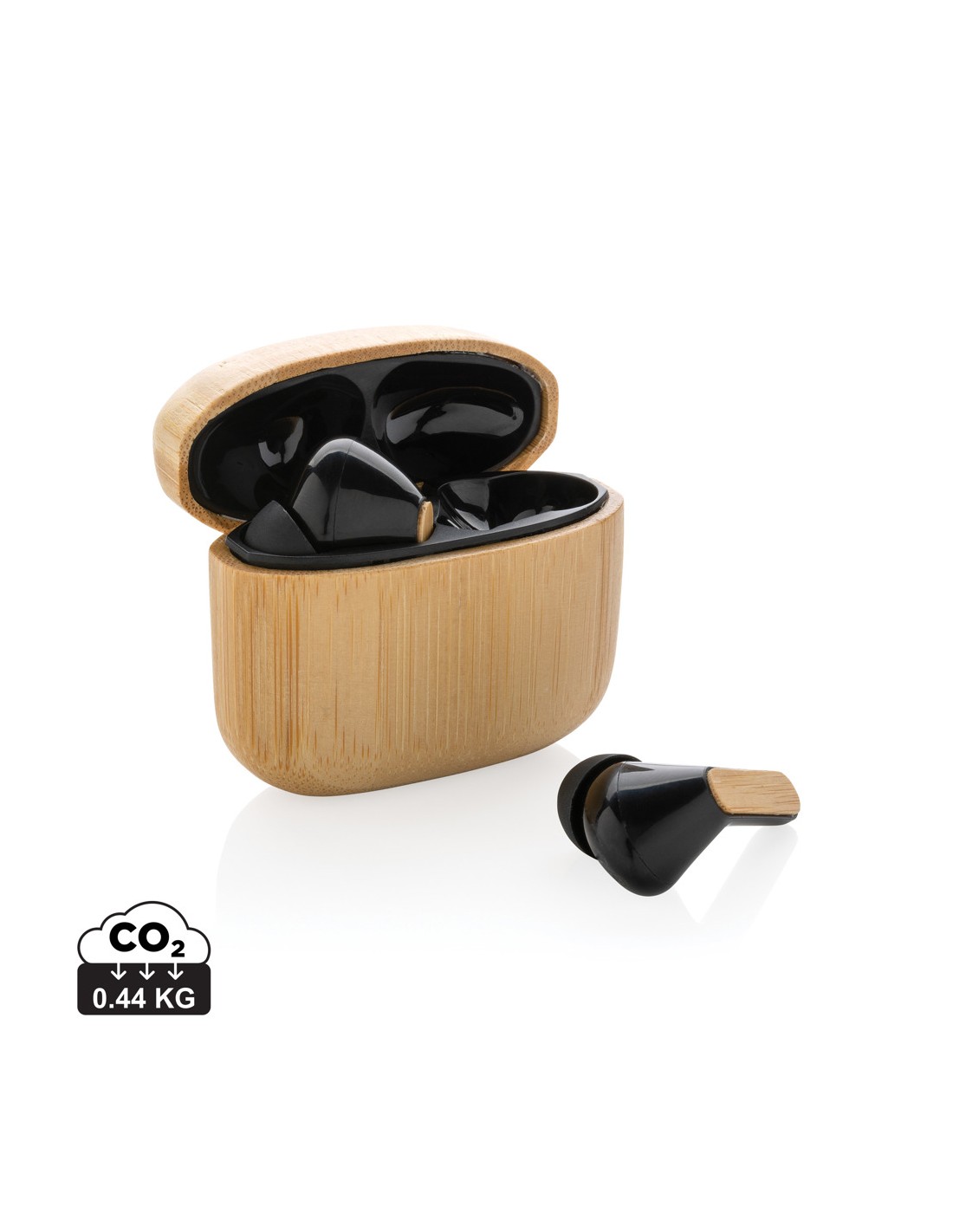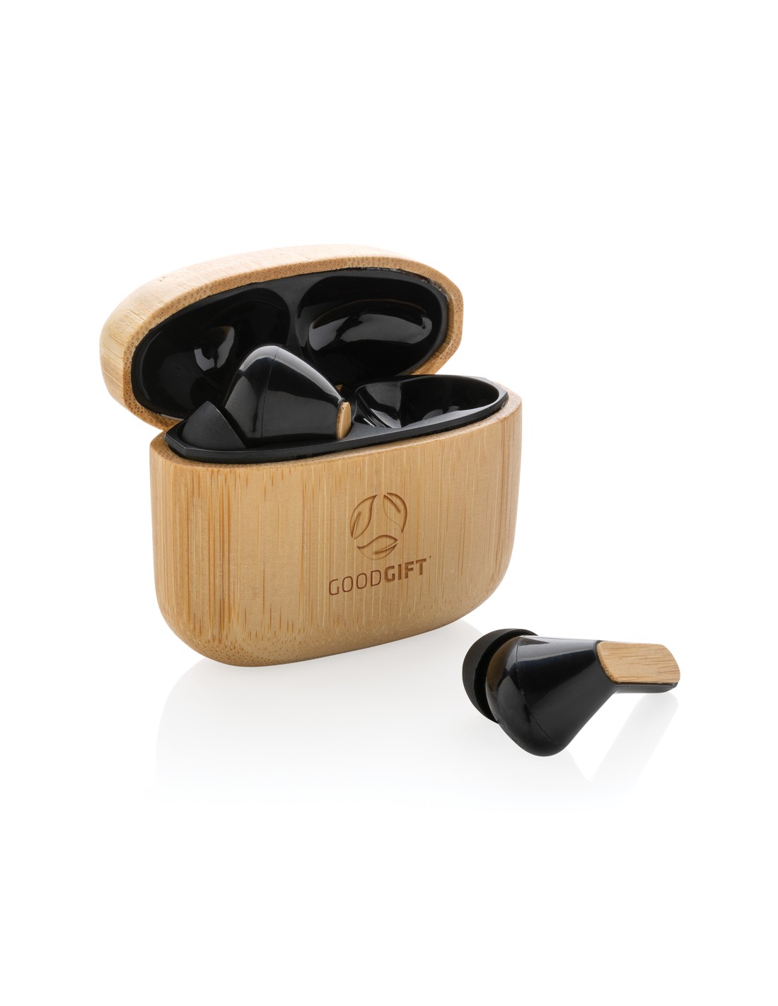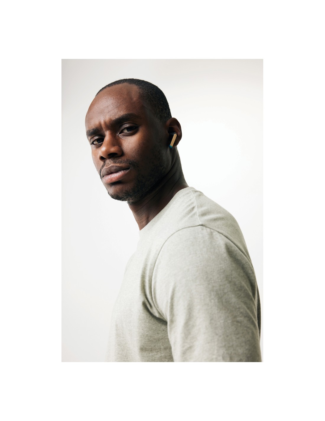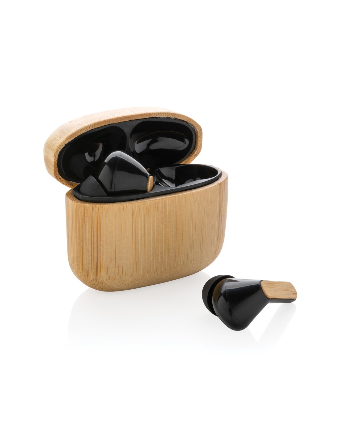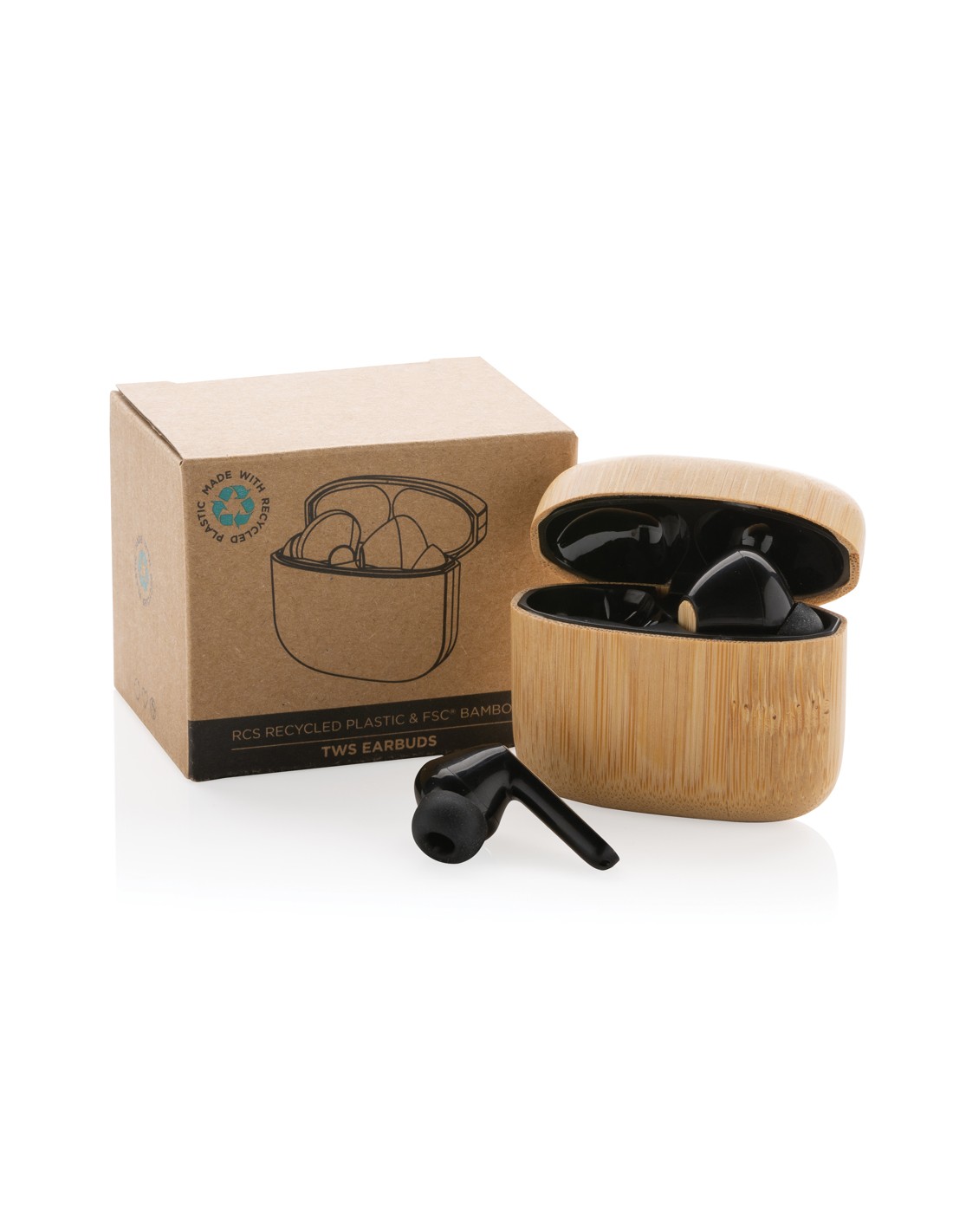 Auricolari true wireless con custodia in bambù. Gli auricolari e la custodia di ricarica sono realizzati con ABS riciclato certificato RCS (Recycled Claim Standard) e bambù FSC® al 100%. Contenuto riciclato totale: 28% in base al peso totale dell'articolo. La certificazione RCS garantisce una catena di approvvigionamento dei materiali riciclati completamente certificata. Gli auricolari, perfettamente aderenti, hanno una batteria da 40 mAh e possono essere ricaricati in un'ora nella custodia di ricarica da 400 mAh. La funzione di pairing automatico facilita il collegamento al dispositivo mobile. Autonomia di riproduzione a volume medio di circa 14 ore. Dotato di BT 5.3 per una connessione ottimale. Raggio d'azione fino a 10 metri. Funzione di risposta alle chiamate e microfono. Inclusi auricolari in silicone di 3 dimensioni. Cavo di ricarica in TPE riciclato certificato RCS. Imballato in confezione kraft FSC® mix. Articolo e accessori 100% senza PVC.