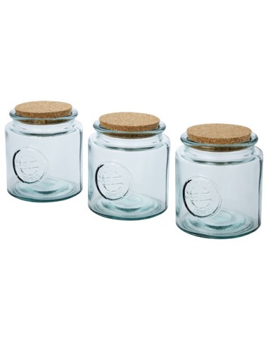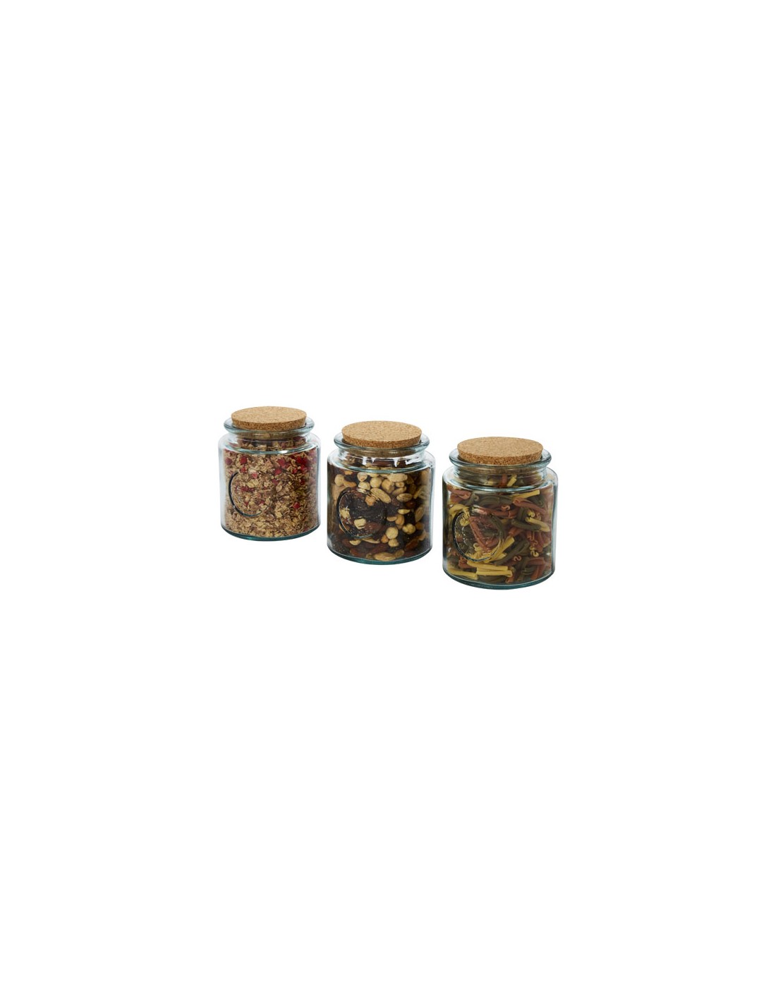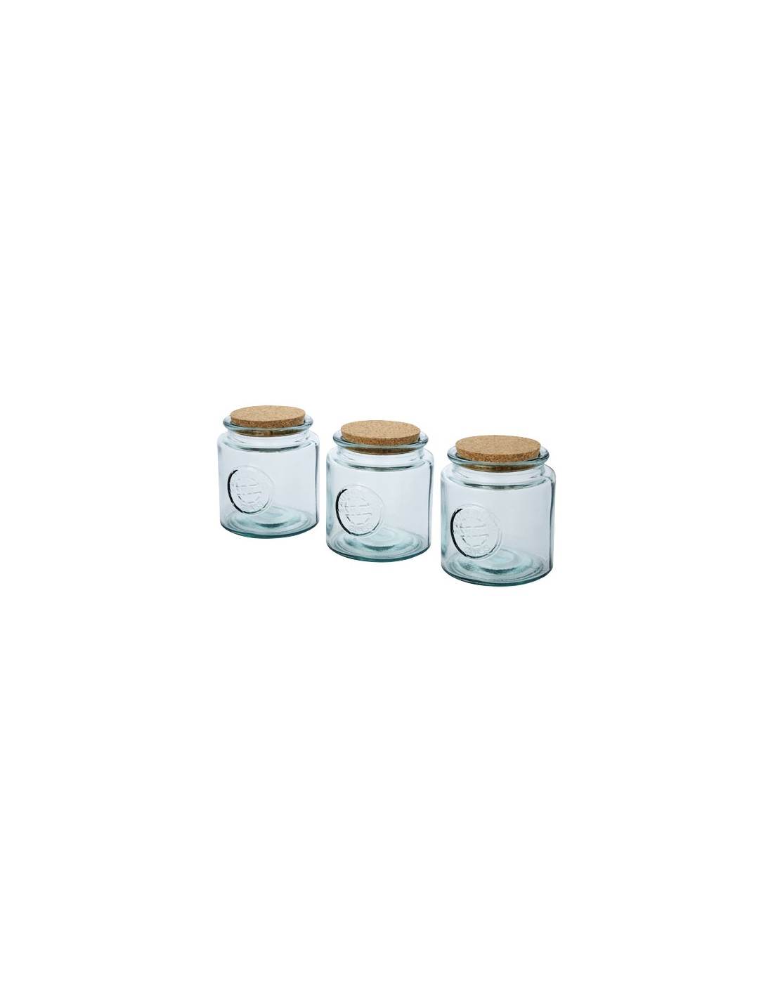 Il set di 3 pezzi in vetro riciclato è composto da tre barattoli da 800 ml con coperchio in sughero. Set ottenuto da 3 bottiglie di vetro. Il vetro riciclato viene prodotto utilizzando meno energia, materie prime e additivi rispetto a quanto richiesto per la produzione di vetro tradizionale. Dimensioni dei barattoli: altezza 13 cm, diametro 12 cm.