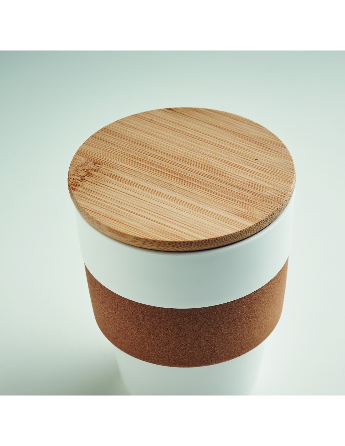 Bicchiere monosrato in PP con guaina protettiva in sughero e coperchio in bambù. Capacità: 300 ml. Essendo una tazza a singolo strato, è possibile che si verifichi un trasferimento di calore.