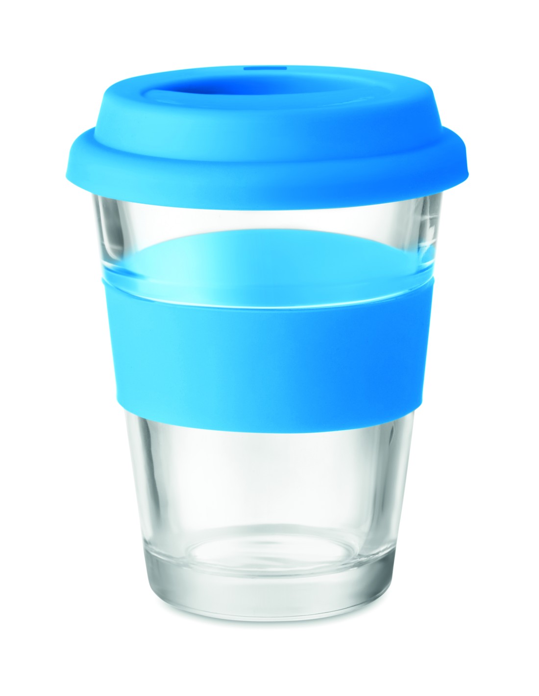 Bicchiere in vetro con tappo e impugnatura in silicone. L'articolo può surriscaldarsi perché ha un solo strato. 350ml.