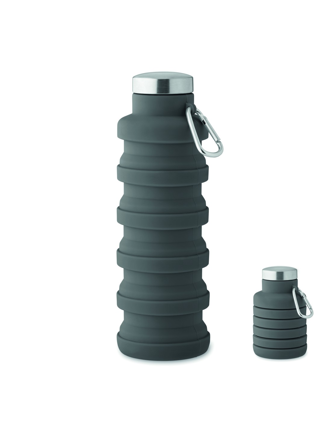 Bottiglia pieghevole in silicone con coperchio in acciaio inox e moschettone in alluminio. Il moschettone non è adatto all'arrampicata (uso non professionale). Capacità: 500 ml.