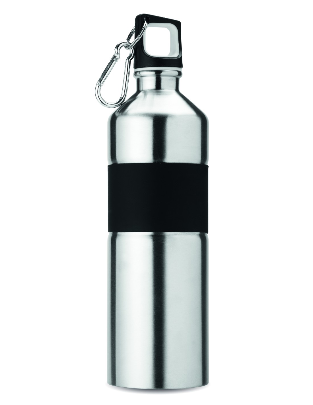 Bottiglia bicolore in acciaio inossidabile e fascia in gomma con moschettone. Capacità 750 ml. Il moschettone non è ad uso professionale. Antigoccia. Poiché si tratta di una bottiglia a parete singola, si può verificare il trasferimento di calore.