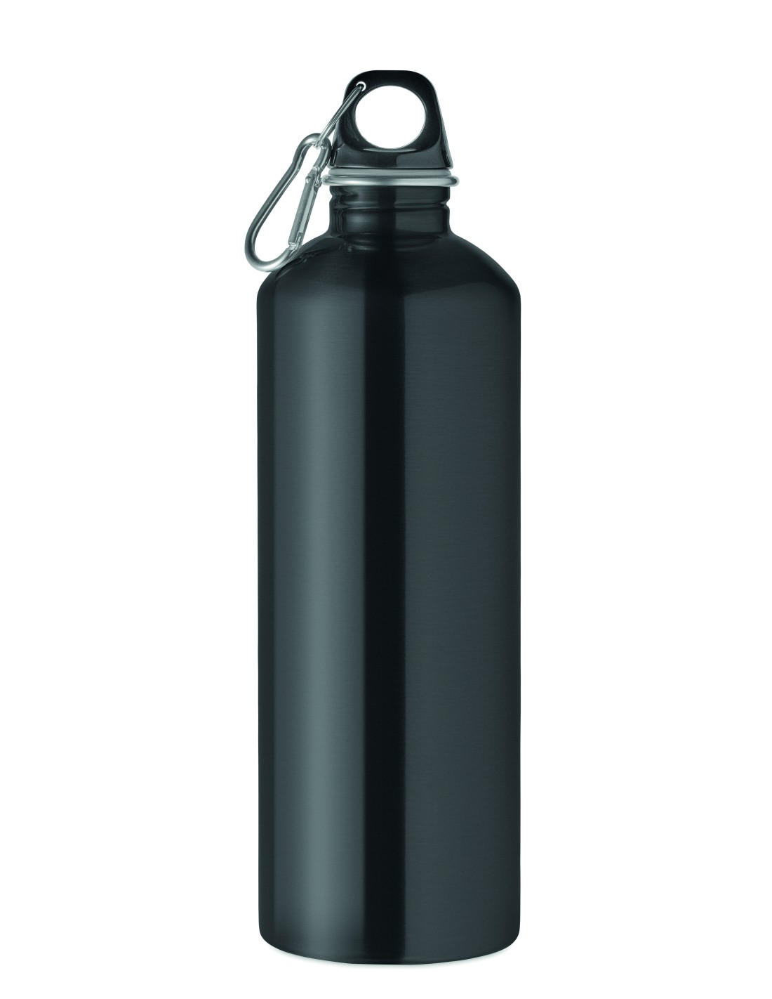 Bottiglia a singolo strato (90% acciaio inox riciclato e 10% acciaio inox) con coperchio in PP e moschettone. Capacità 1000 ml. Trattandosi di un singolo strato, fare attenzione a non scottarsi.