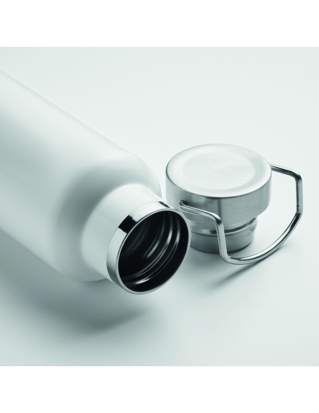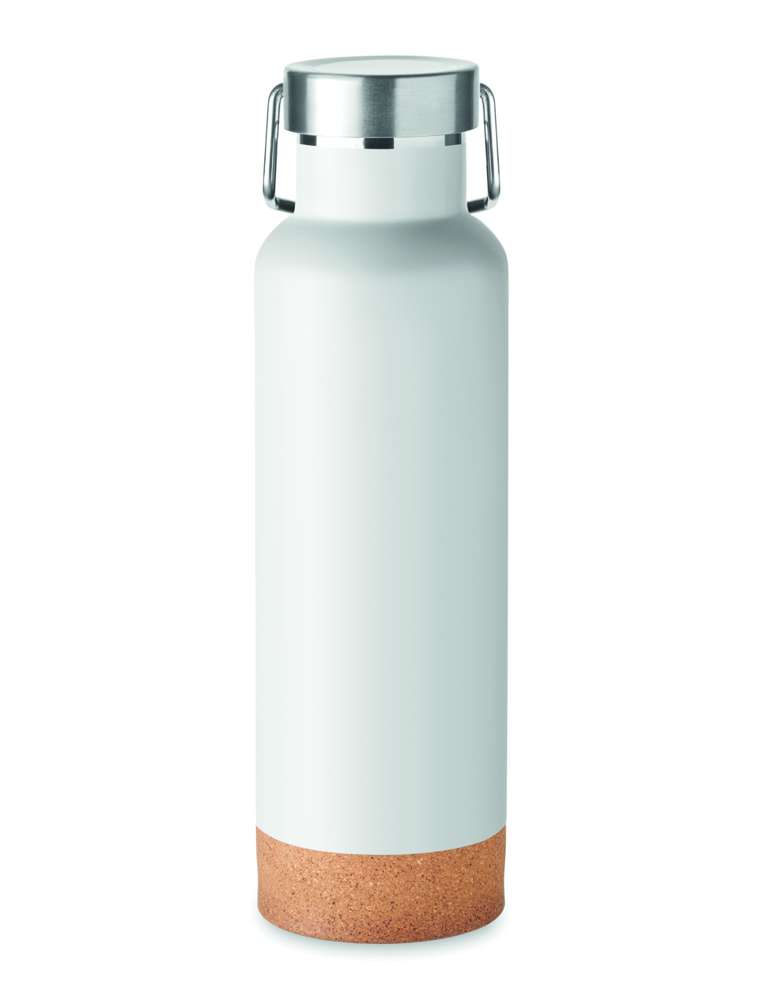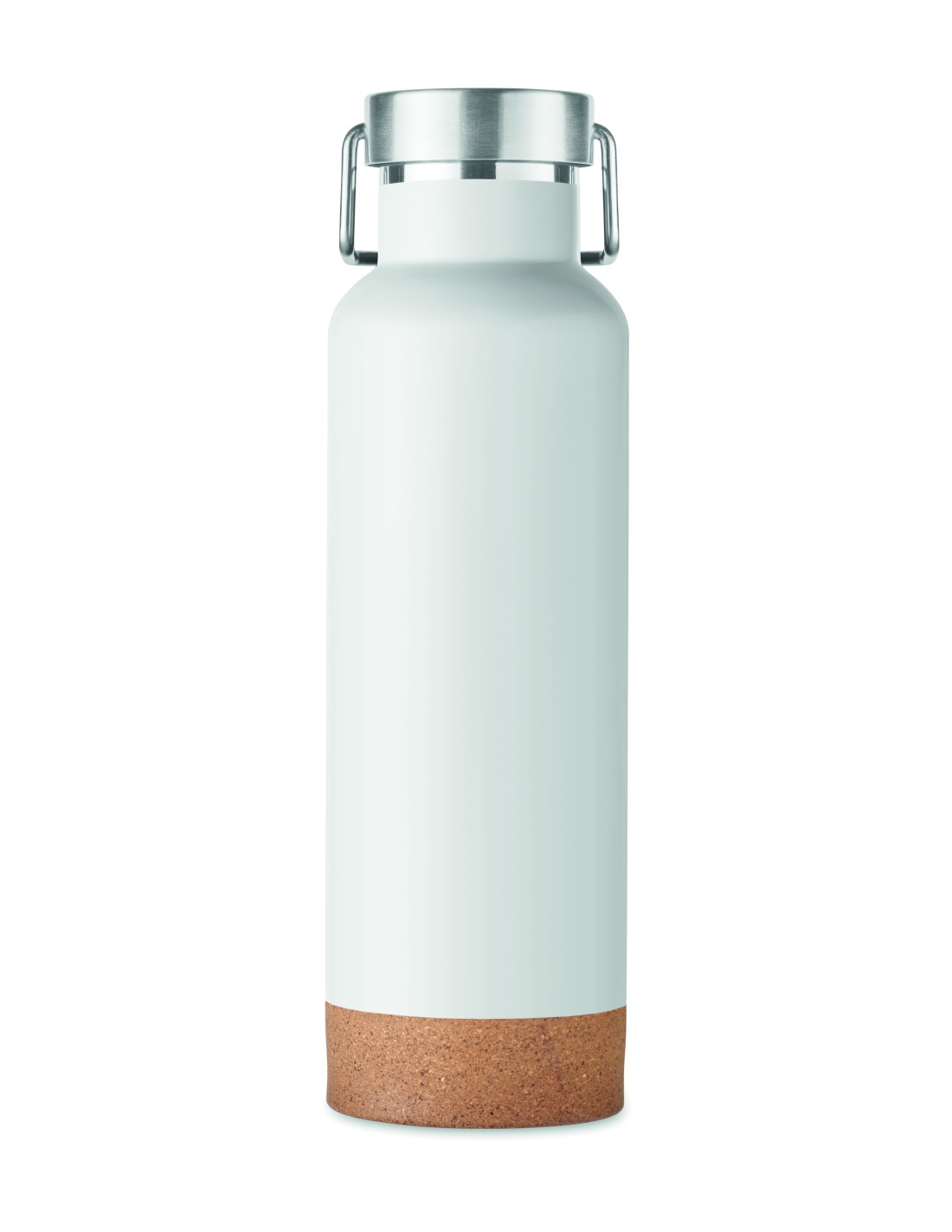 Bottiglia a doppio strato isolata sottovuoto in acciaio inox riciclato con coperchio a maniglia e base con dettagli in sughero. Senza perdite. Capacità: 500 ml. (90% acciaio inox riciclato e 10% acciaio inox).
