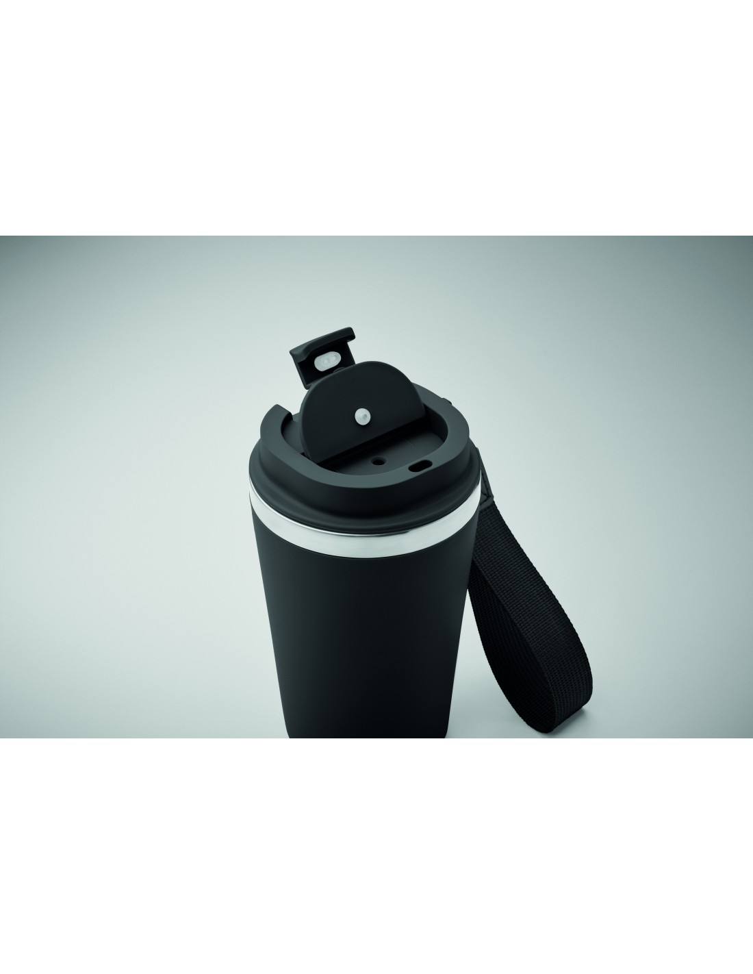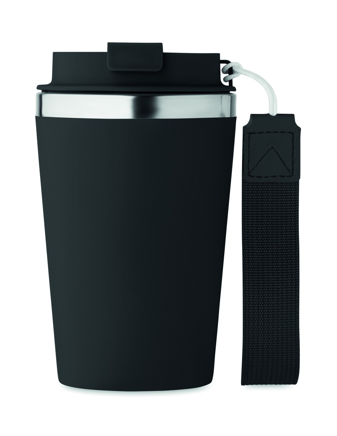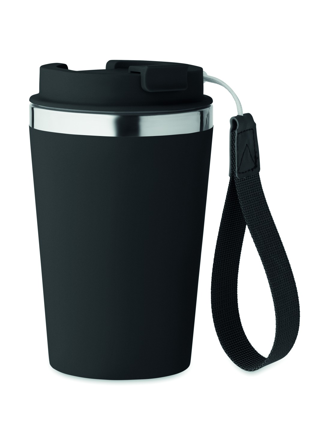 Bicchiere a doppio strato in acciaio inox riciclato (90% acciaio inox riciclato e 10% acciaio inox) con strato esterno in PP e cinturino in RPET. Capacità: 350 ml.
