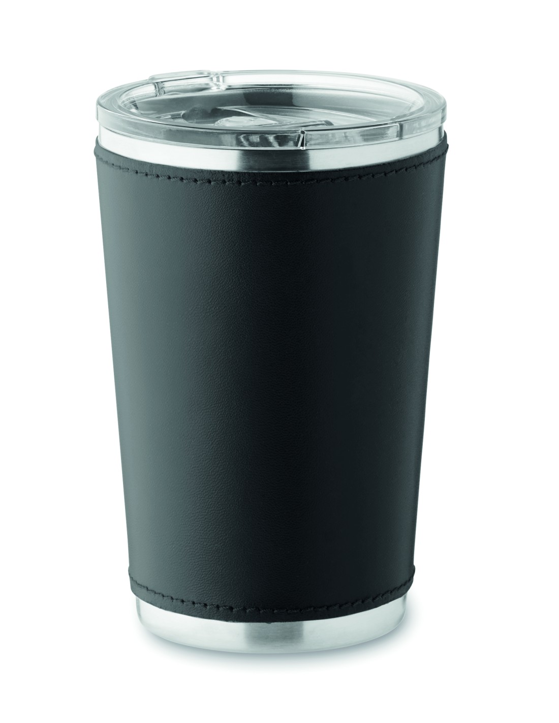 Bicchiere a doppio strato in acciaio inossidabile riciclato (90% acciaio inossidabile riciclato e 10% acciaio inossidabile) con custodia rimovibile in pelle PU. Coperchio con foro di sorseggio scorrevole. Senza perdite. Capacità: 350 ml.