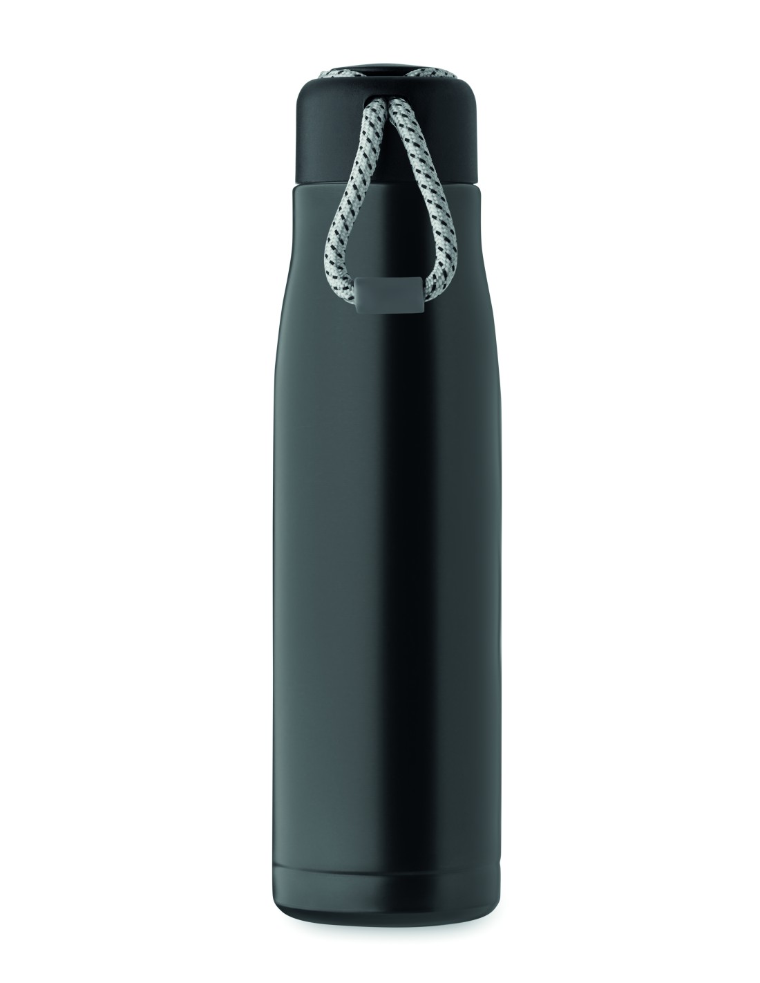 Bottiglia sottovuoto isolata a doppio strato in acciaio inox riciclato (90% acciaio inox riciclato e 10% acciaio inox) con impugnatura a corda integrata sul coperchio in PP. Senza perdite. Capacità: 500 ml.