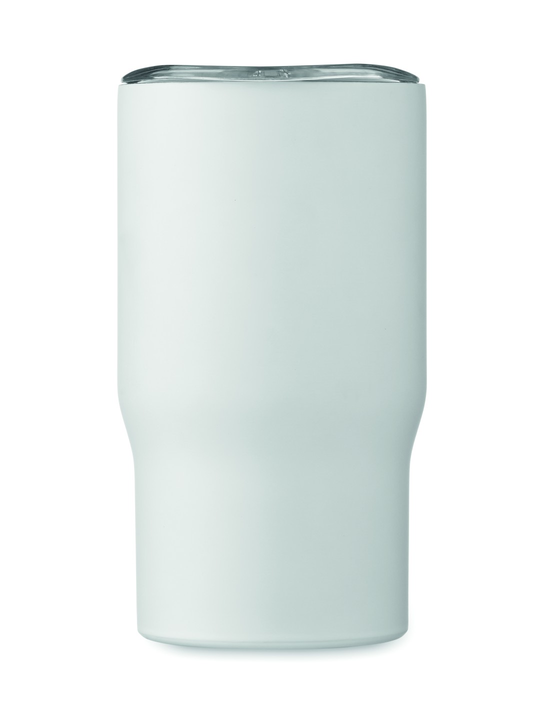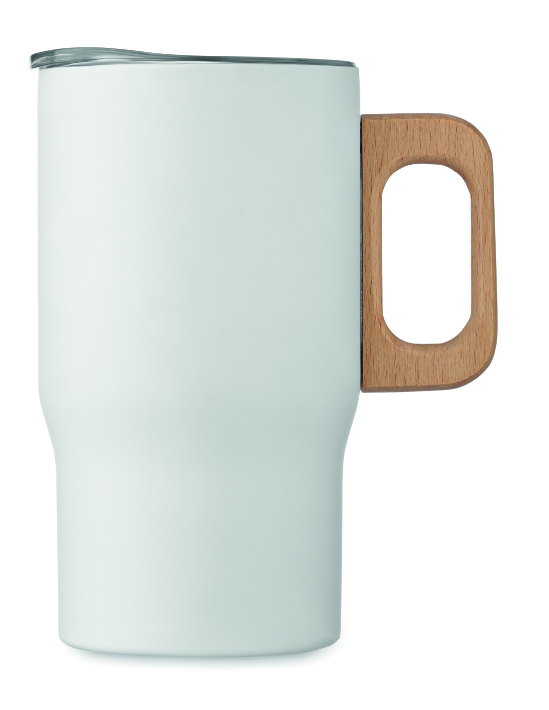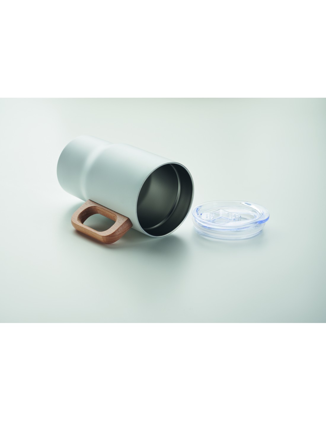 Bicchiere doppio strato in acciaio inox riciclato (90% acciaio inox riciclato e 10% acciaio inox) con manico in legno. Capacità: 350 ml.