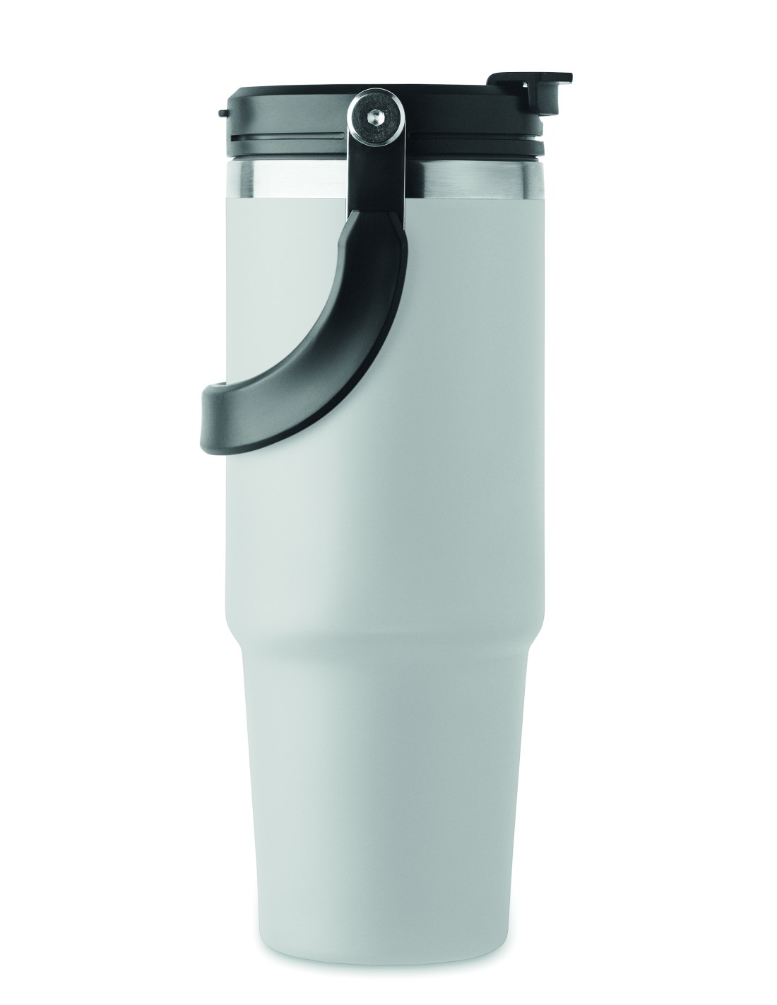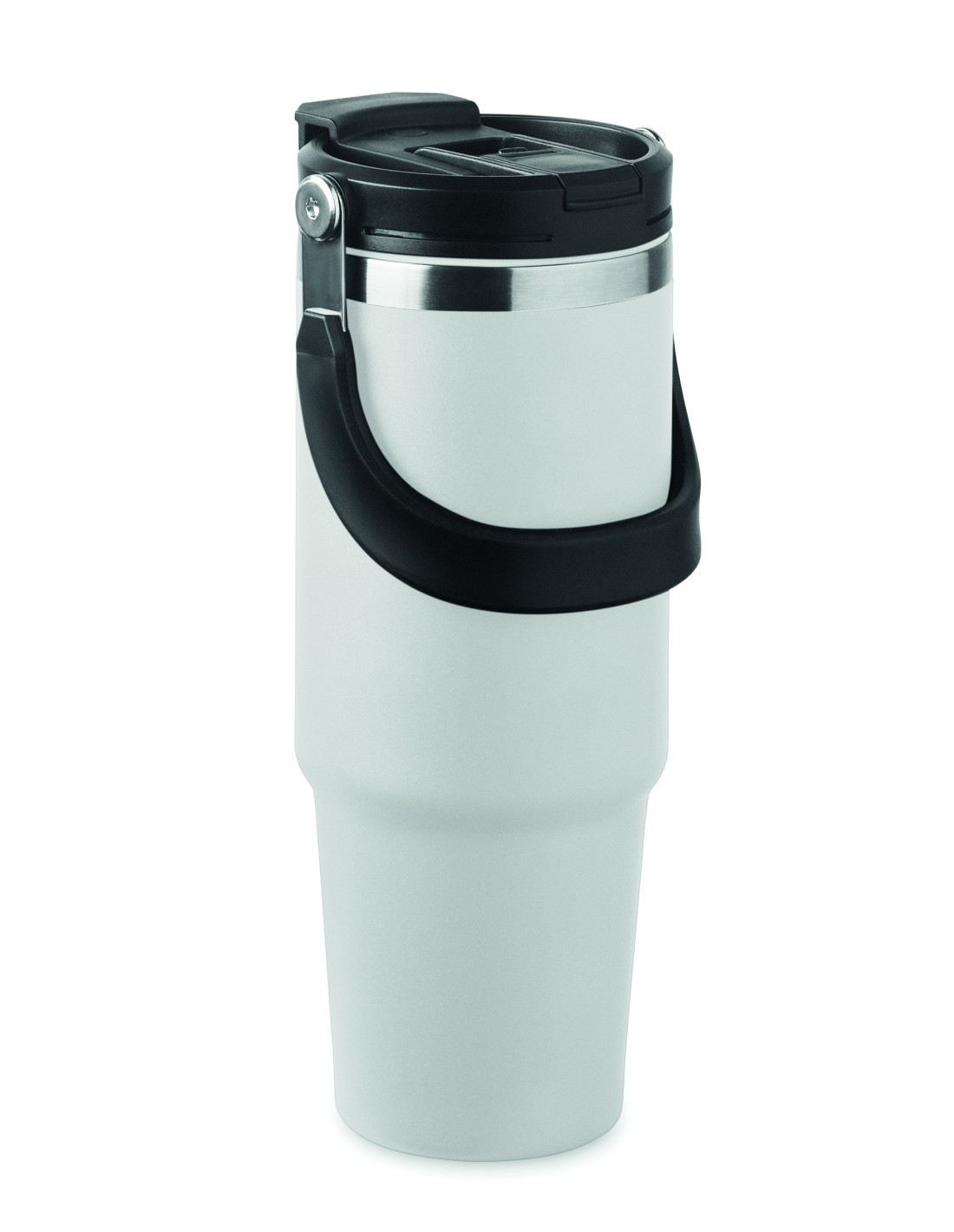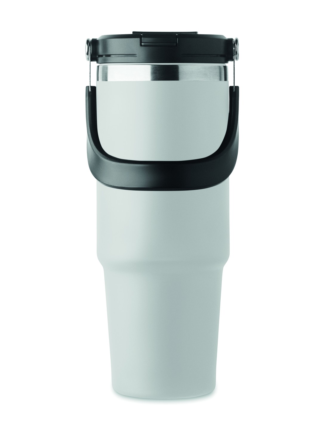 Bicchiere a doppio strato in acciaio inox riciclato (90% acciaio inox riciclato e 10% acciaio inox) con coperchio con cannuccia interna, imboccatura pieghevole e apertura per bere direttamente. Capacità 850 ml.