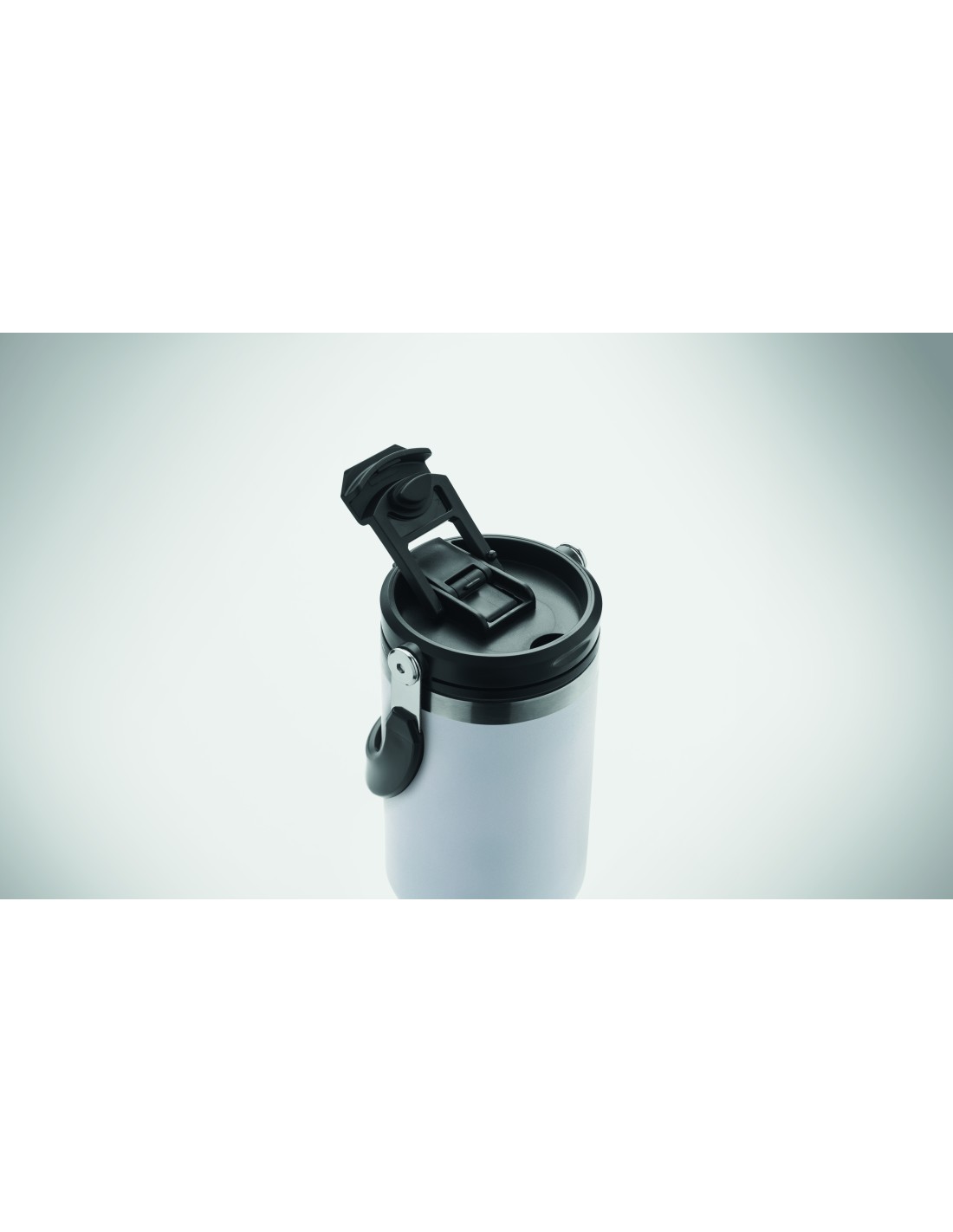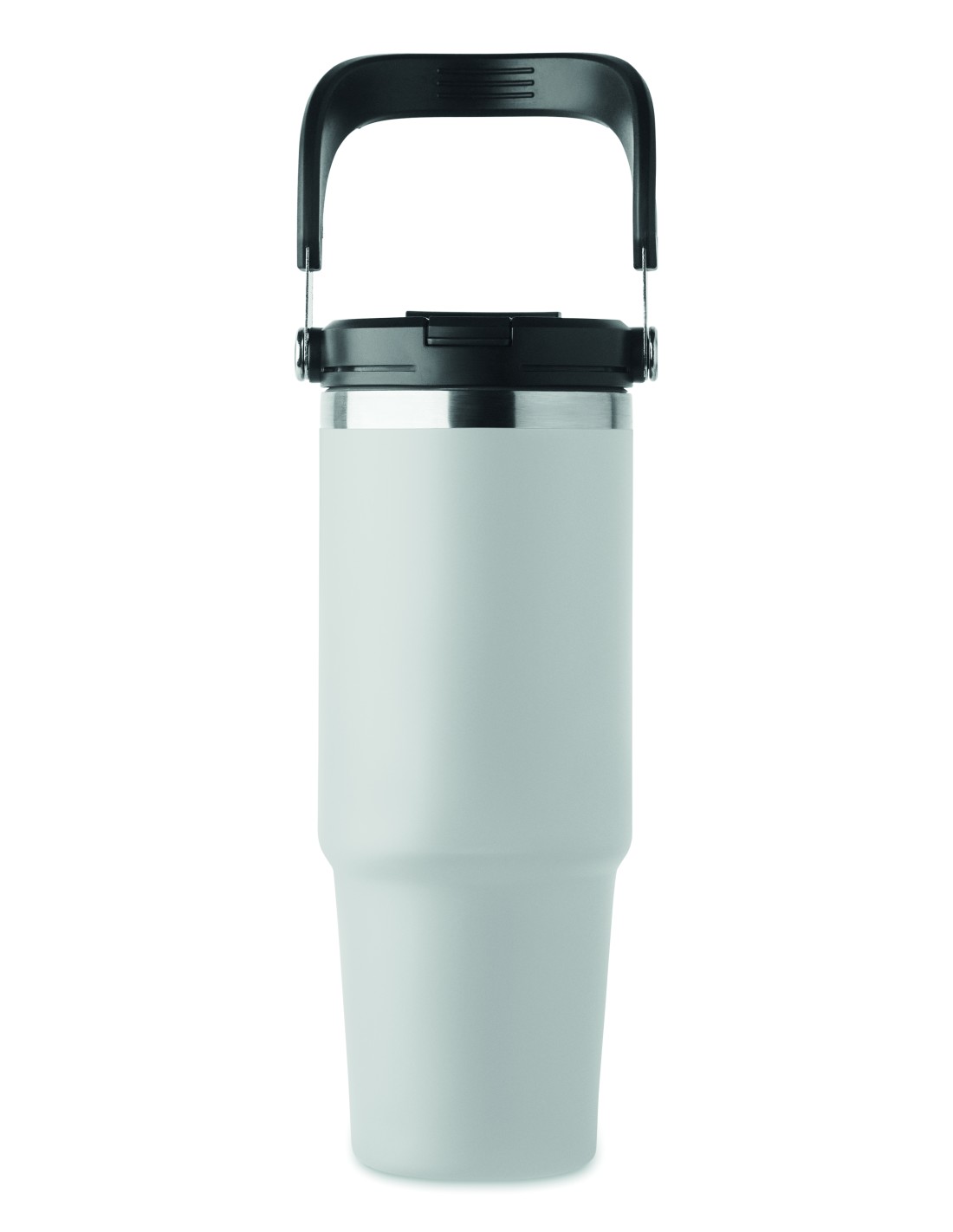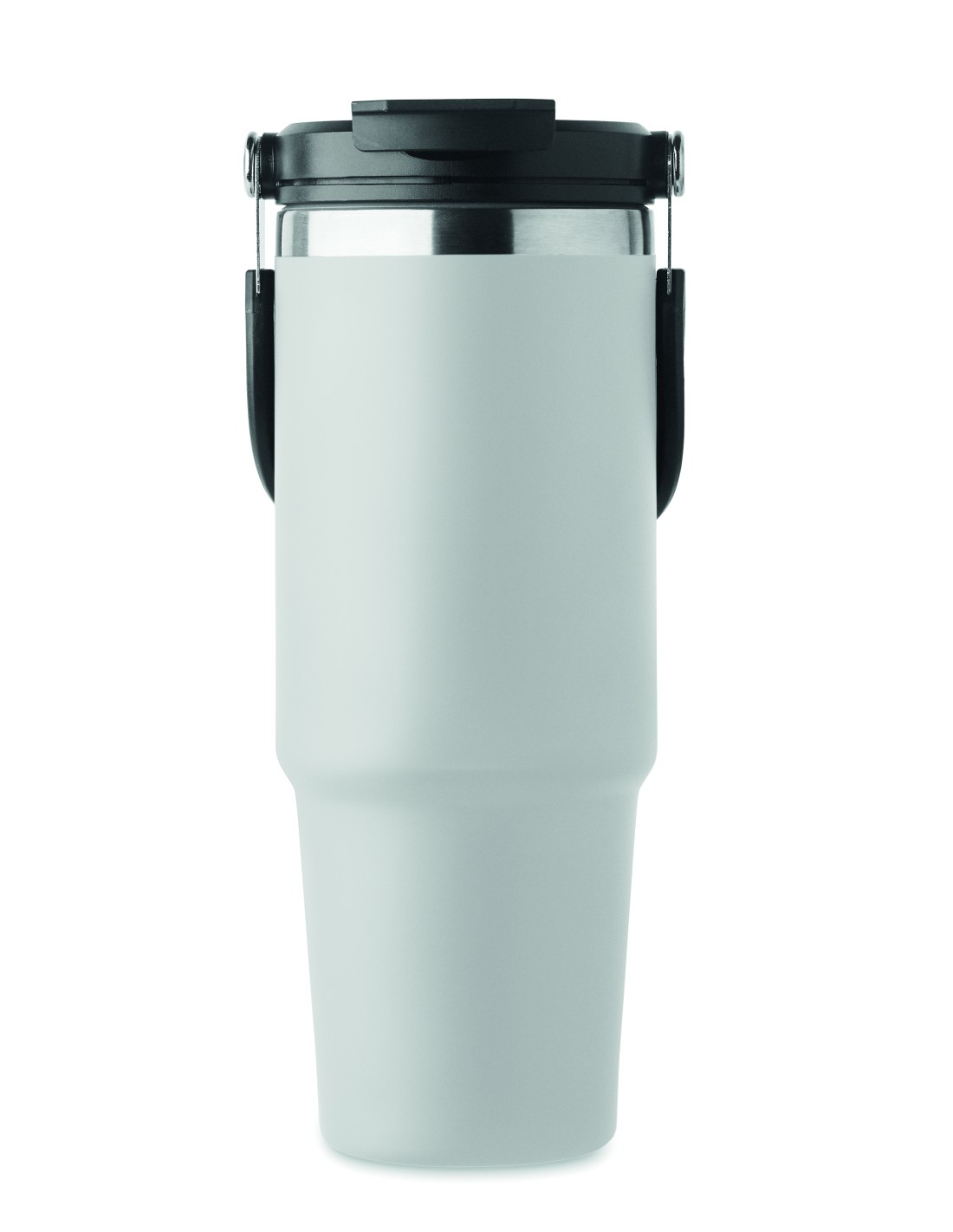 Bicchiere a doppio strato in acciaio inox riciclato (90% acciaio inox riciclato e 10% acciaio inox) con coperchio con cannuccia interna, imboccatura pieghevole e apertura per bere direttamente. Capacità 850 ml.